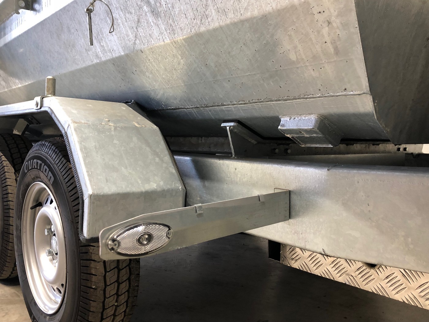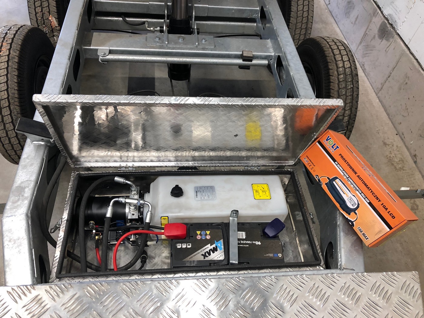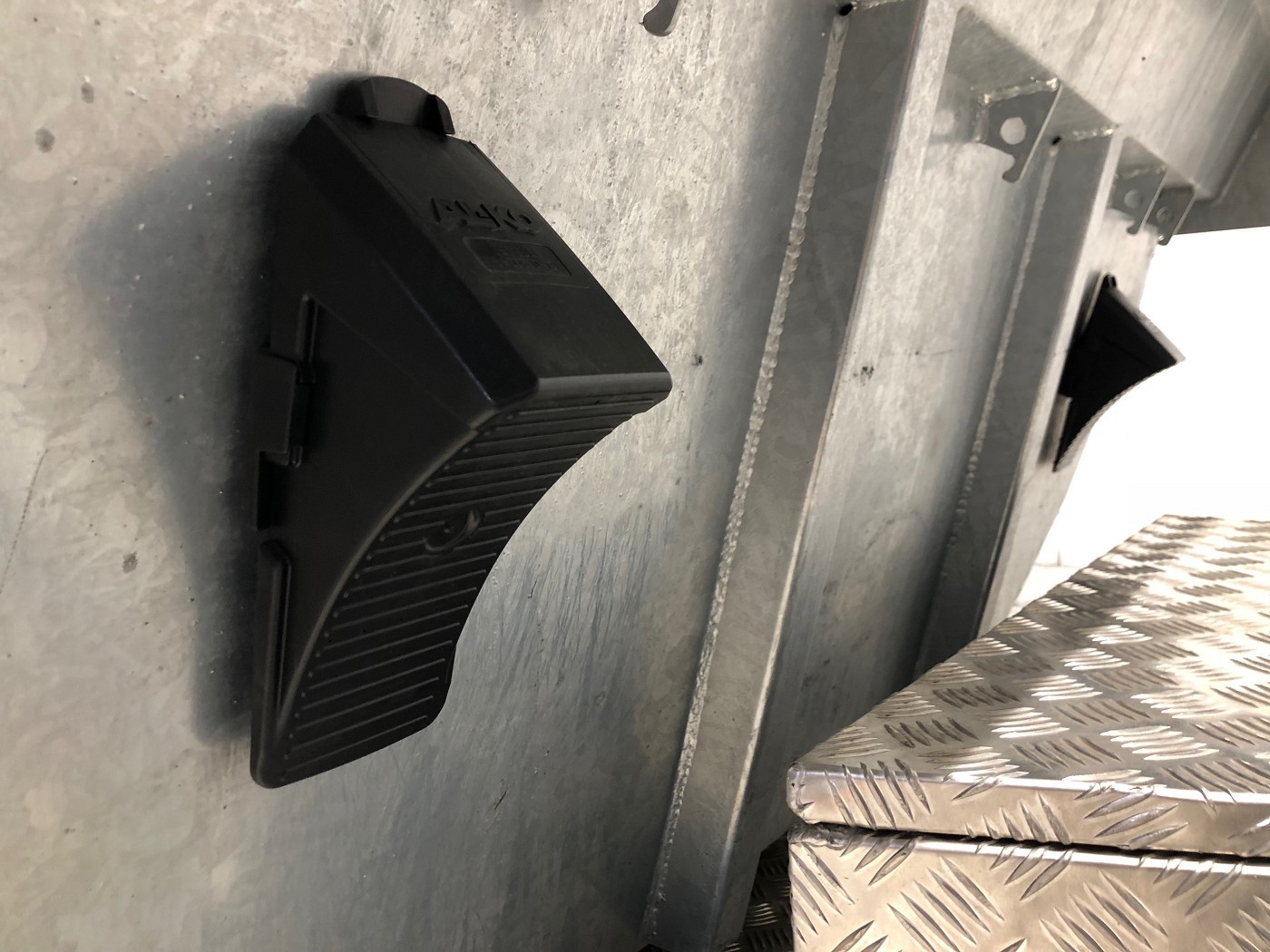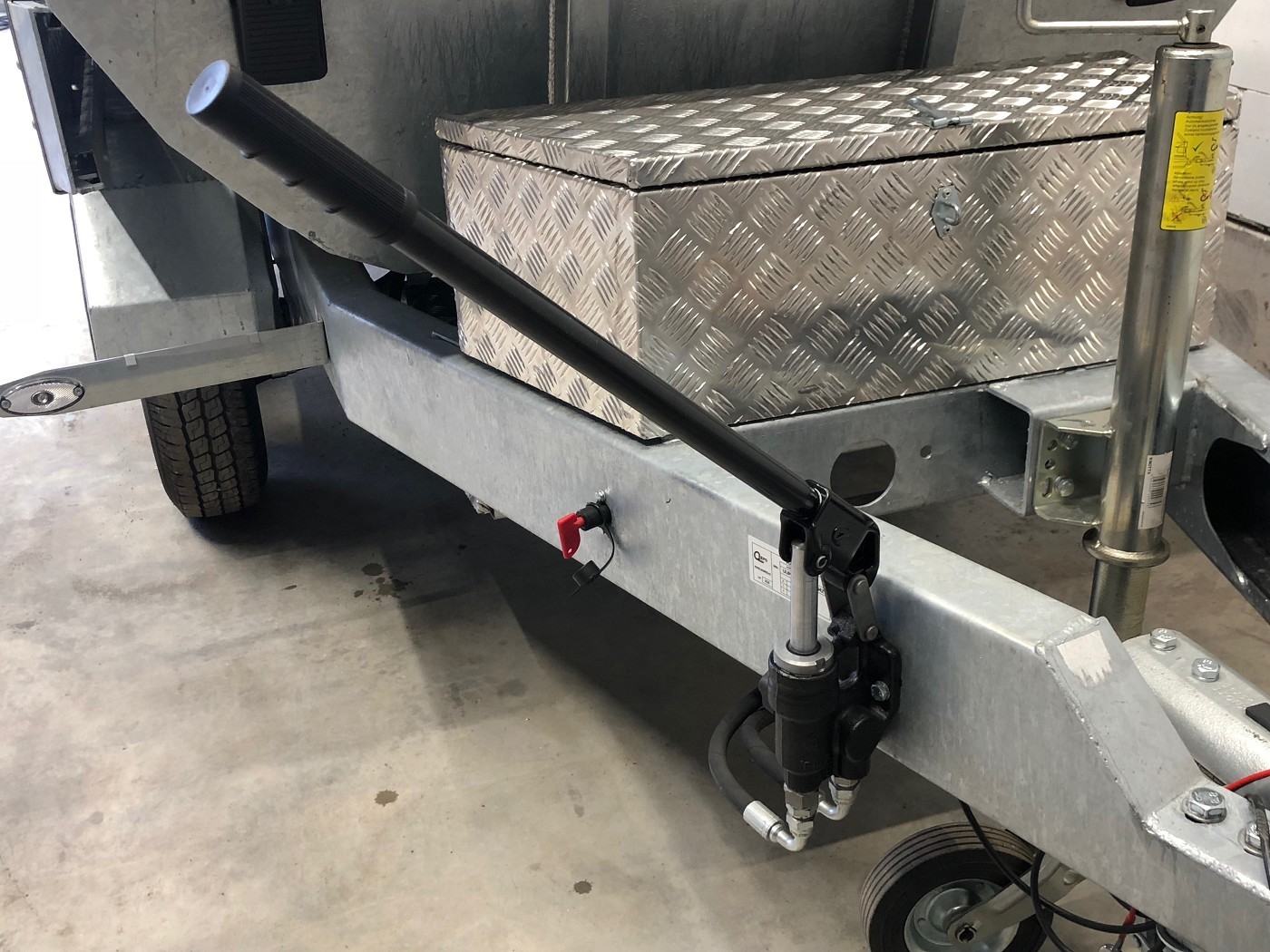 • Werkzeugbox aus Alu-Riffelblech auf der Deichsel montiert