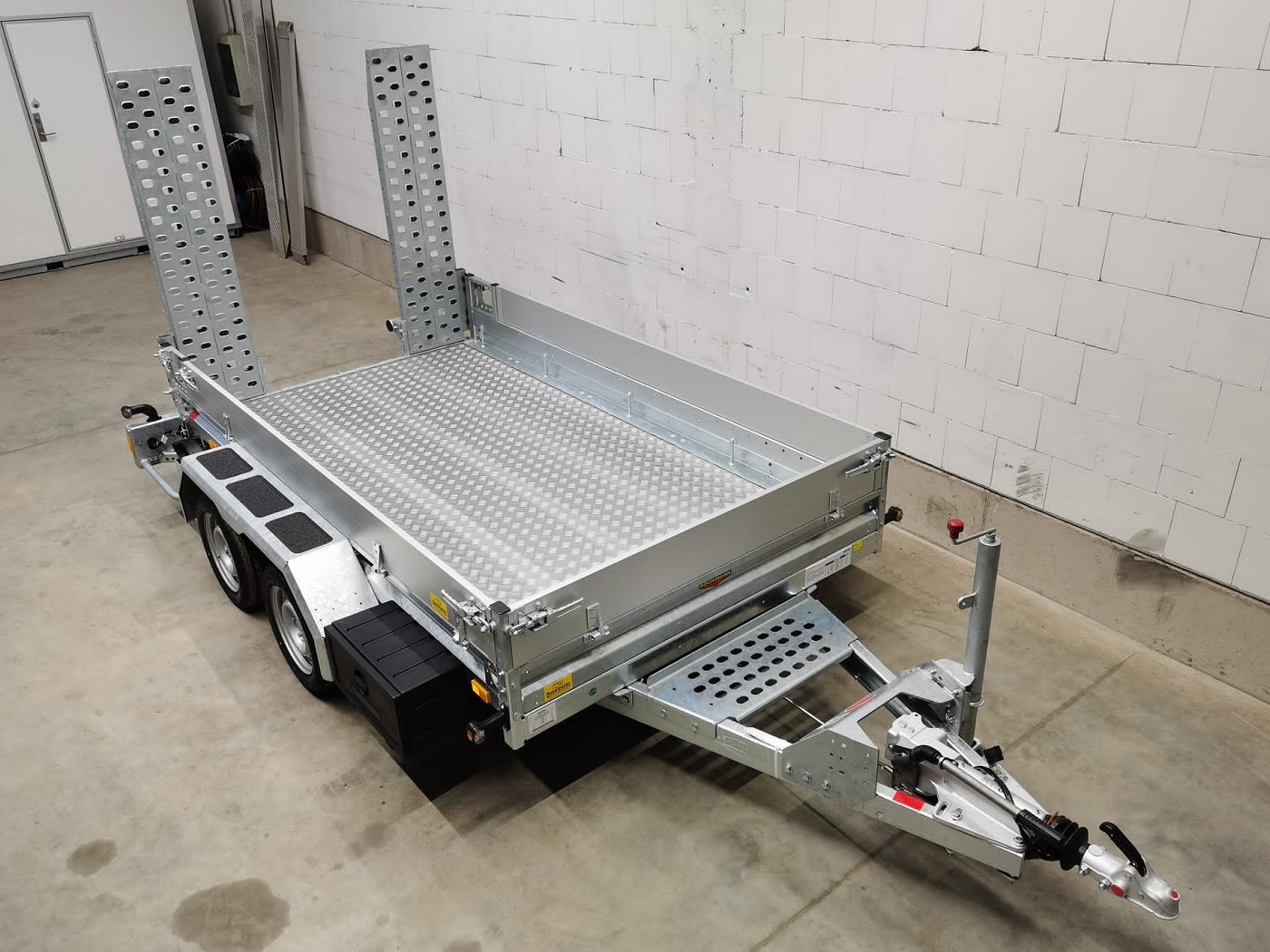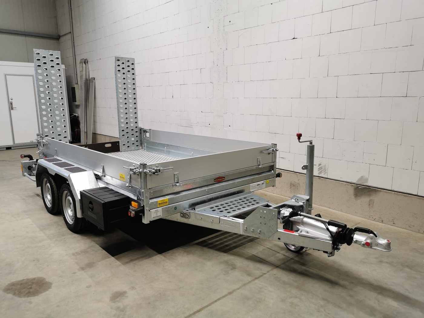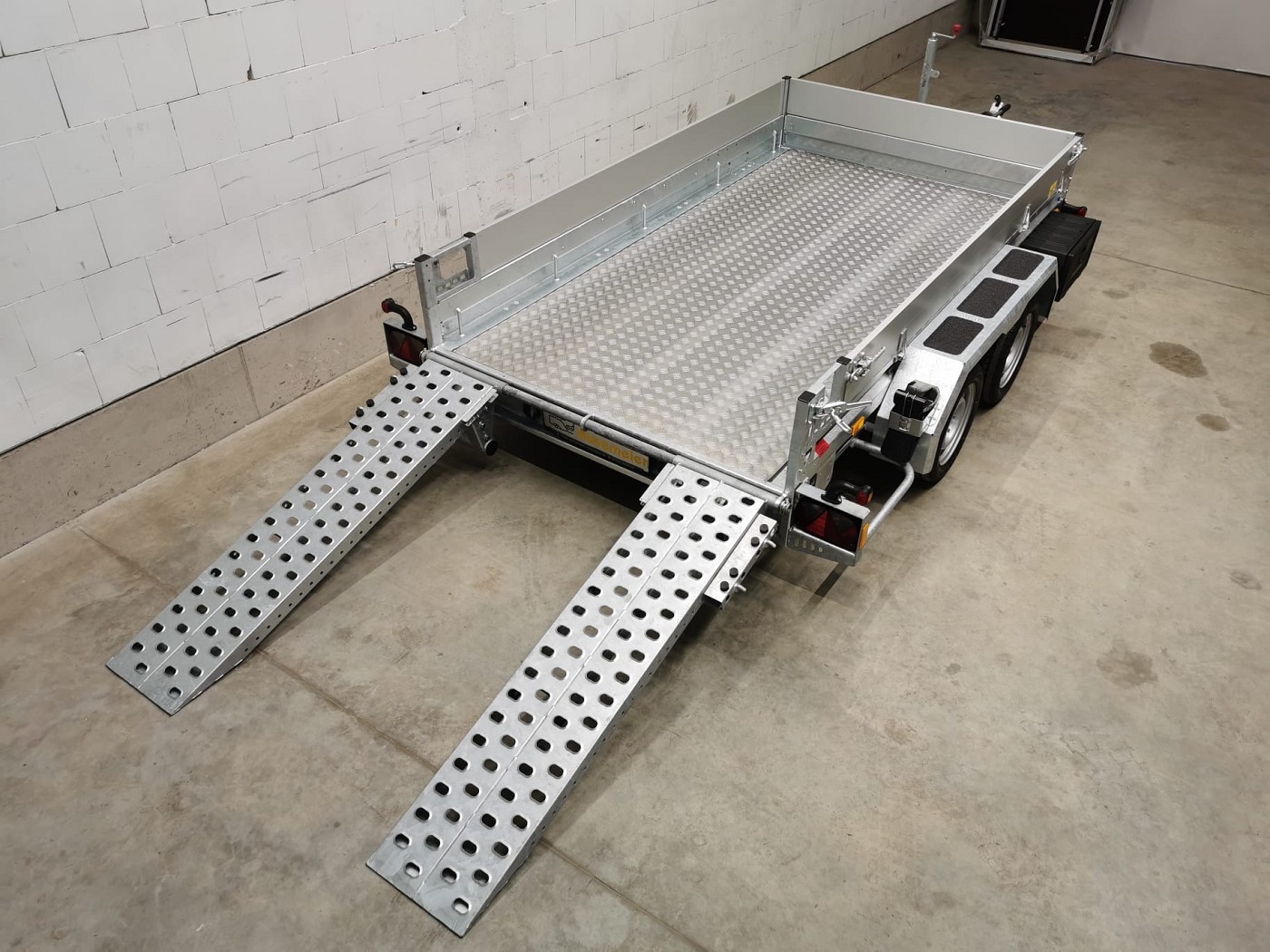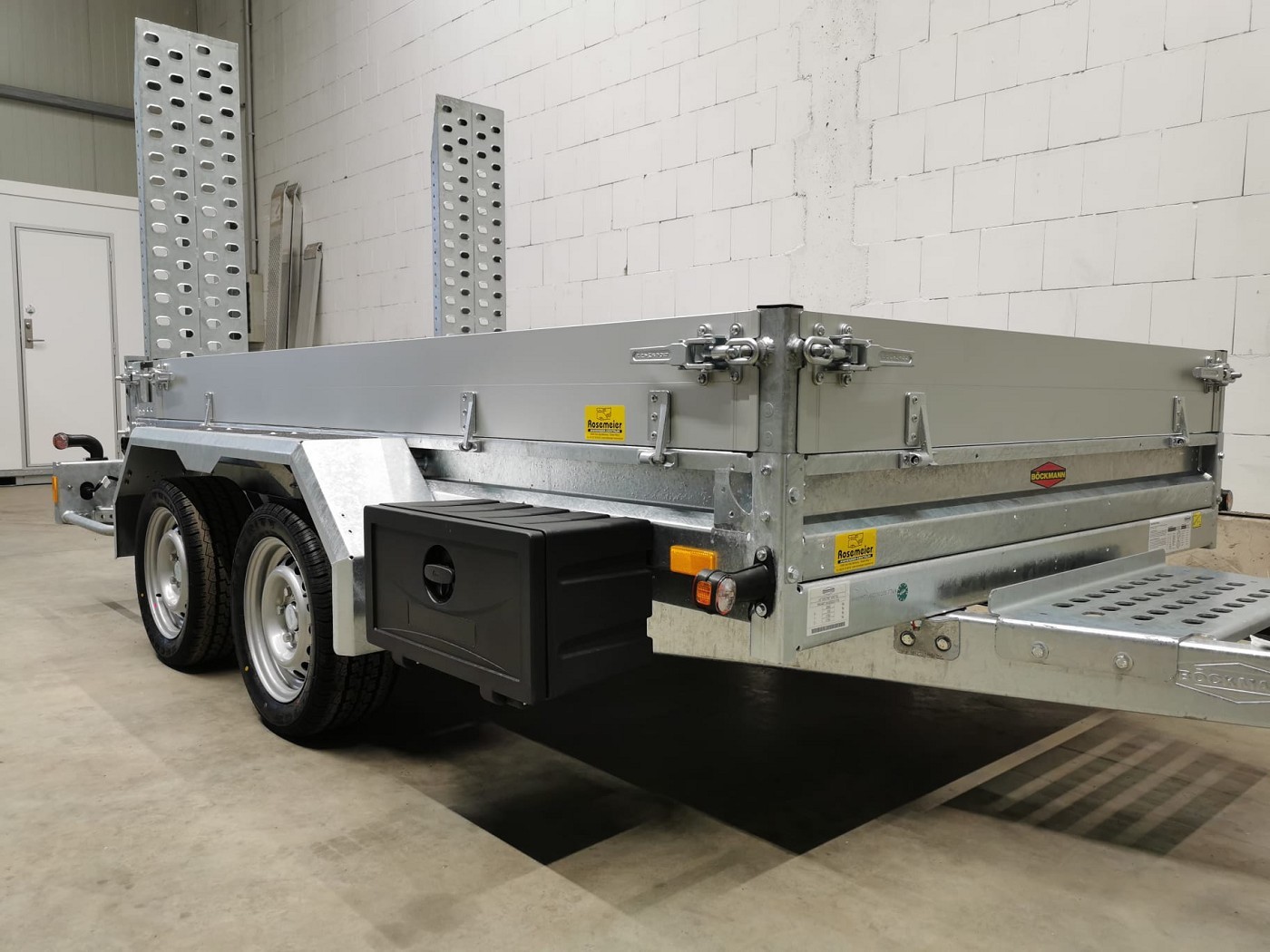 Böckmann Baumaschinentransporter mit Bordwandaufsatz, Baggerlöffelablage, Staukiste und Alu-Riffelblech-Boden