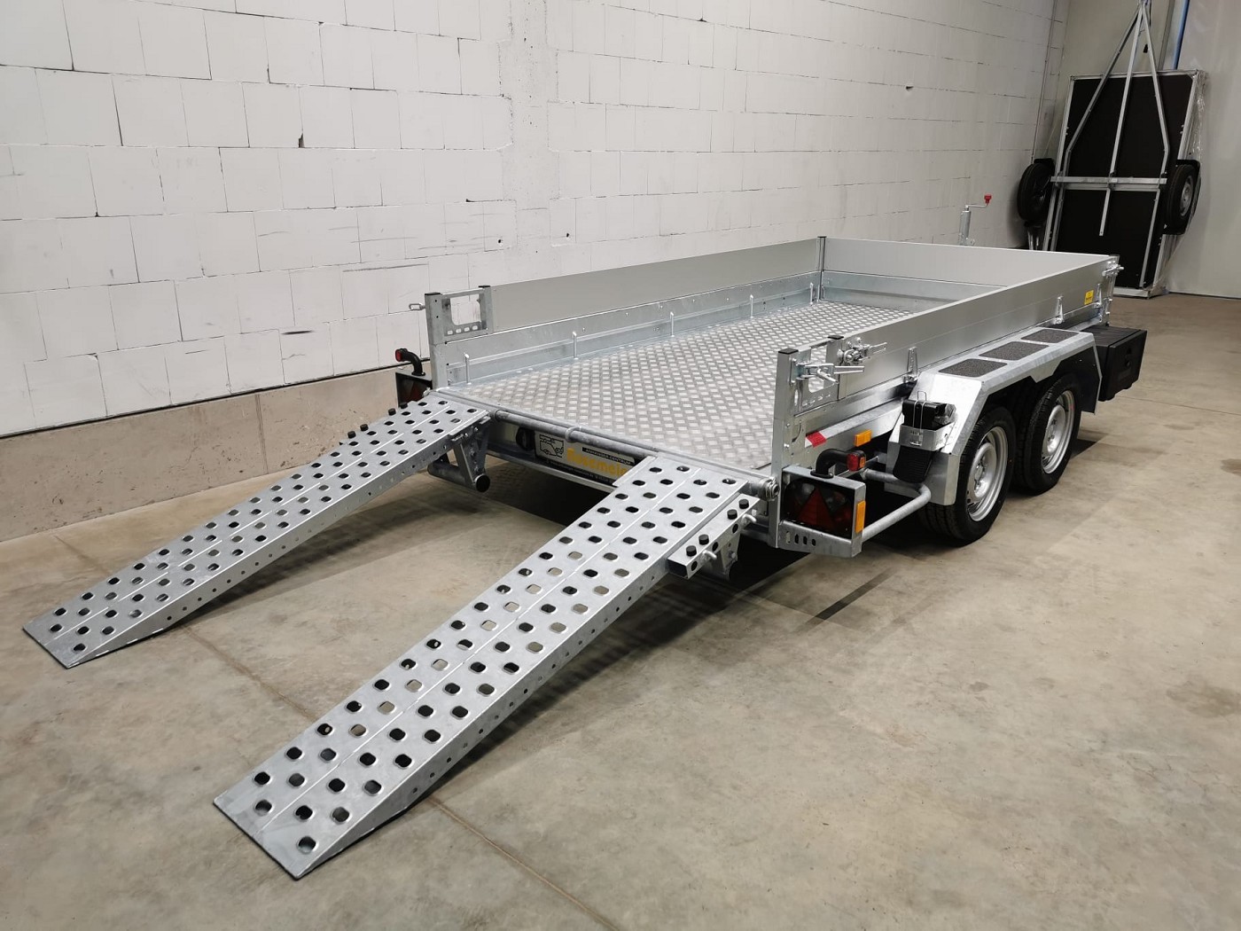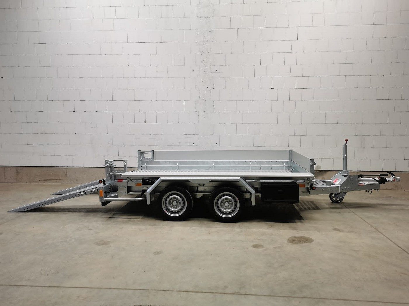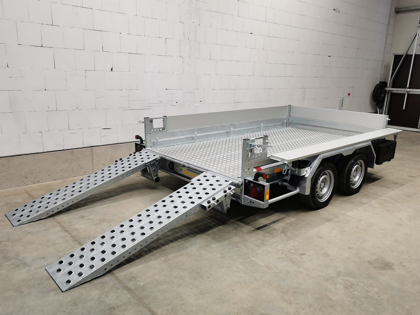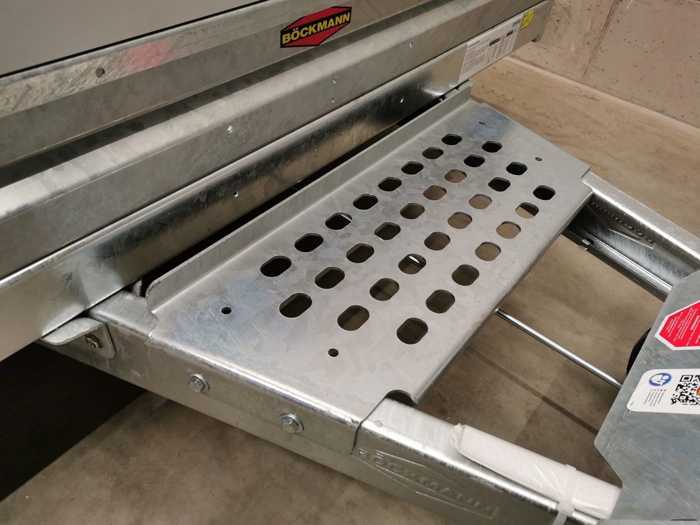 Böckmann Baumaschinentransporter mit Bordwandaufsatz, Baggerlöffelablage, Staukiste und Alu-Riffelblech-Boden