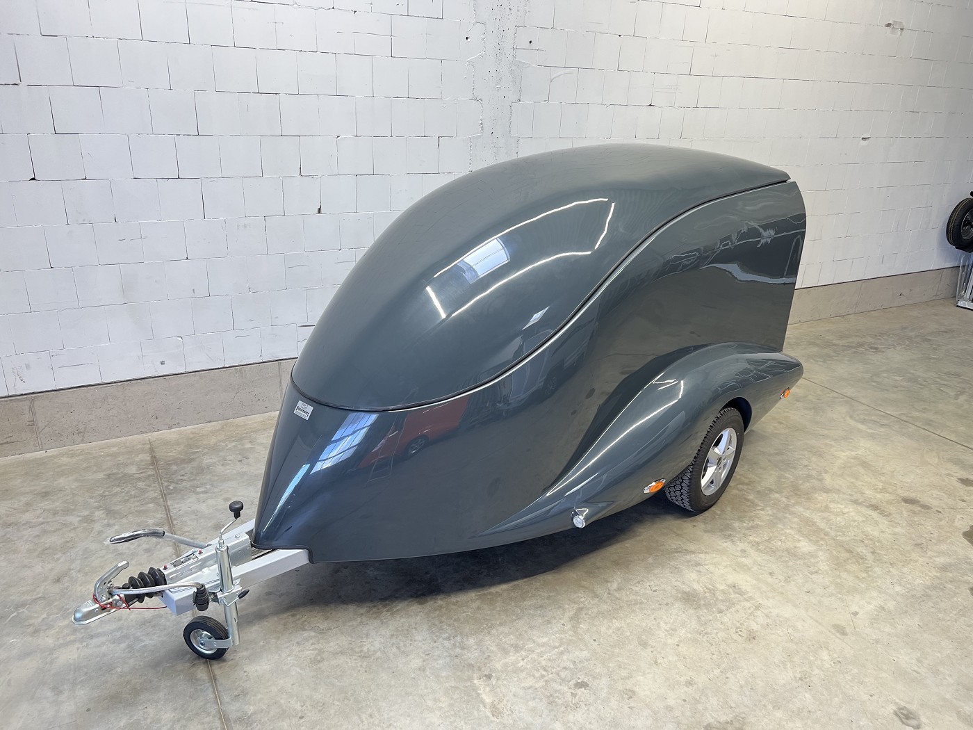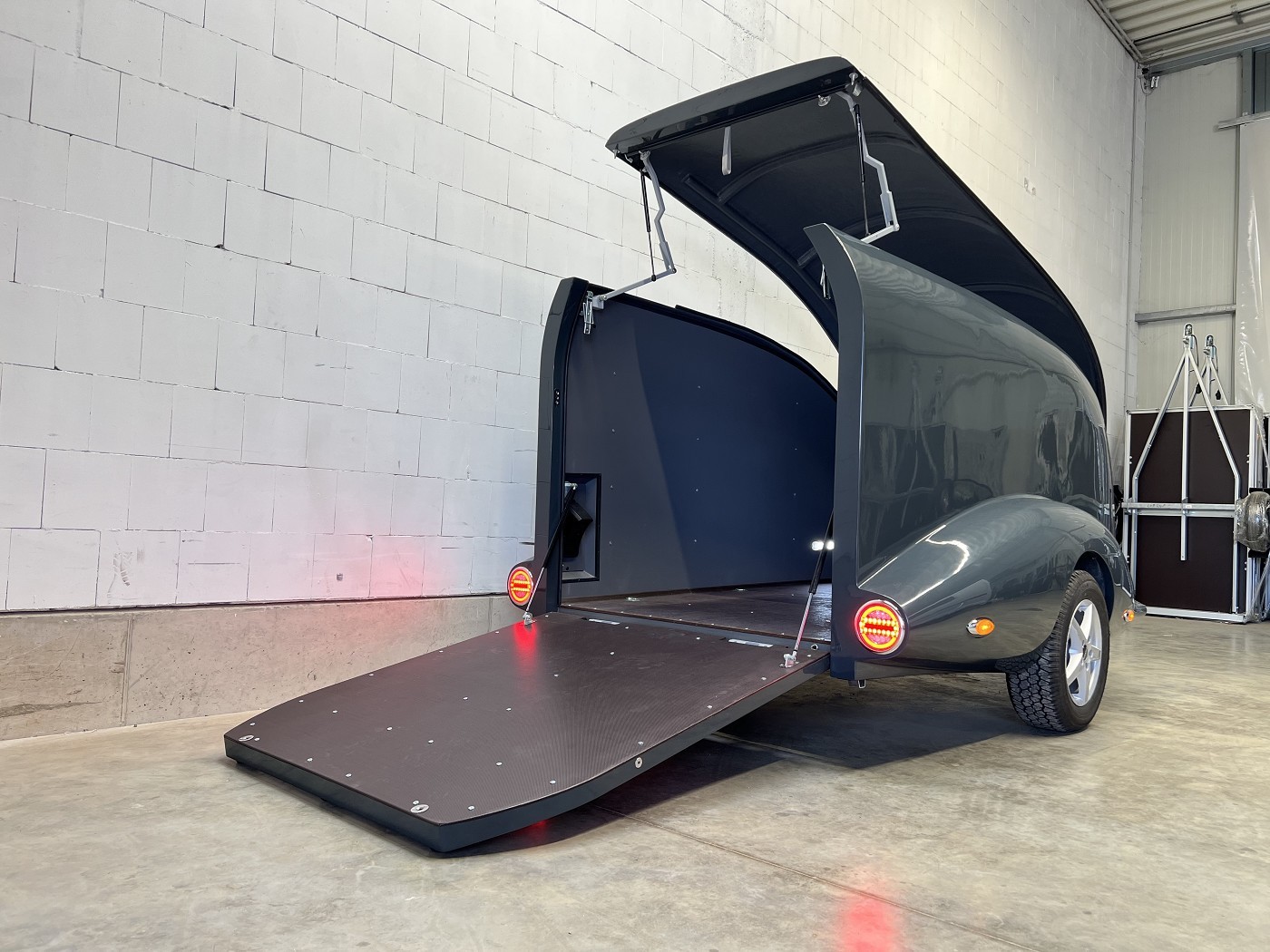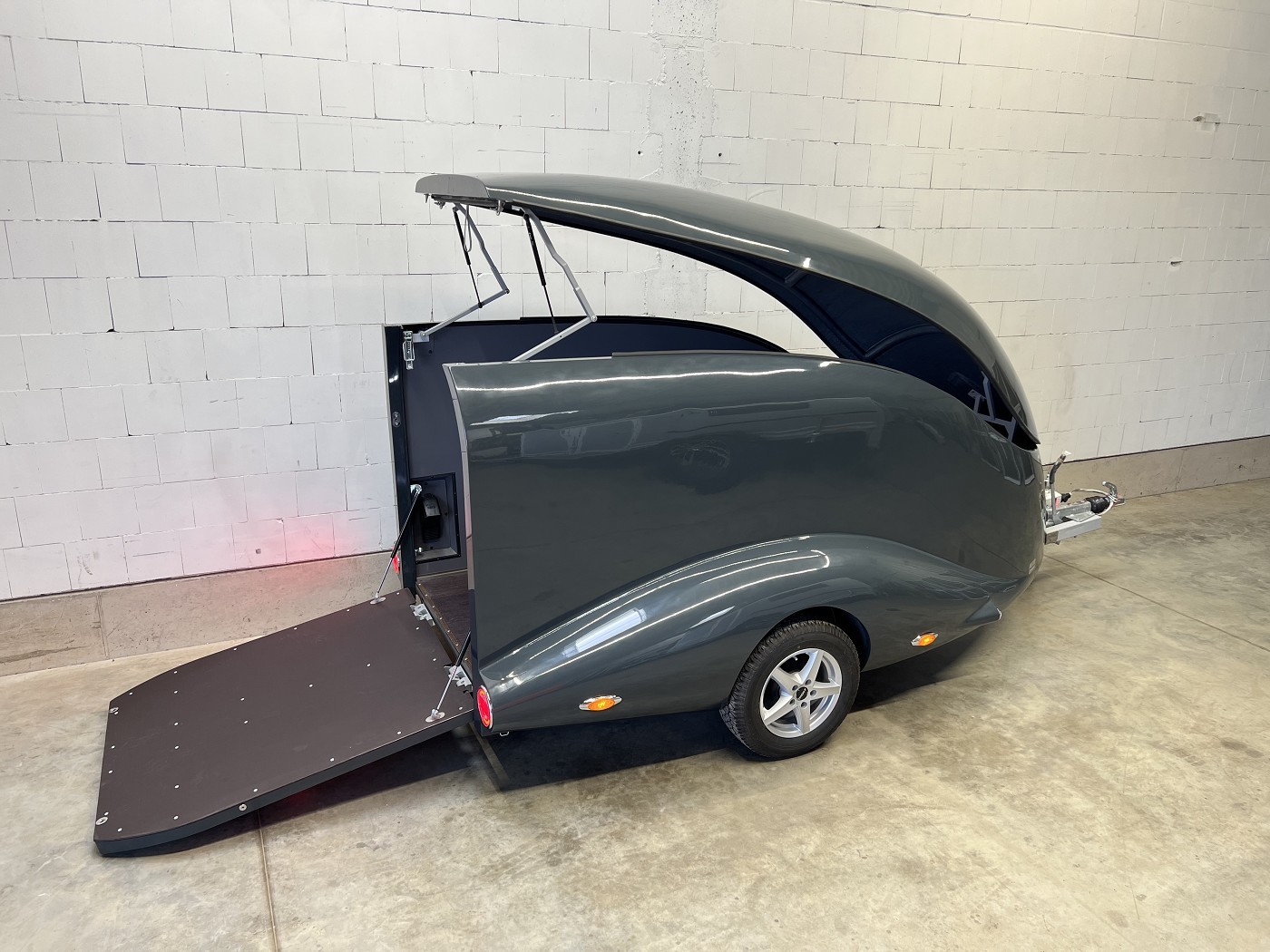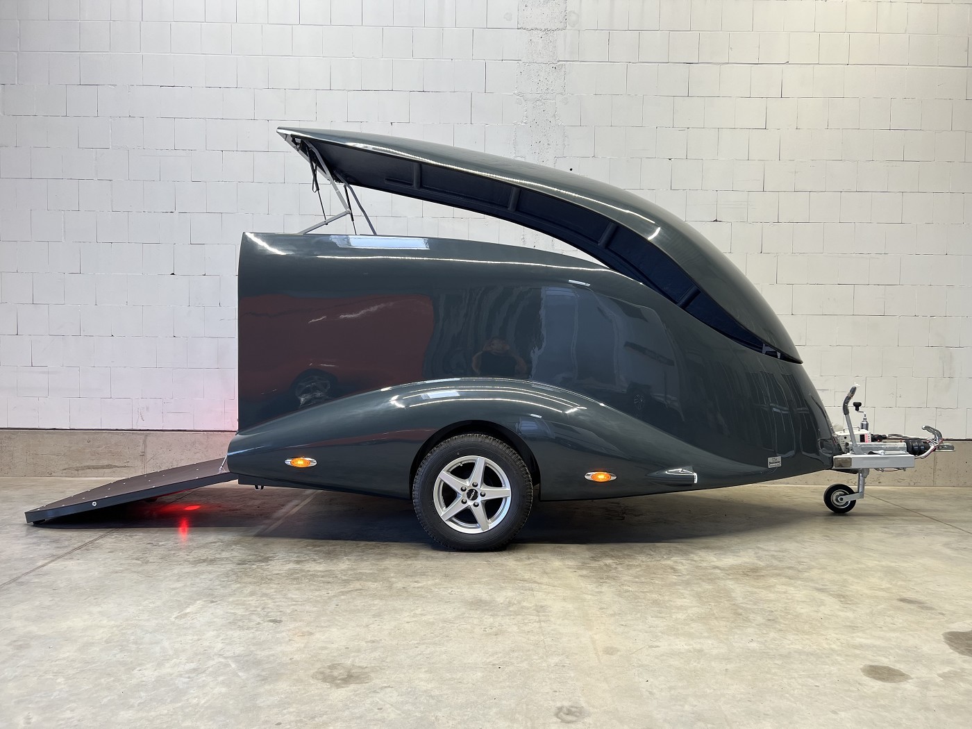 Stylischer Motoradanhänger in aerodynamischem Design mit aufstellbarem Dach