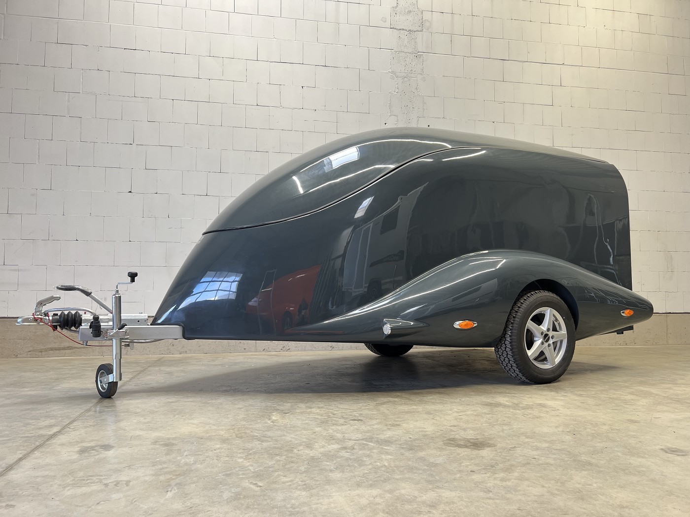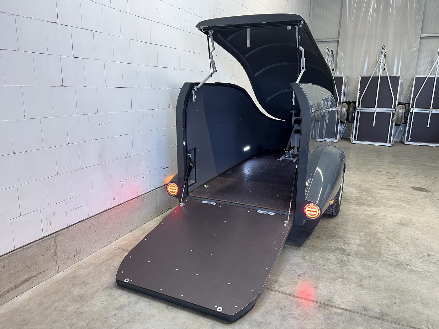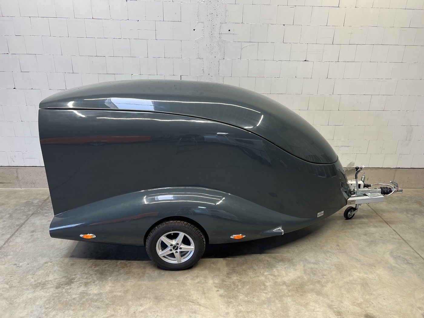 Stylischer Motoradanhänger in aerodynamischem Design mit aufstellbarem Dach