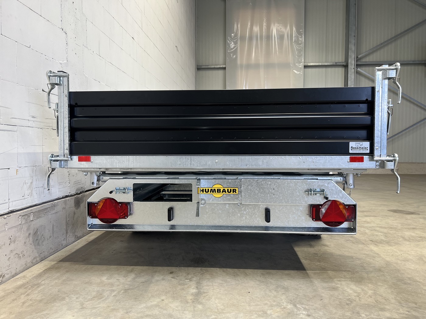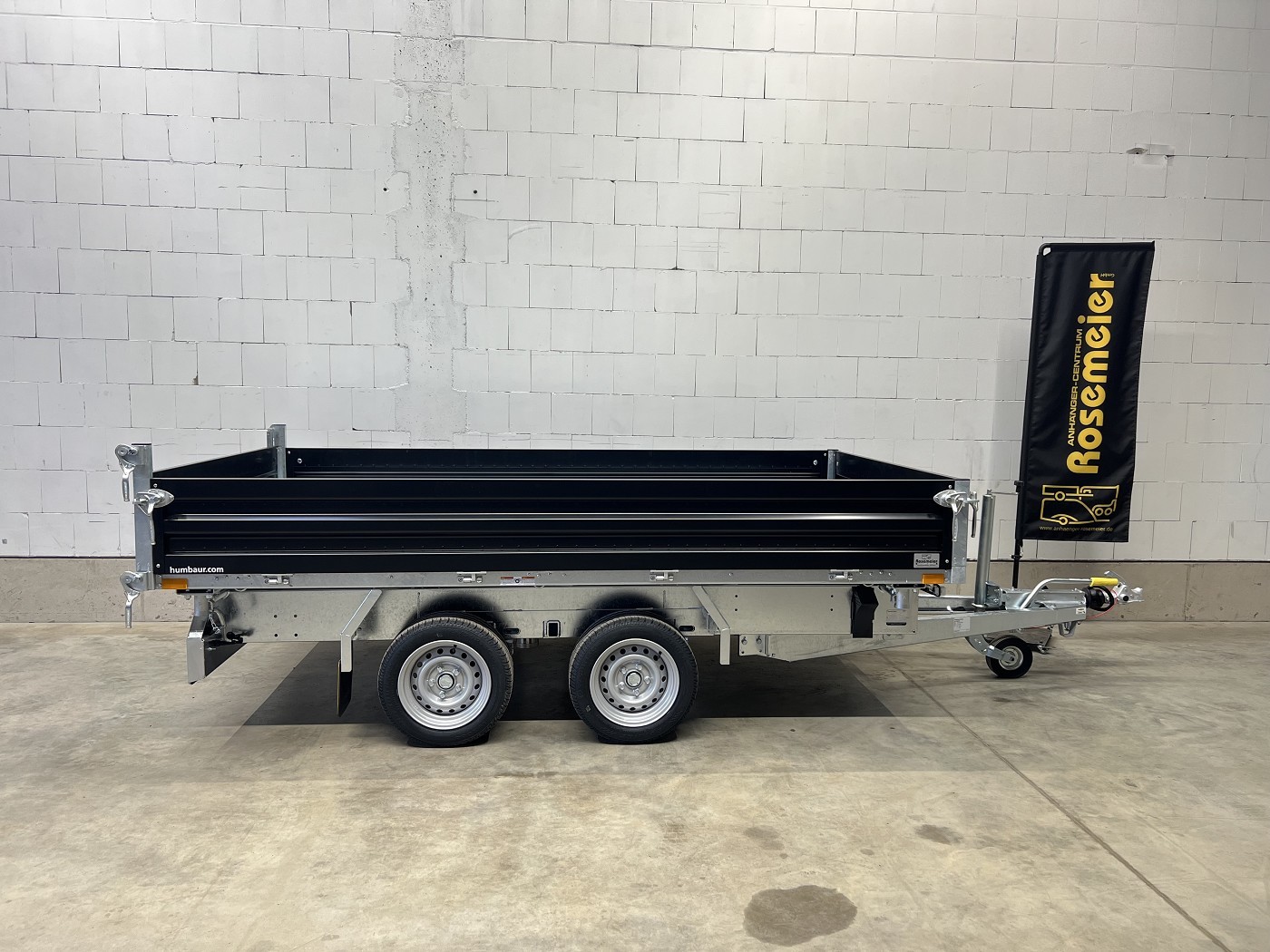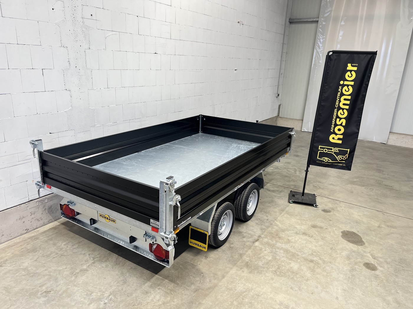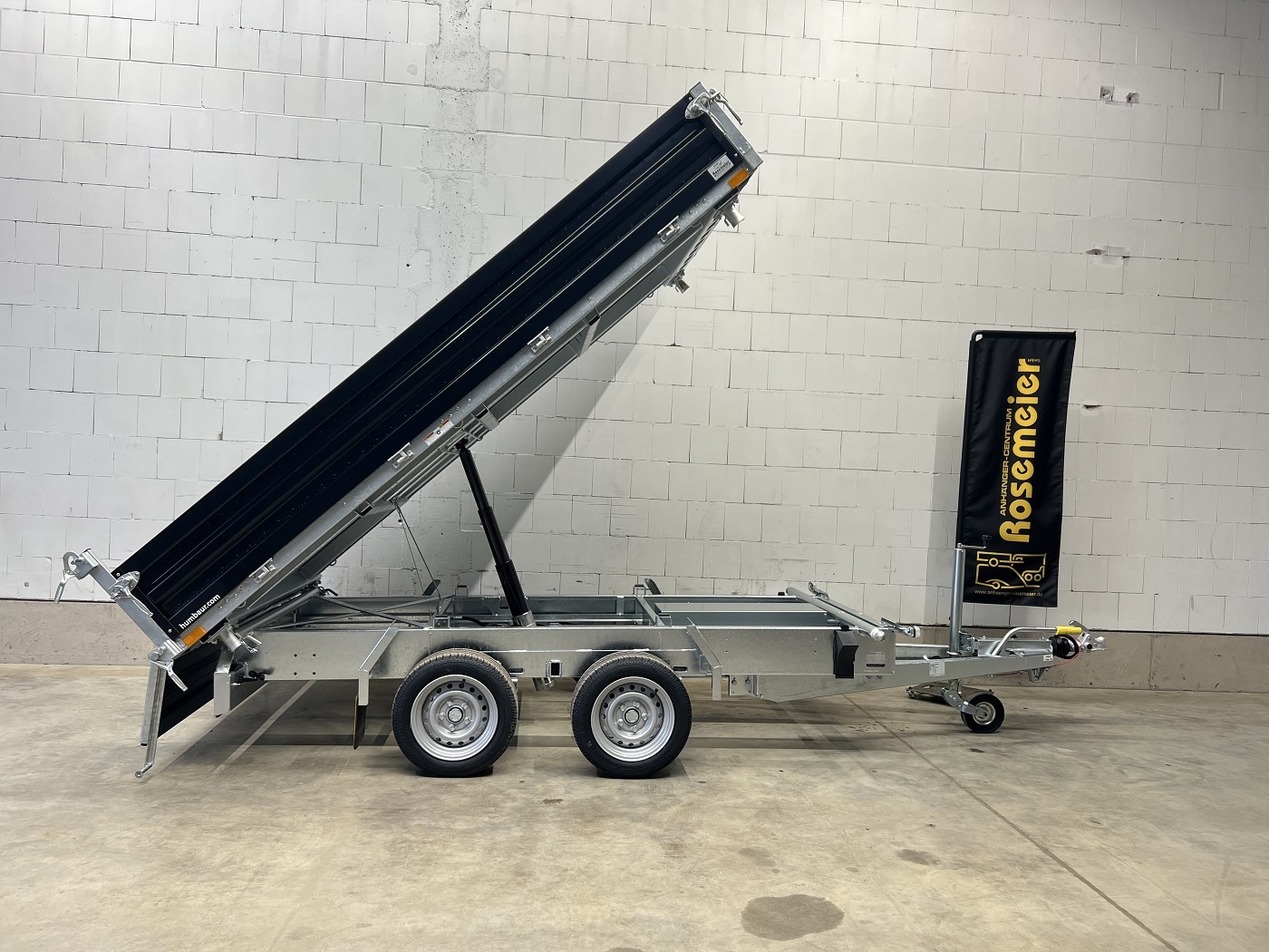 Humbaur Dreiseitenkipper mit E-Pumpe und schwarzen Stahlbordwänden