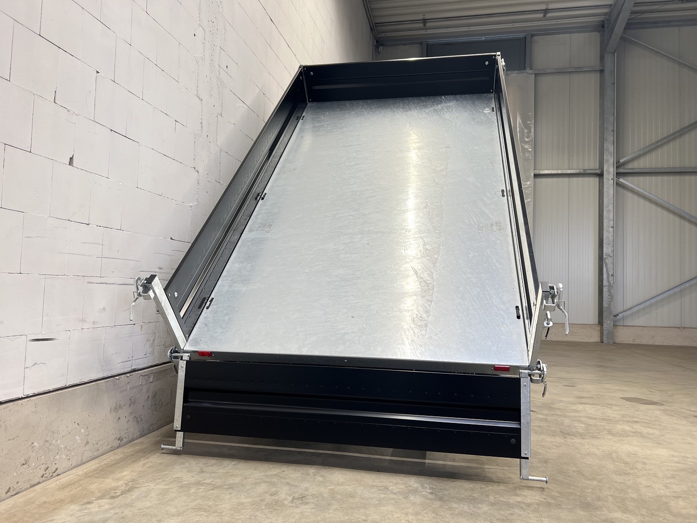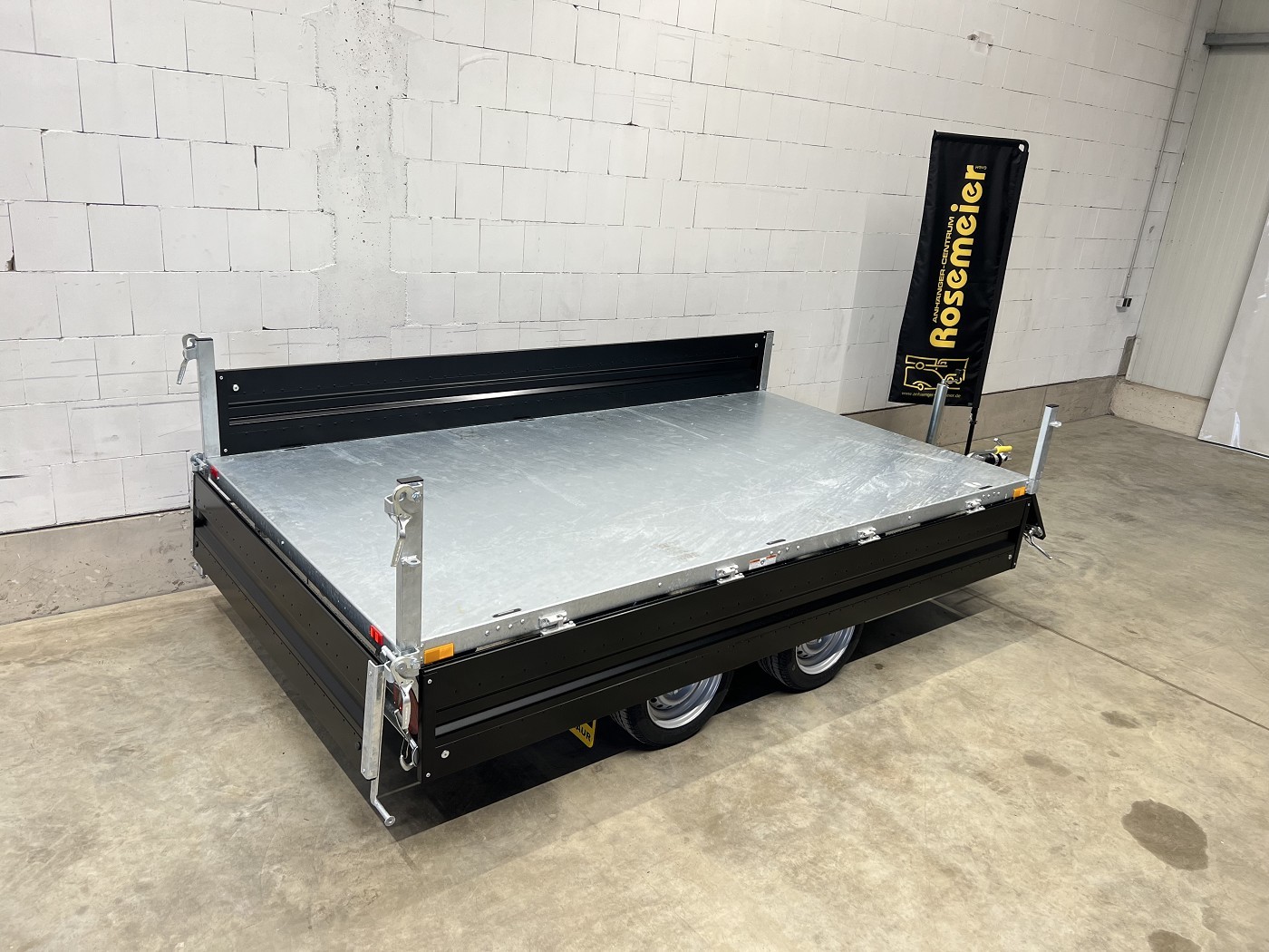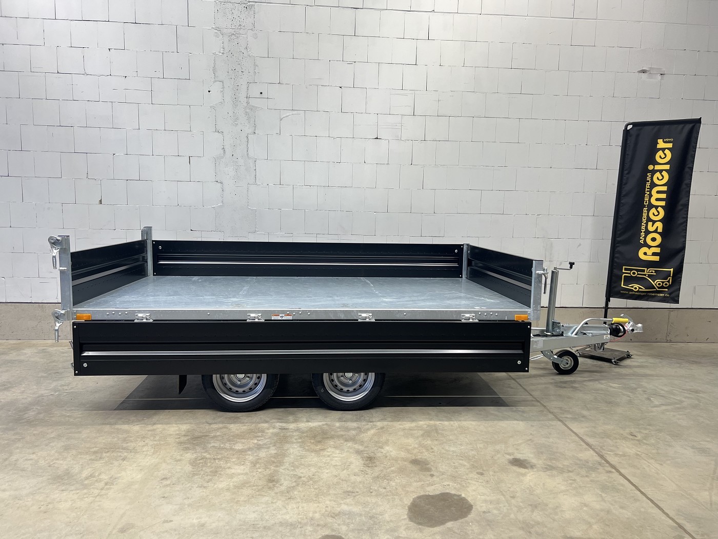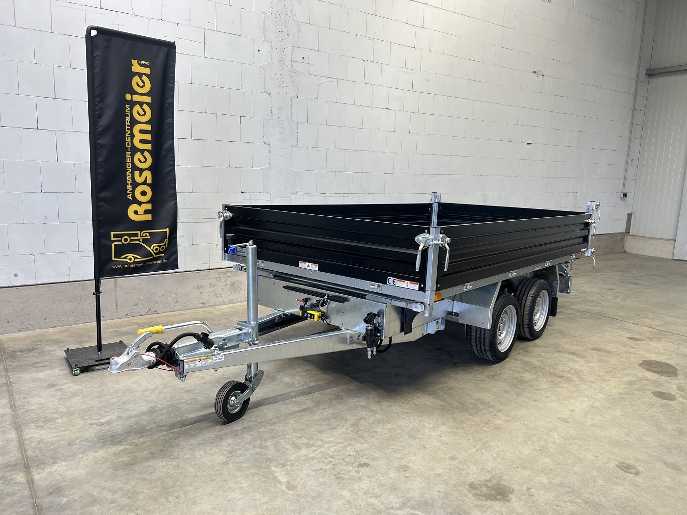 Humbaur Dreiseitenkipper mit E-Pumpe und schwarzen Stahlbordwänden