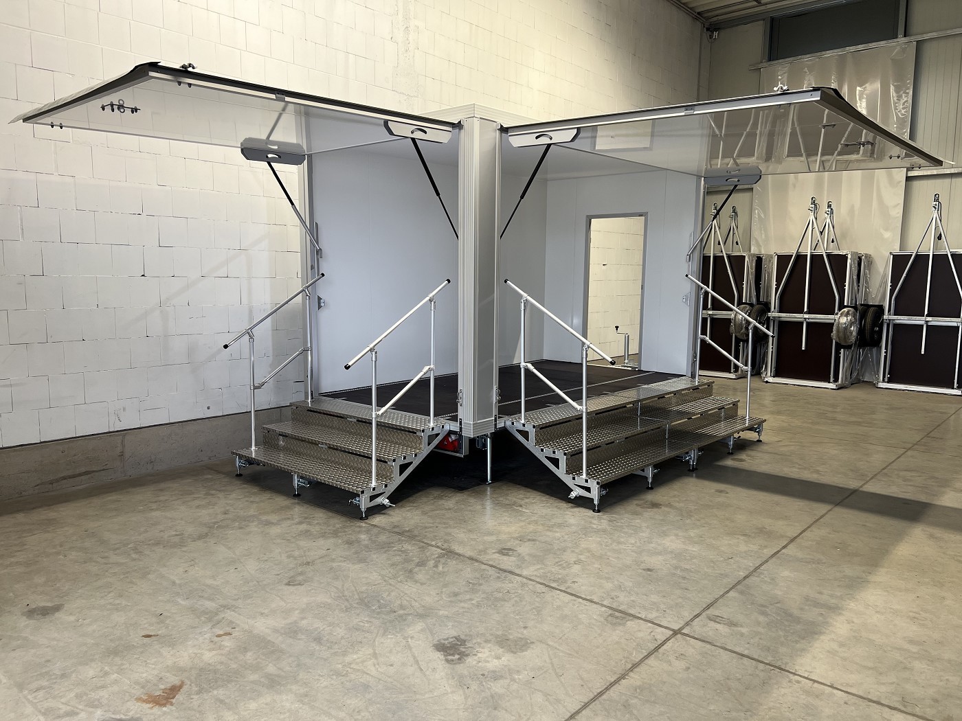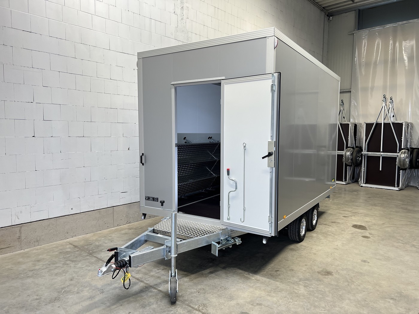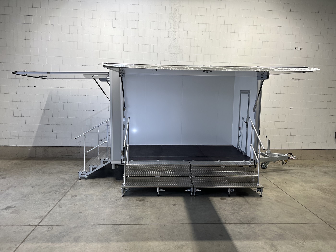 Promotionanhänger mit 2 Verkaufsklappen, 2 Treppen und zusätzlicher Eingangstür auf der Deichsel