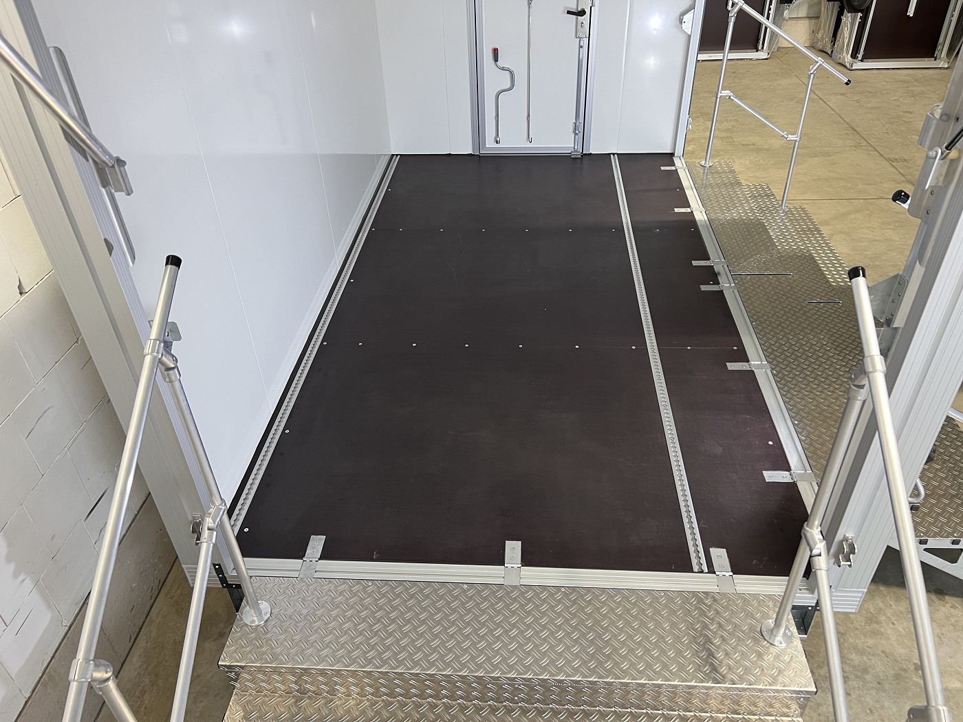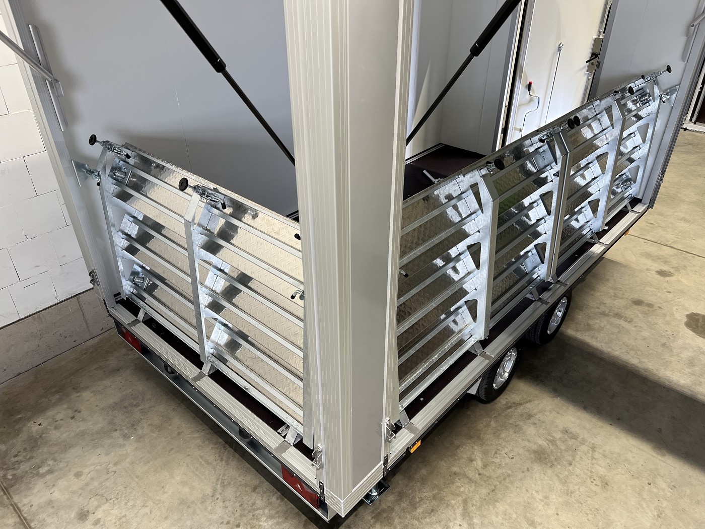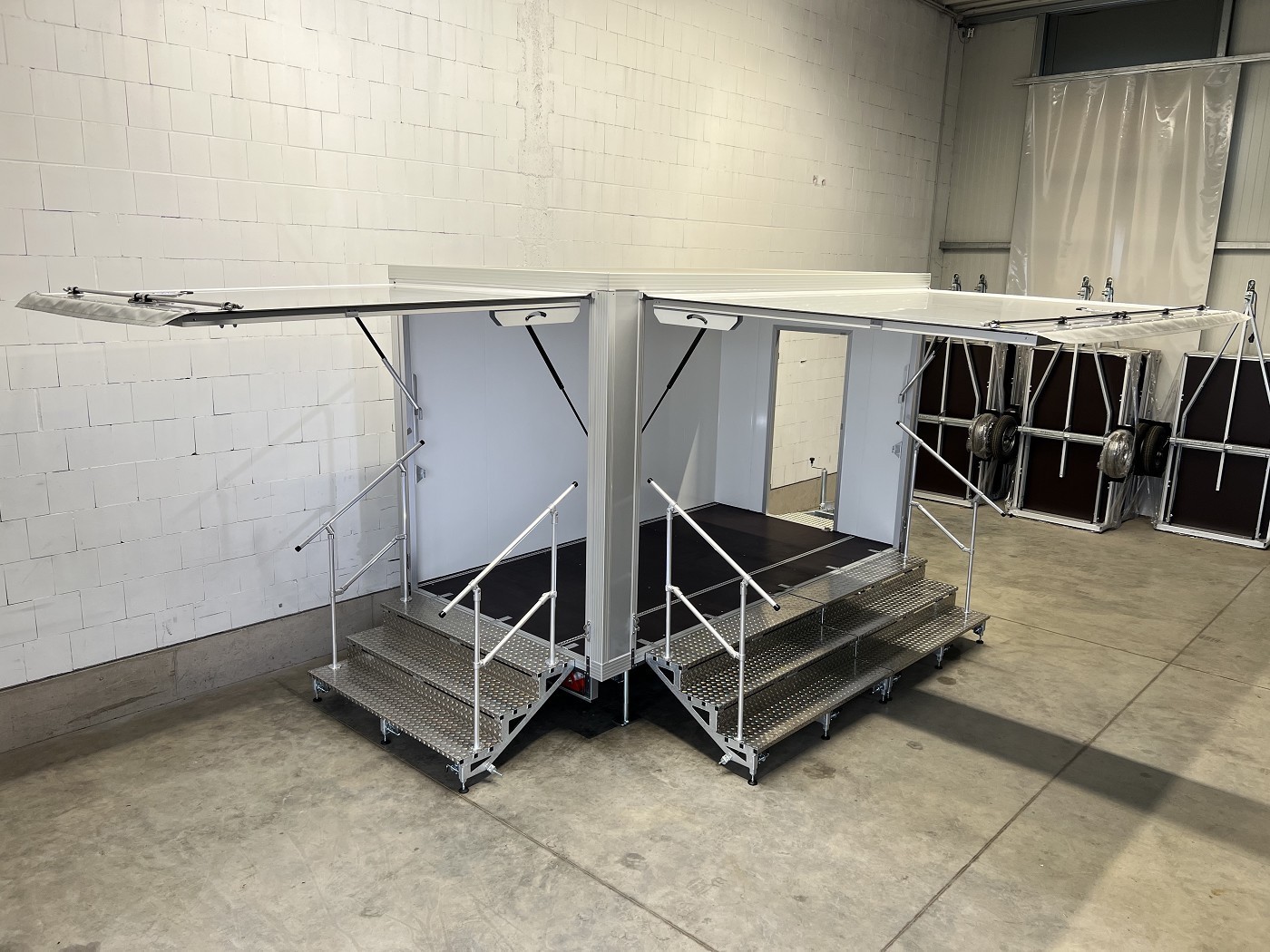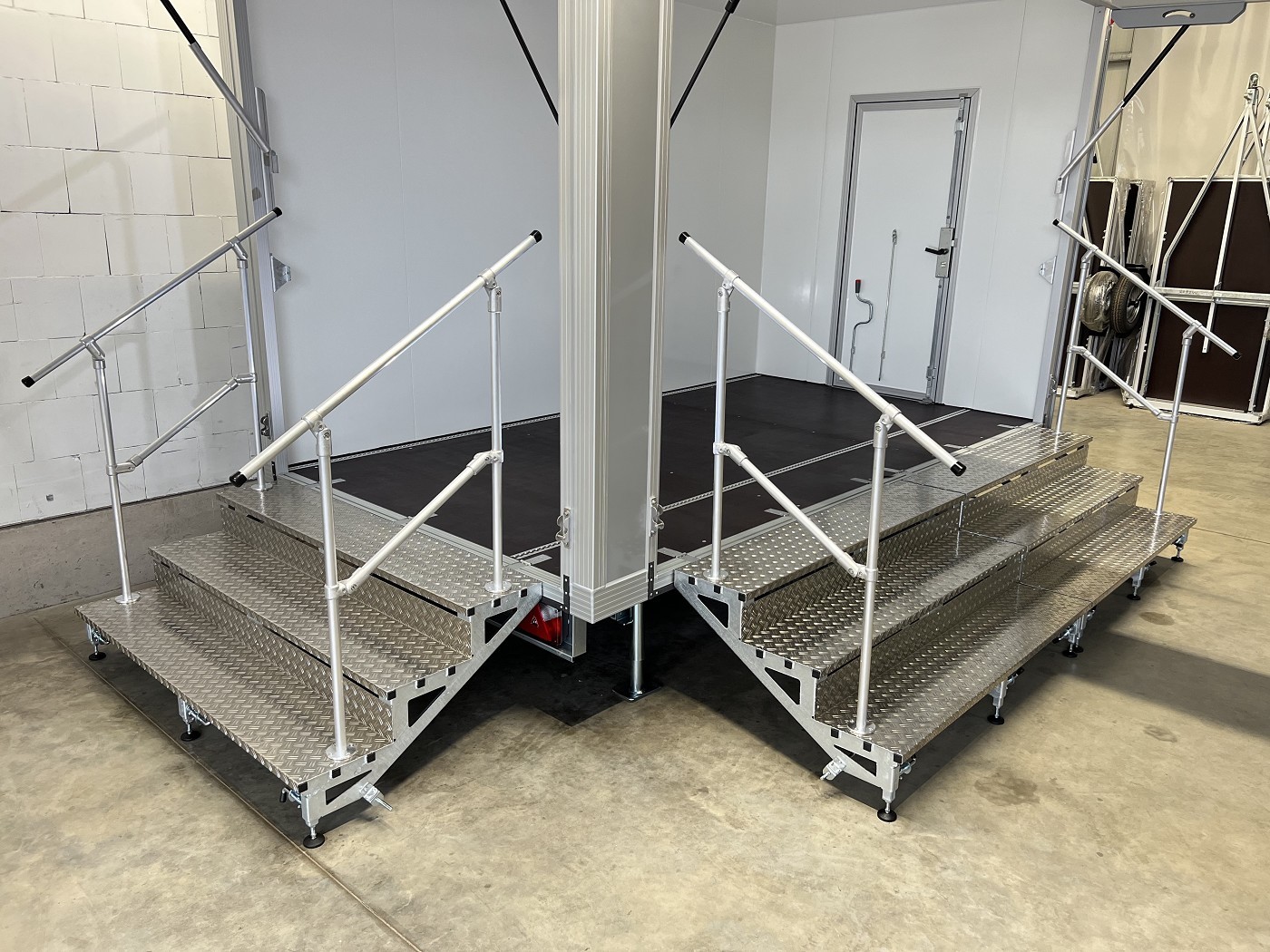 Promotionanhänger mit 2 Verkaufsklappen, 2 Treppen und zusätzlicher Eingangstür auf der Deichsel