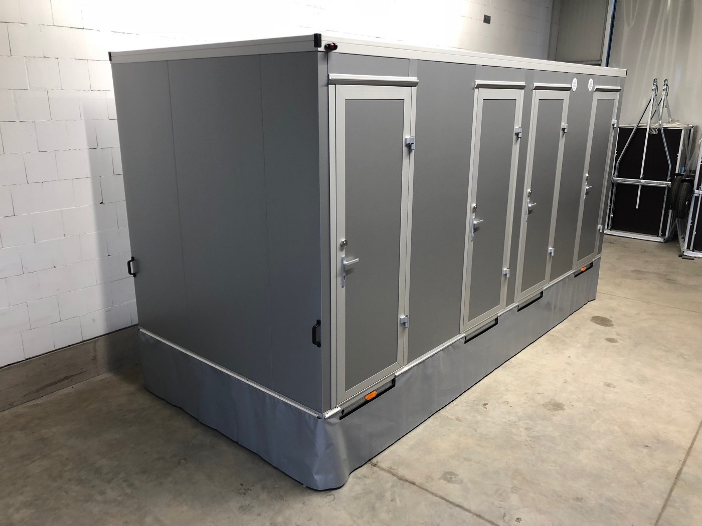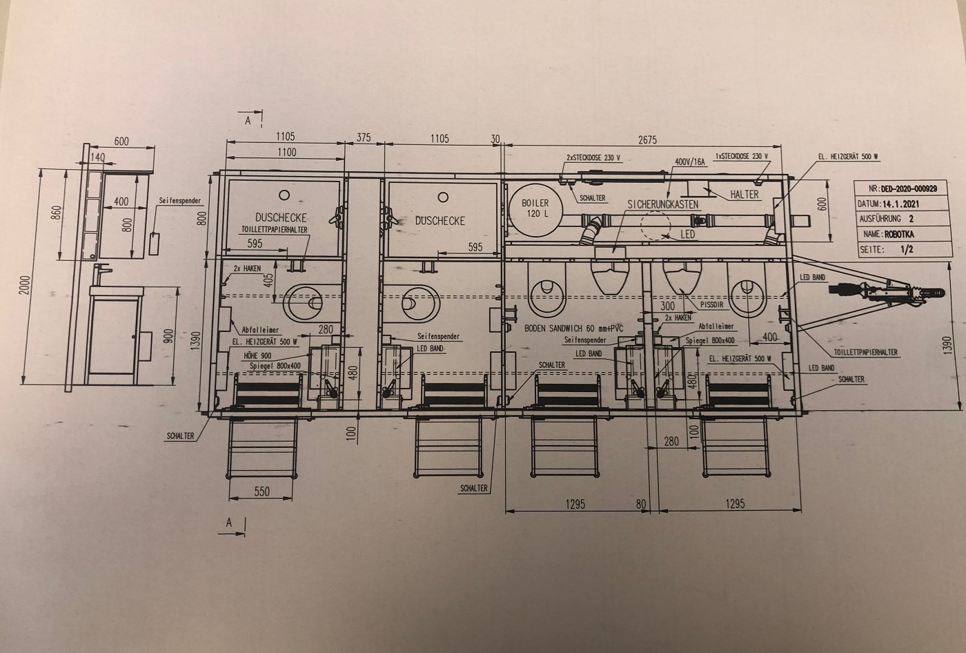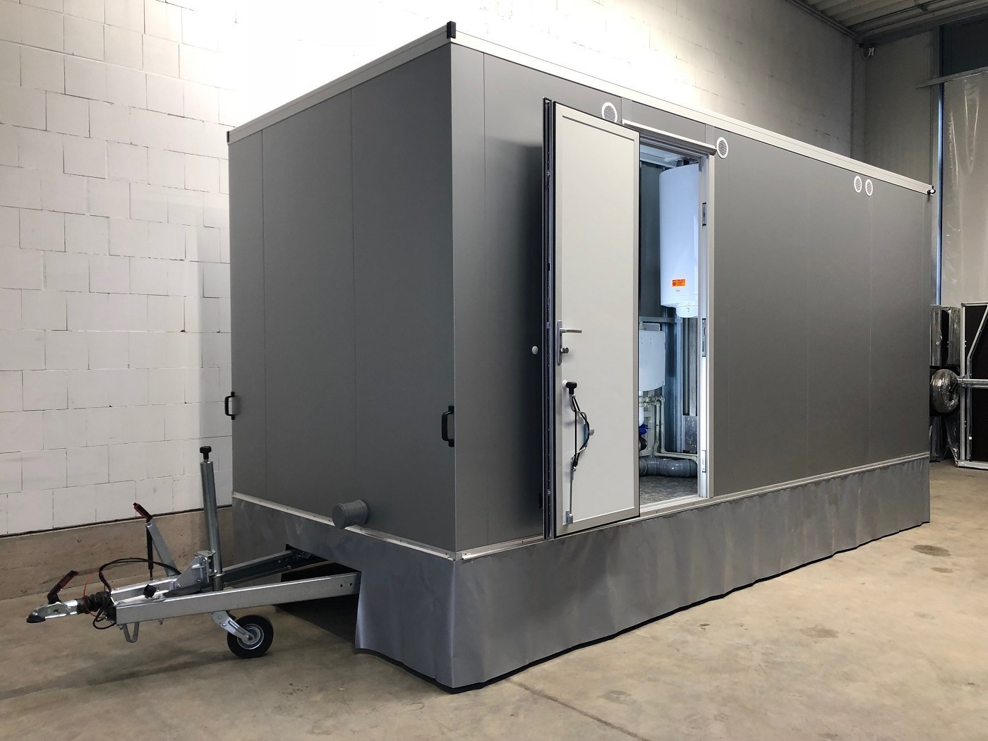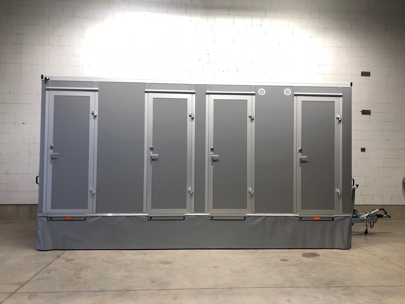 Badanhänger mit zwei vollausgestatteten Badezimmern (Dusche+WC+Waschtisch) mit zwei zusätzlichen und separaten WC-Abteilen (WC+Urinal+Waschtisch)