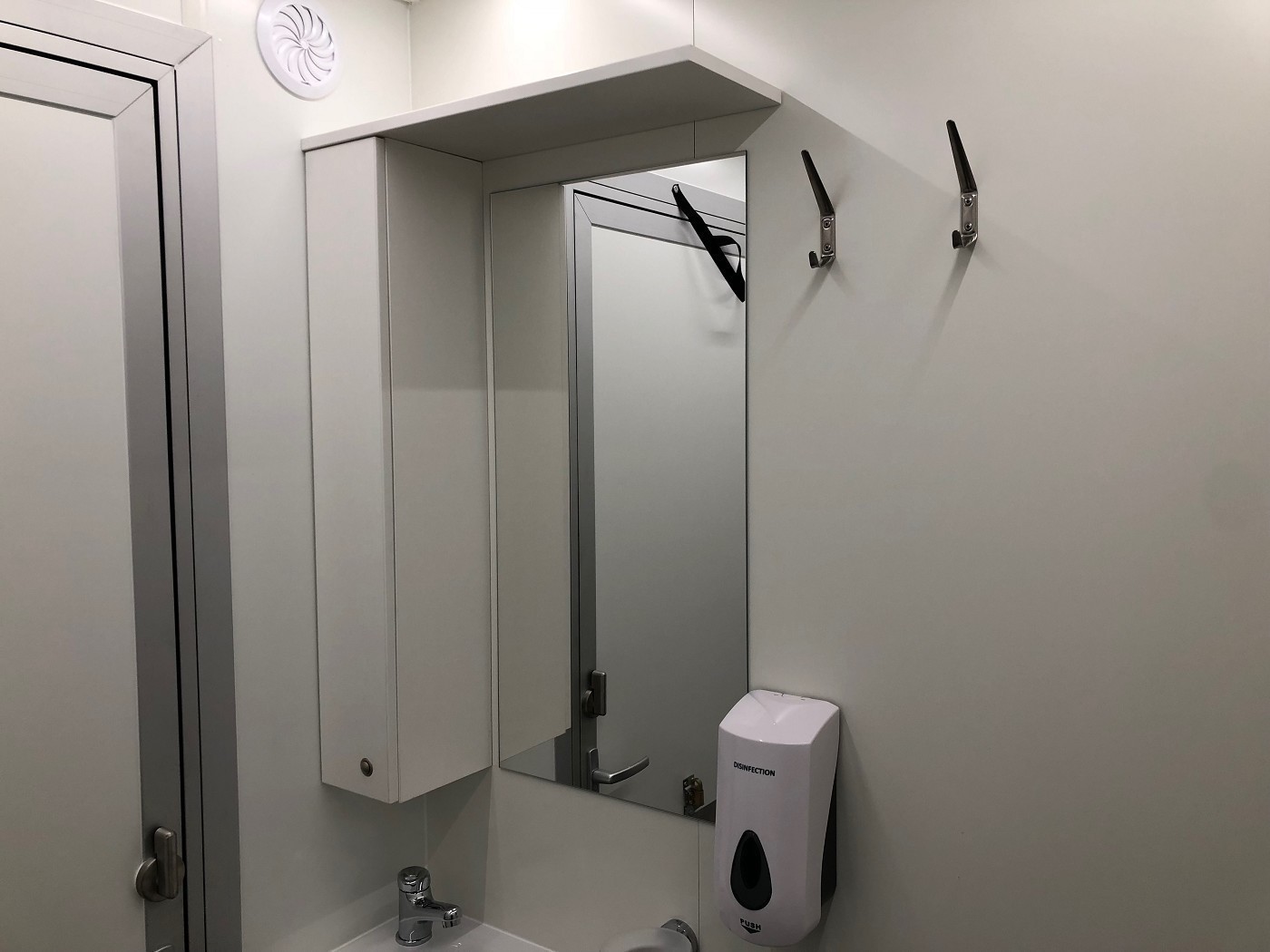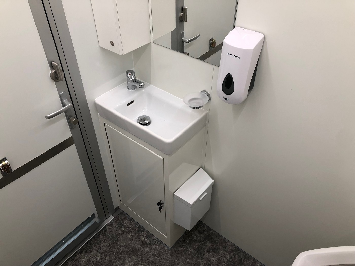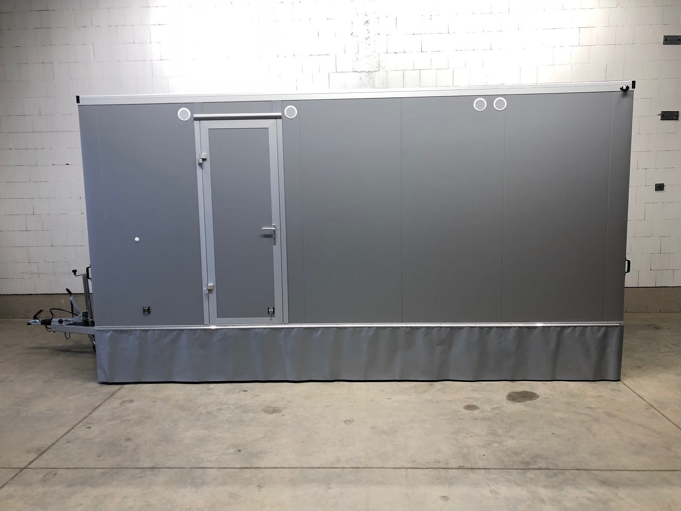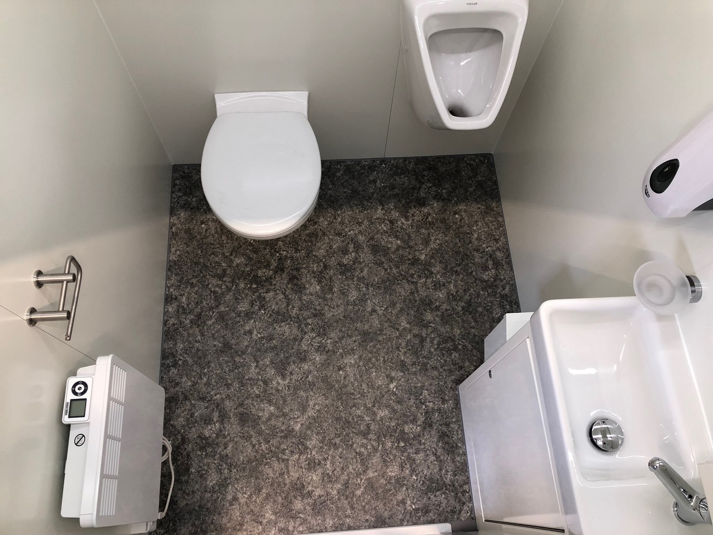 Badanhänger mit zwei vollausgestatteten Badezimmern (Dusche+WC+Waschtisch) mit zwei zusätzlichen und separaten WC-Abteilen (WC+Urinal+Waschtisch)