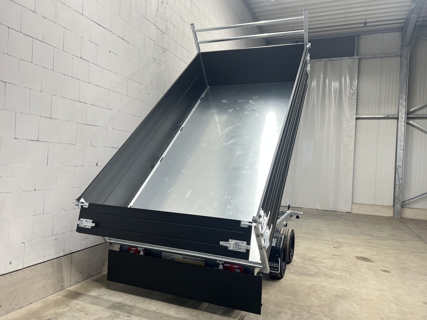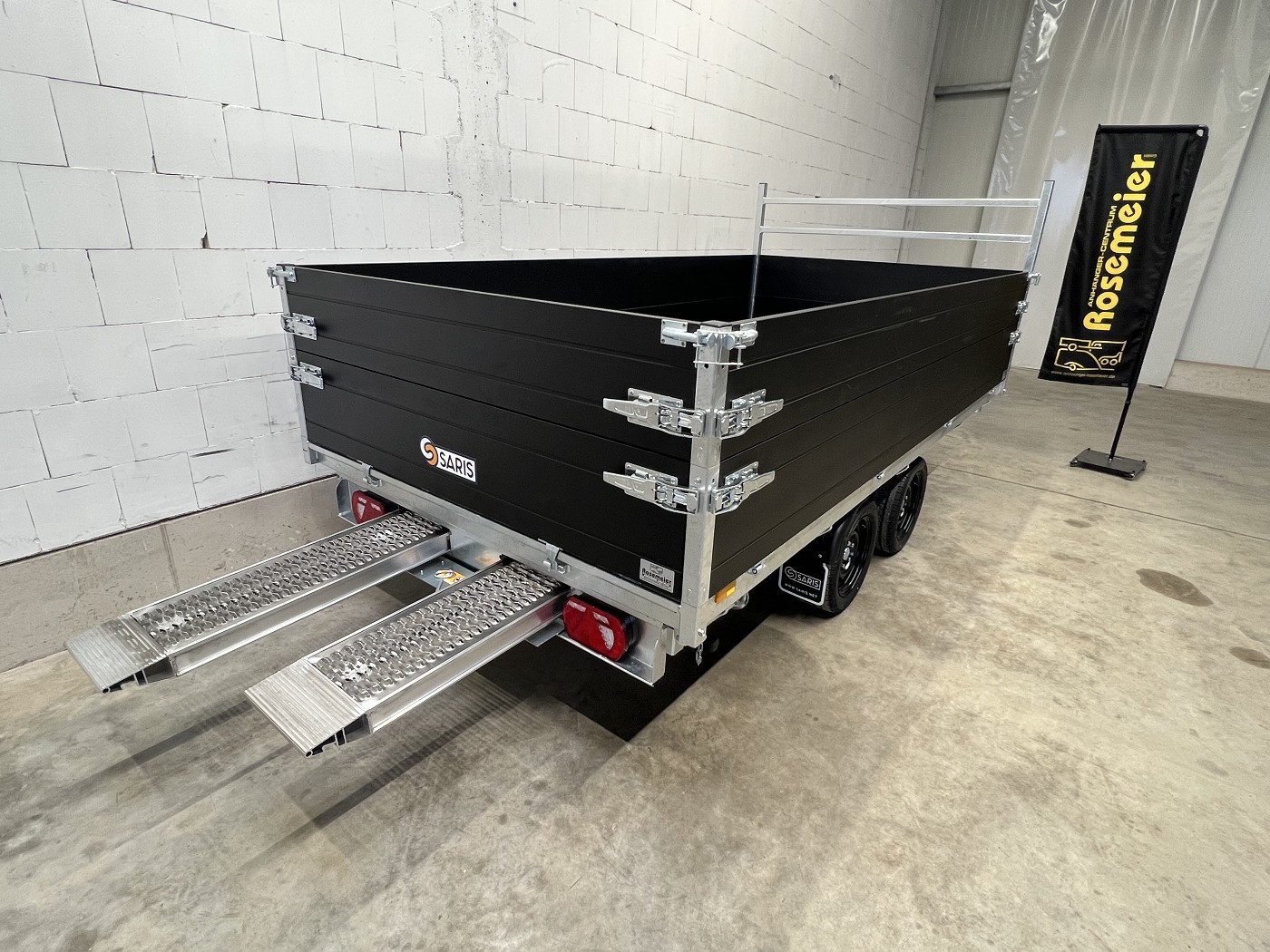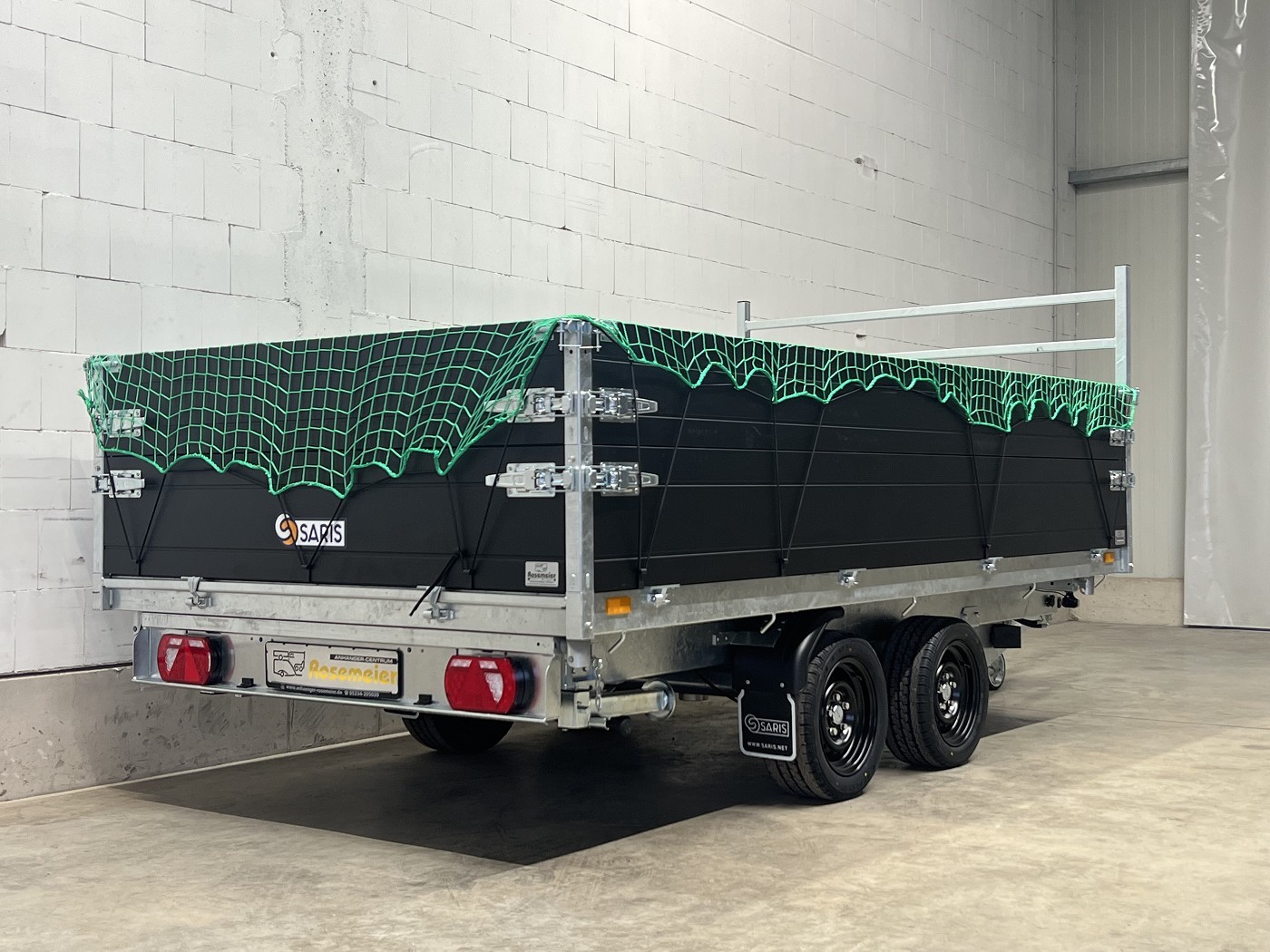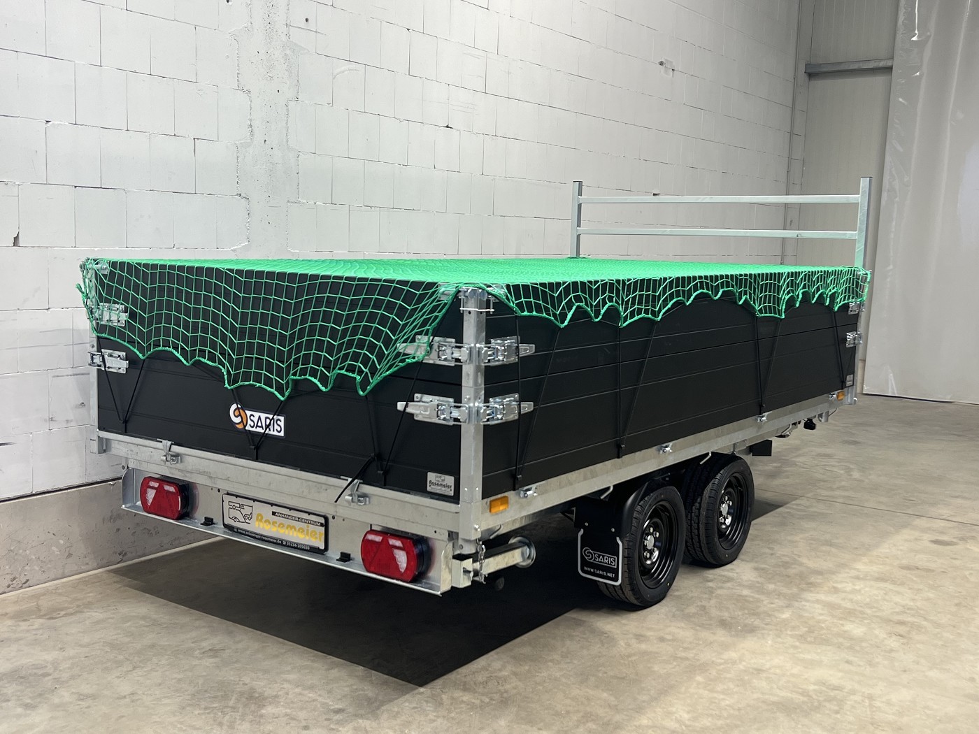 Saris Dreiseitenkipper mit E-Pumpe, Rampen, Stützen, hohen Bordwänden, H-Gestell, Ladungssicherungsnetz