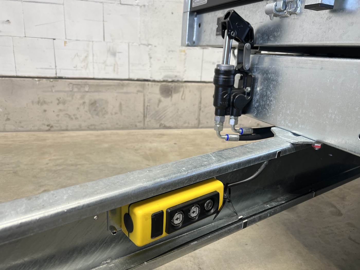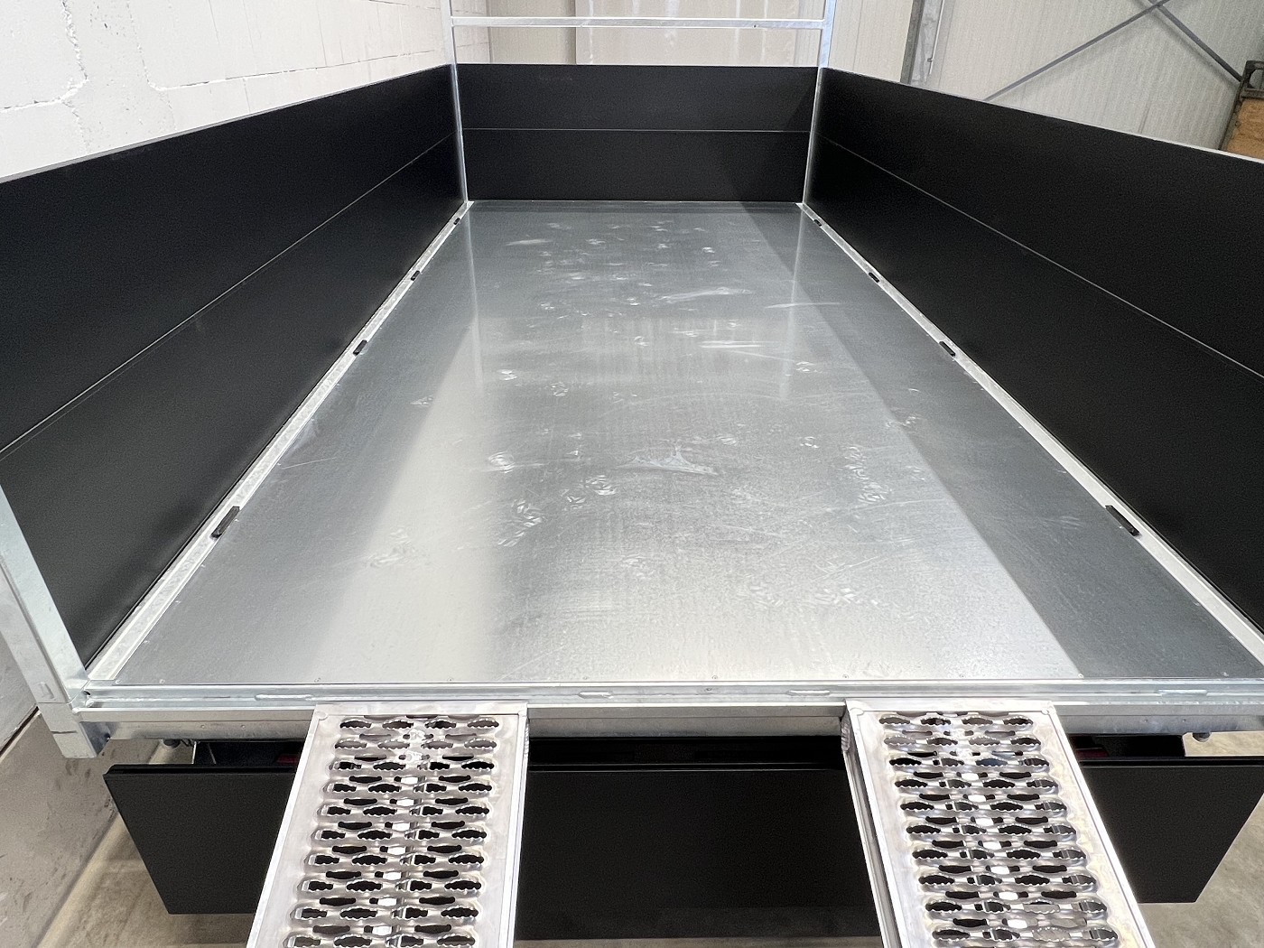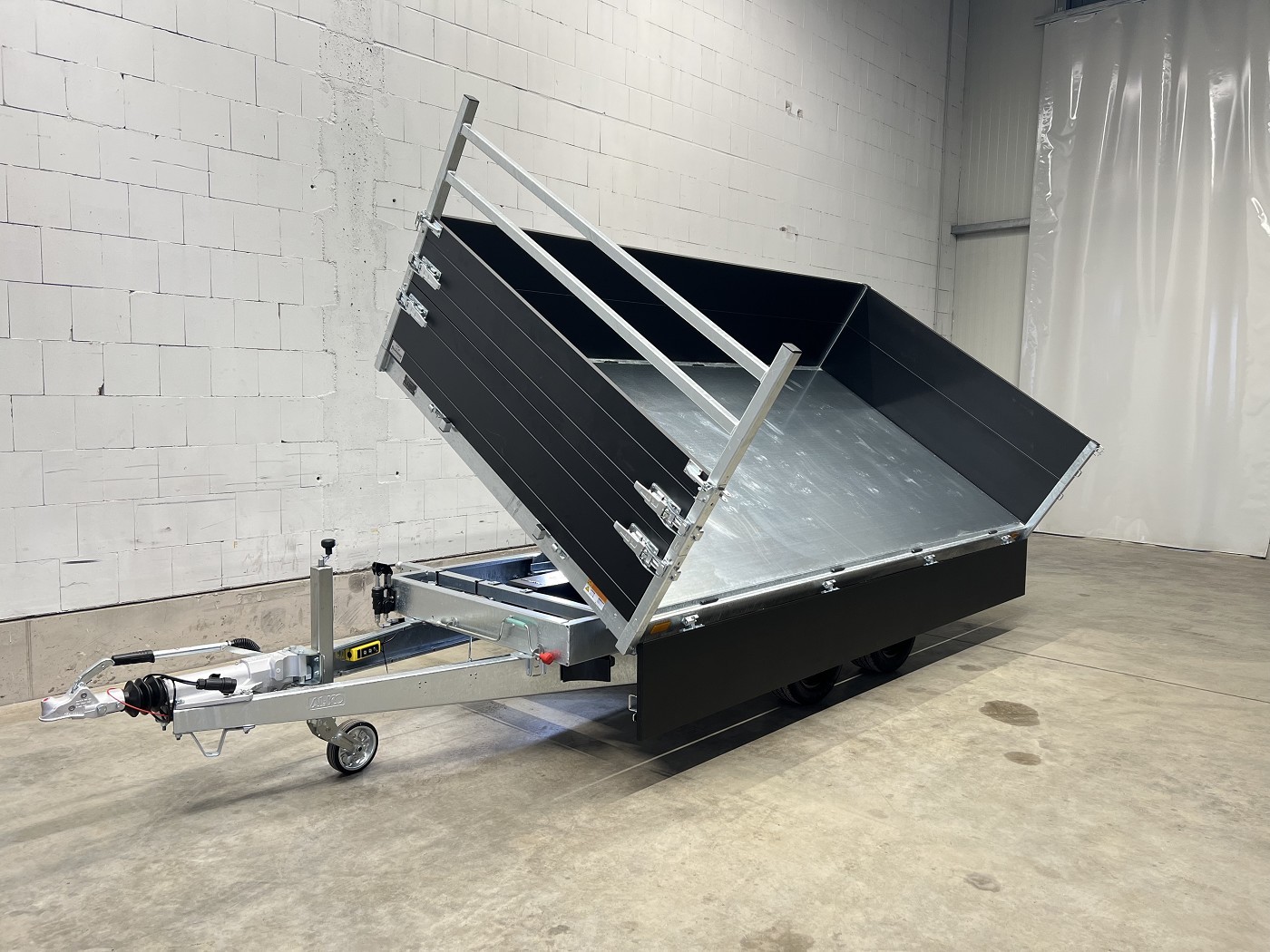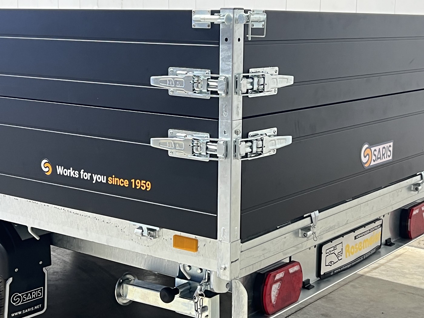 Saris Dreiseitenkipper mit E-Pumpe, Rampen, Stützen, hohen Bordwänden, H-Gestell, Ladungssicherungsnetz