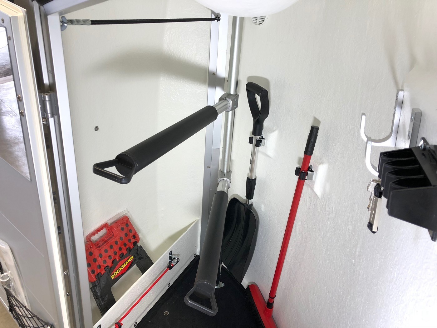 • Sattelkammer ausgestattet mit: Schaufel und Besen, Trensenhalter, div. Haken, Ablagefach, Staunetz, Spiegel und Leine zum Aufhängen von Decken