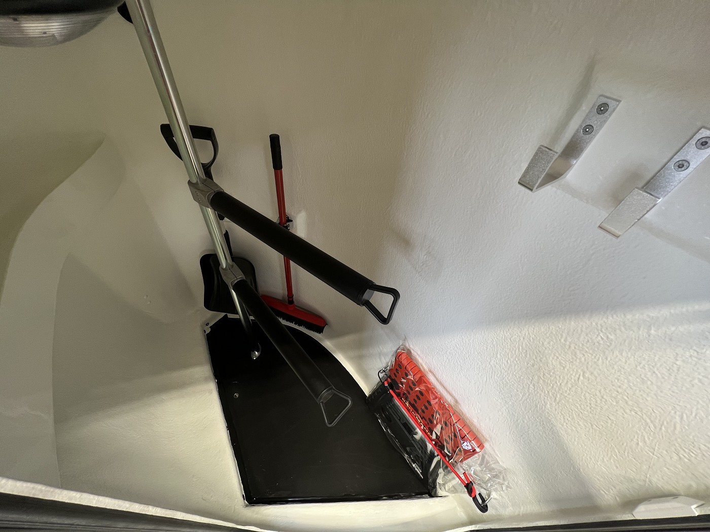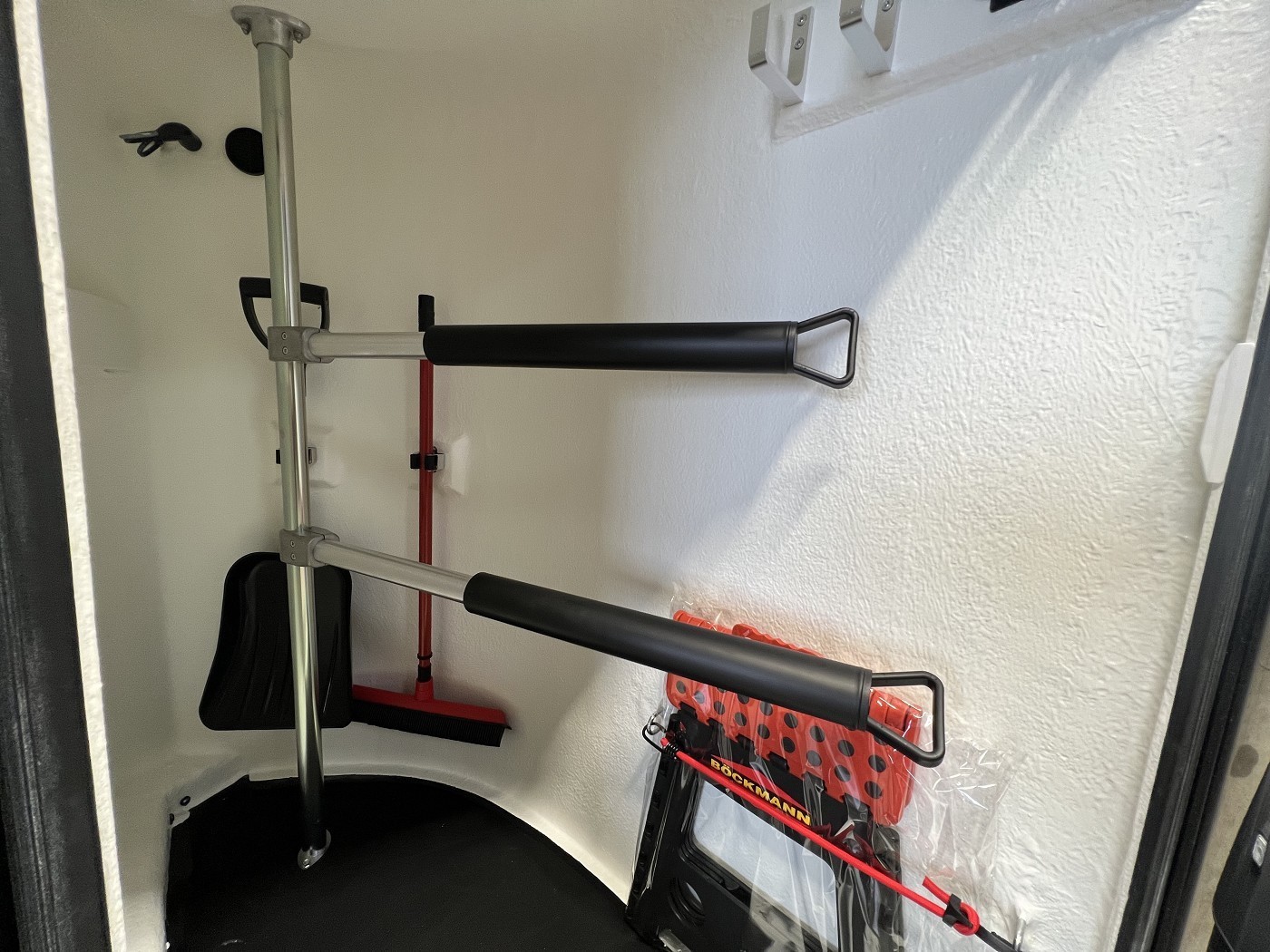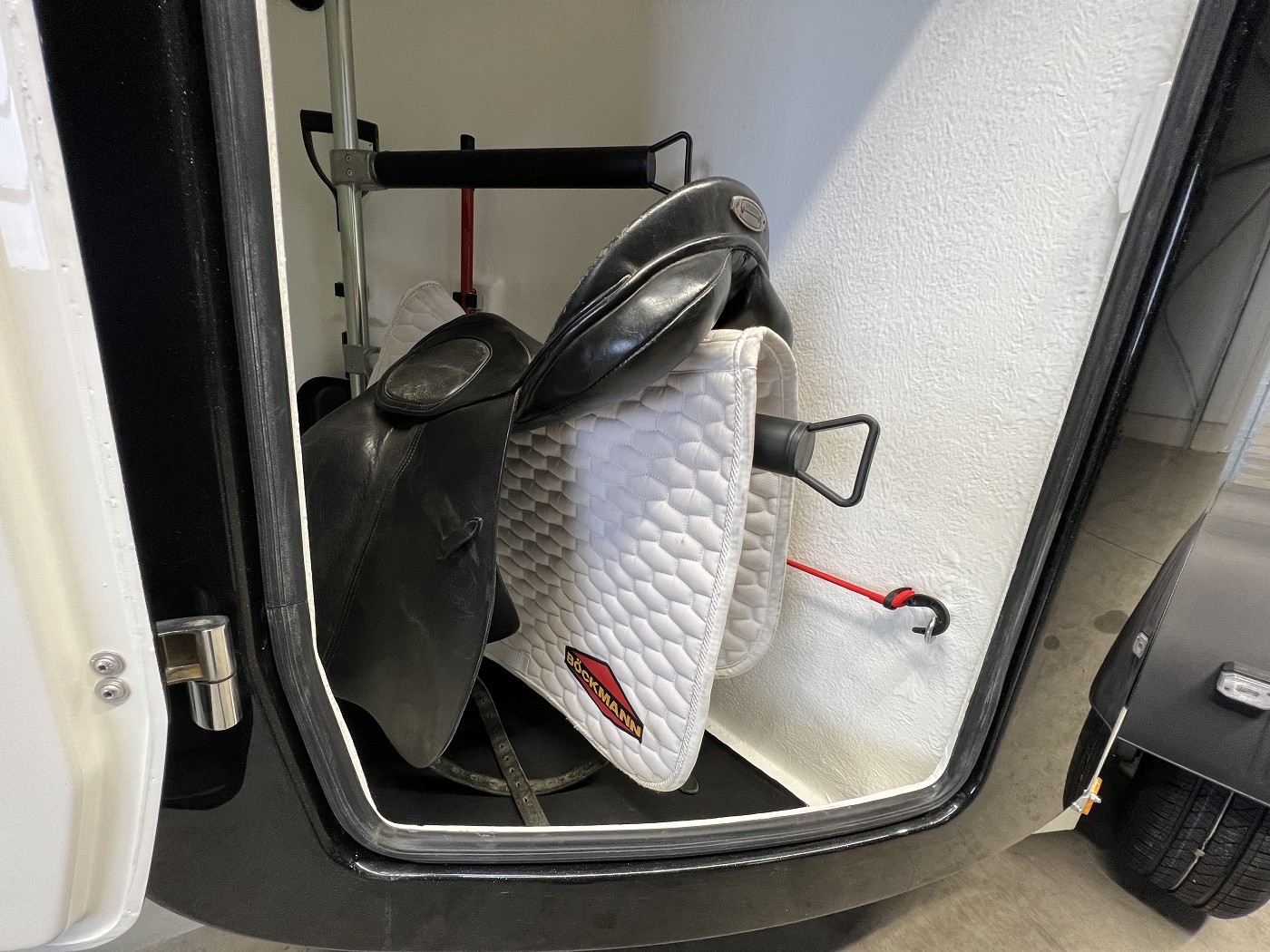 · Sattelkammer – von außen zugänglich mit ausziehbaren Sattelhaltern, Besen mit Teleskopstiel, Schaufel, kleinem Gepäcknetz sowie Spiegel an der Türinnenseite, kleiner Regalboden, große Trensenhaken, Gertenhalter, Klapphocker und LED-Beleuchtung