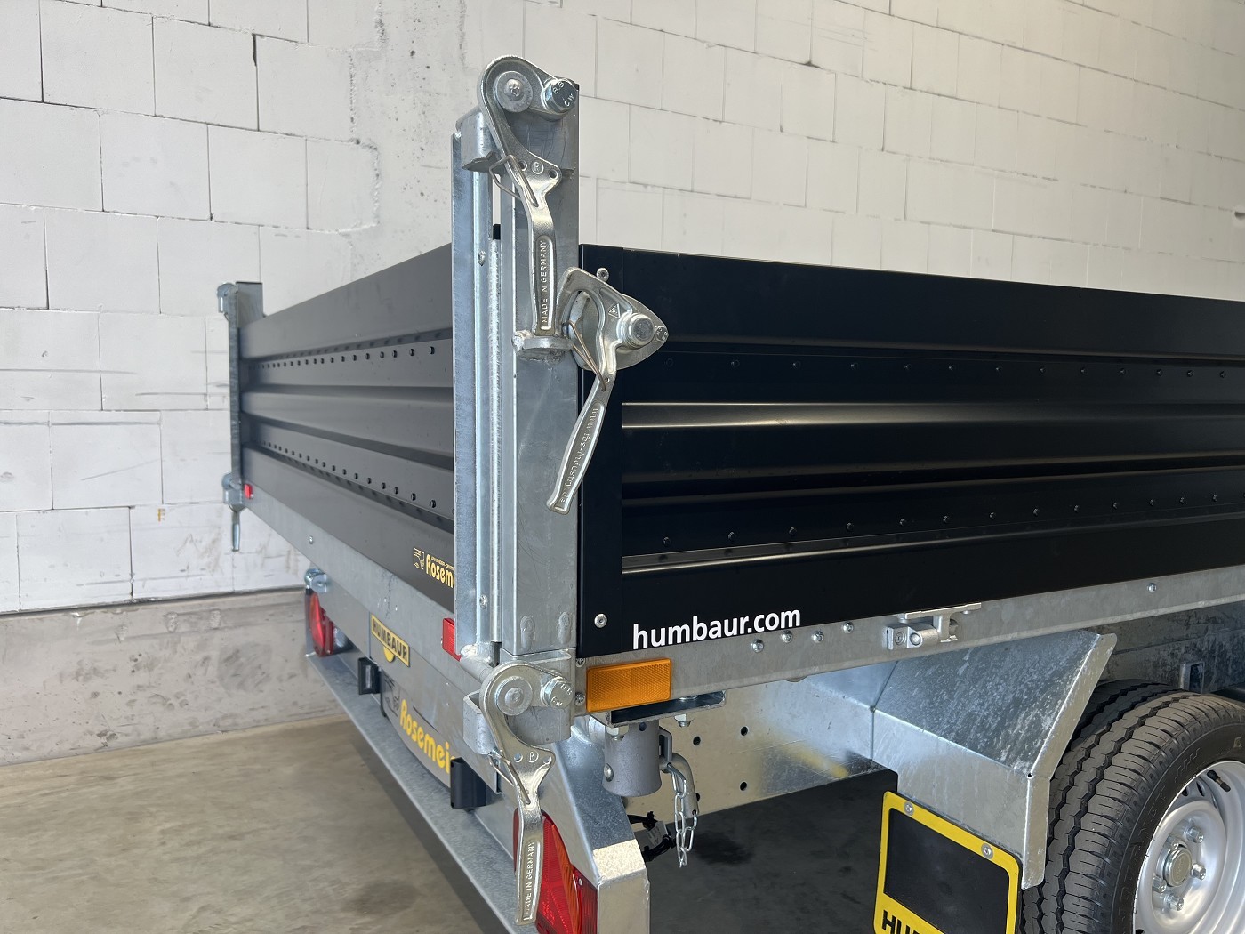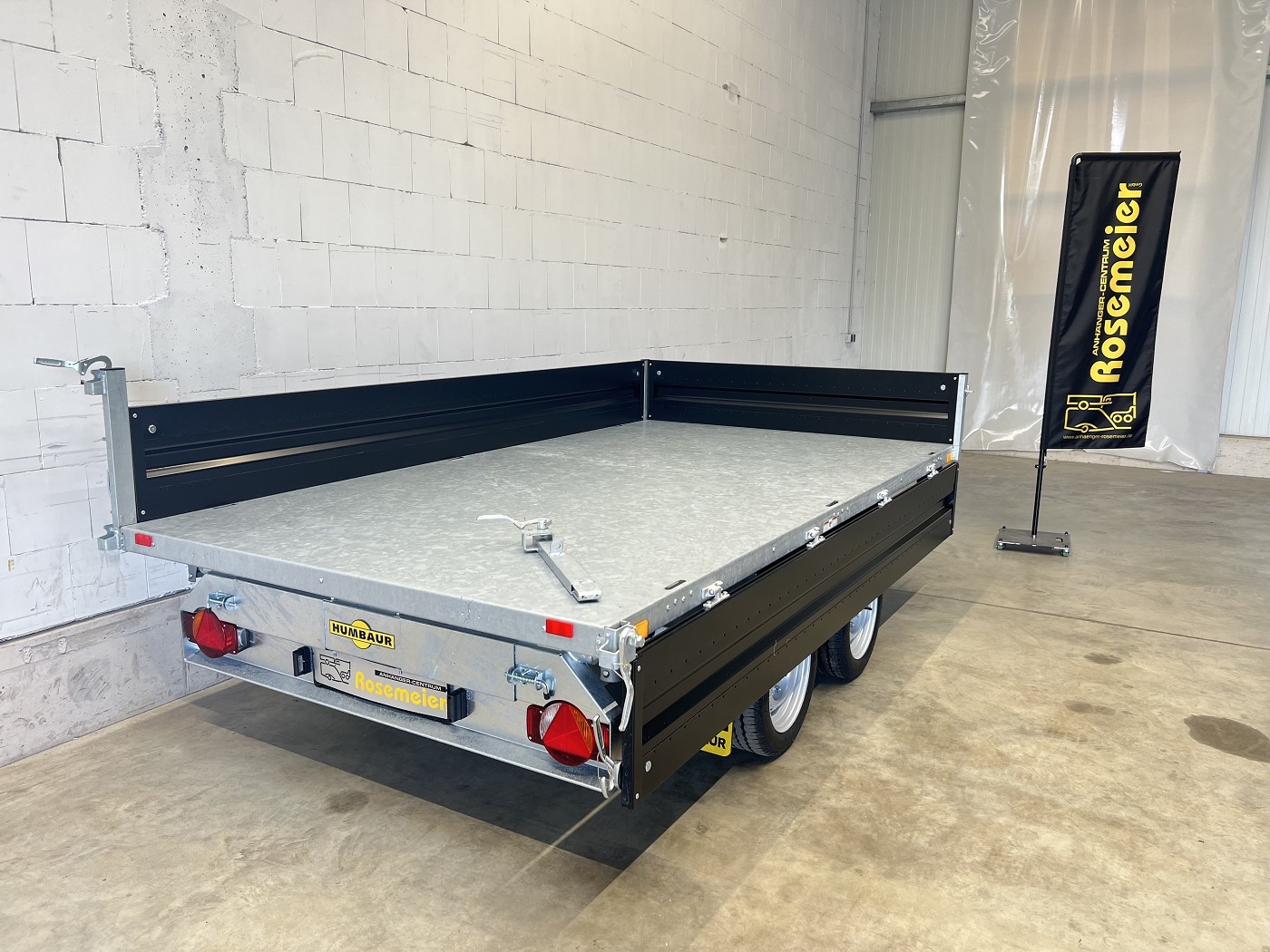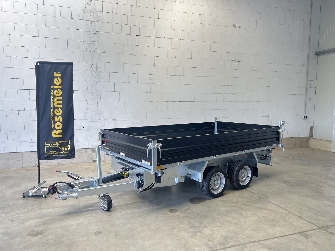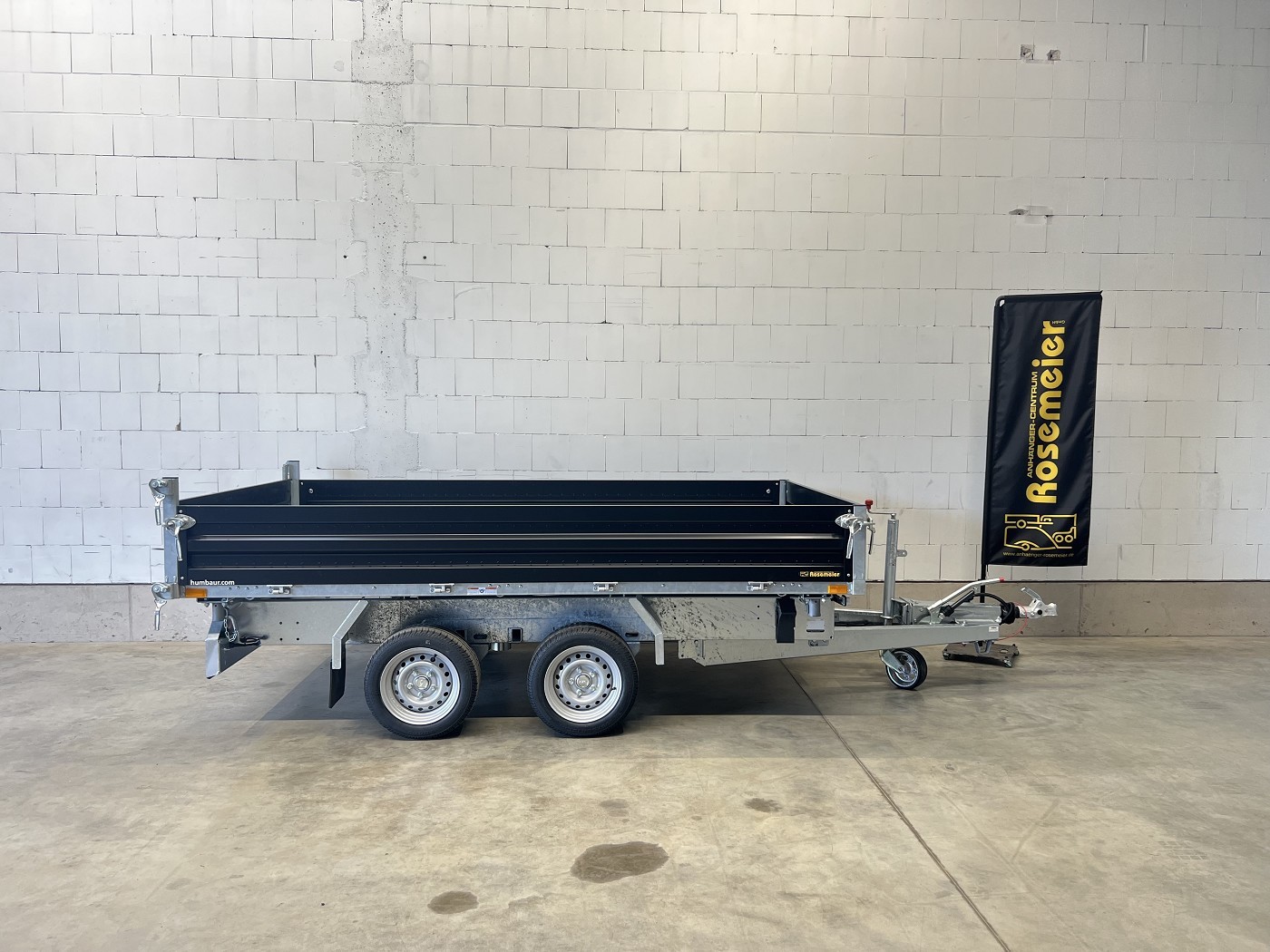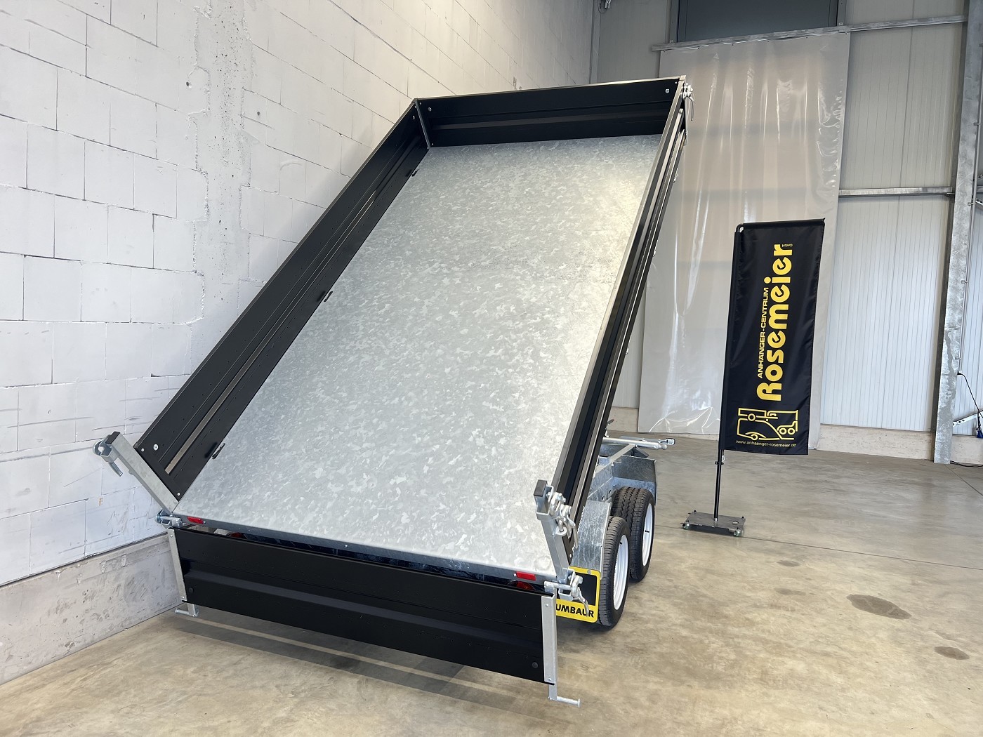 Humbaur Dreiseitenkipper mit E-Pumpe und schwarzen Stahlbordwänden