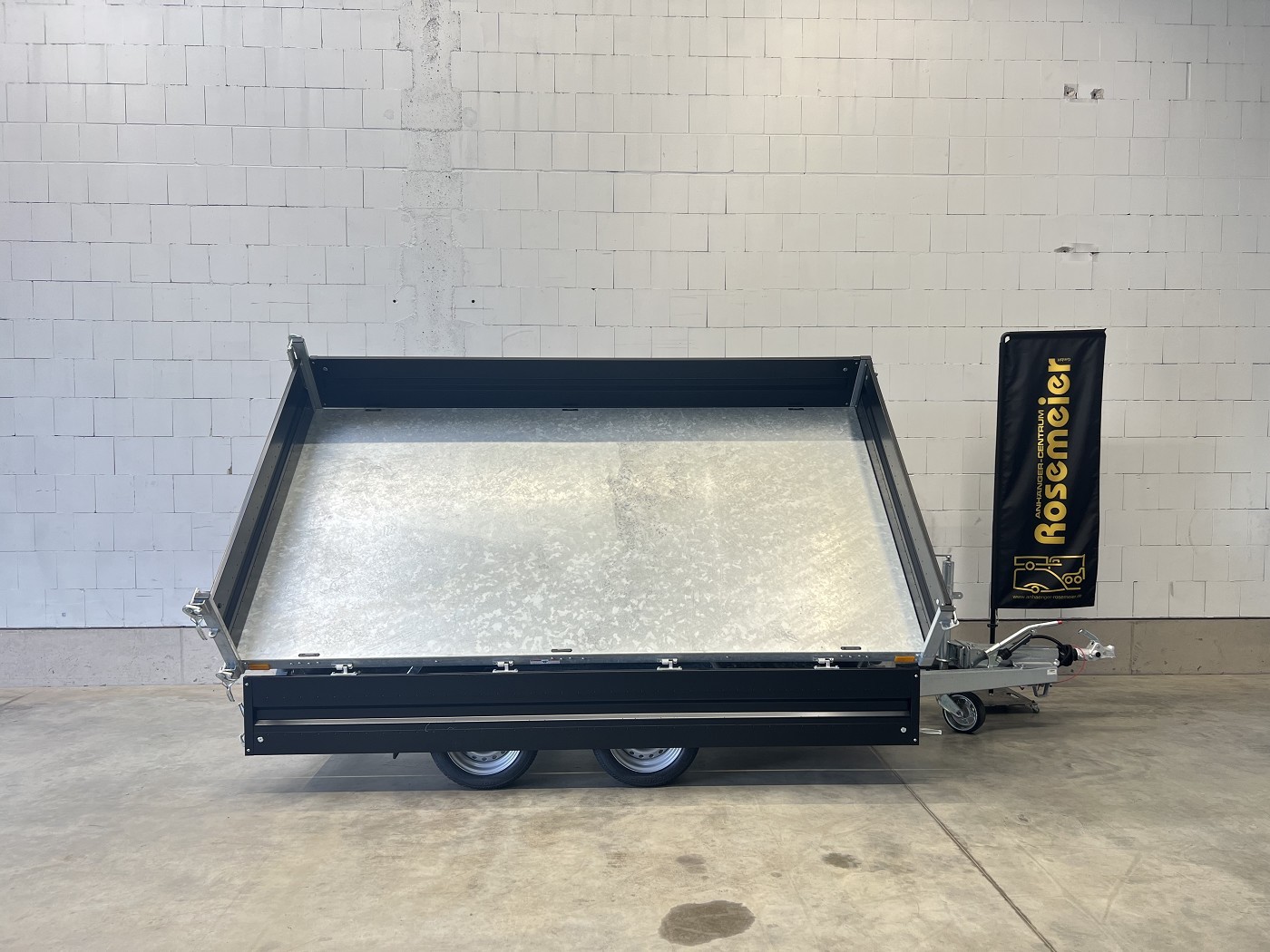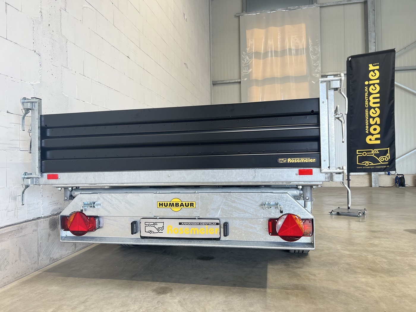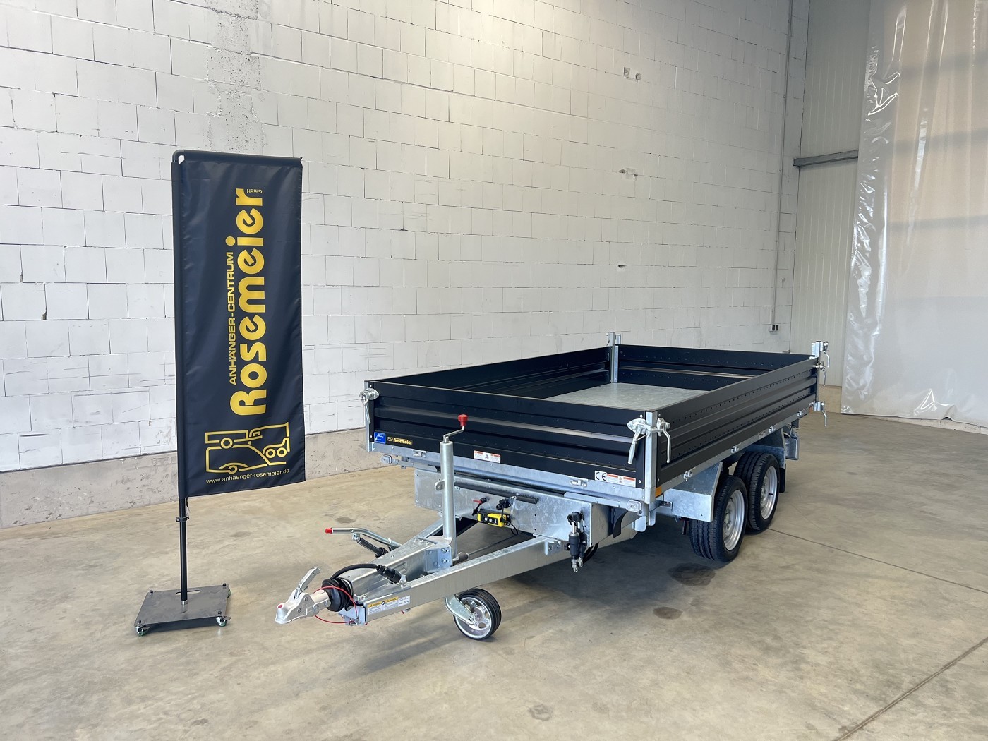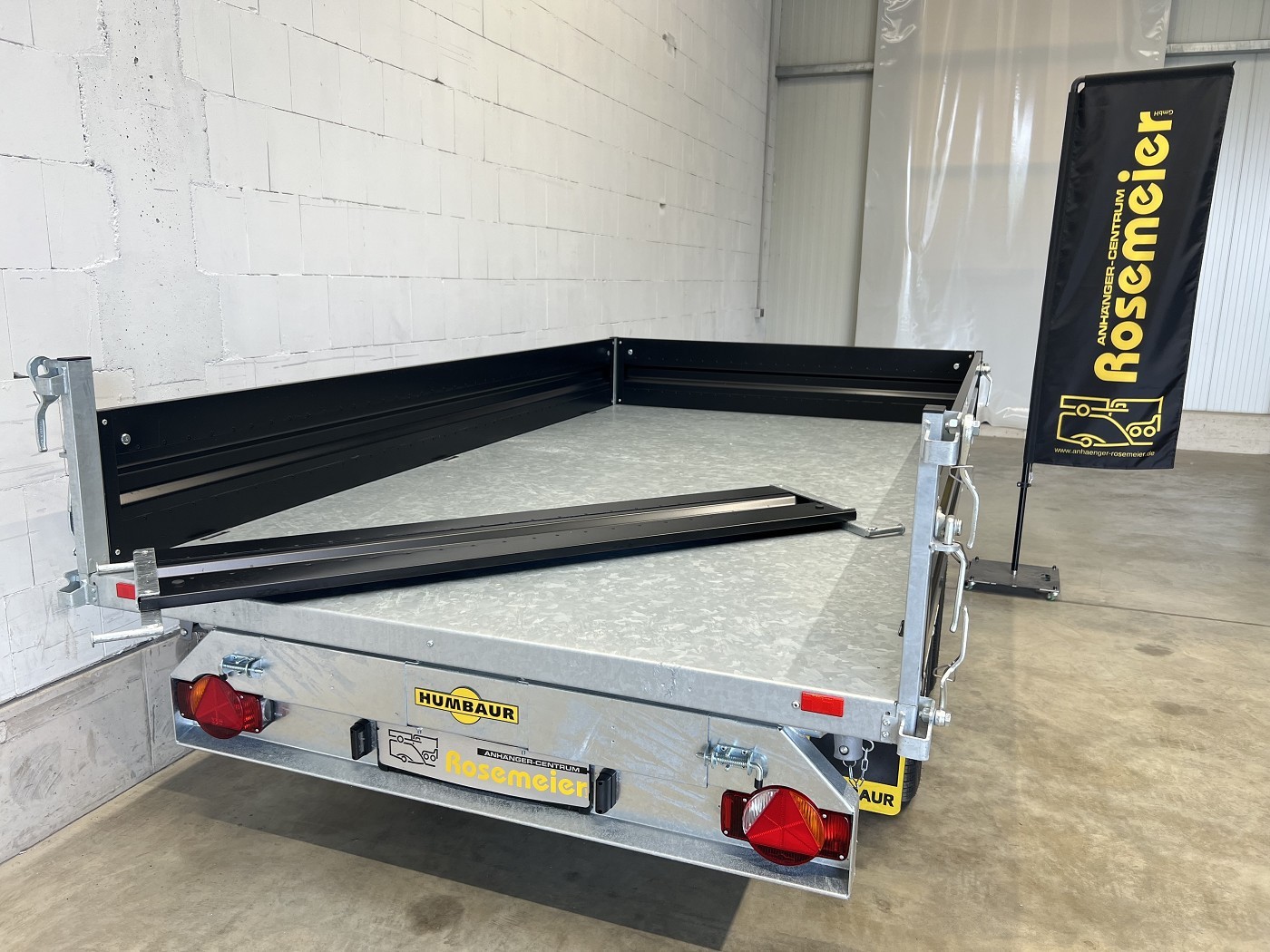 Humbaur Dreiseitenkipper mit E-Pumpe und schwarzen Stahlbordwänden