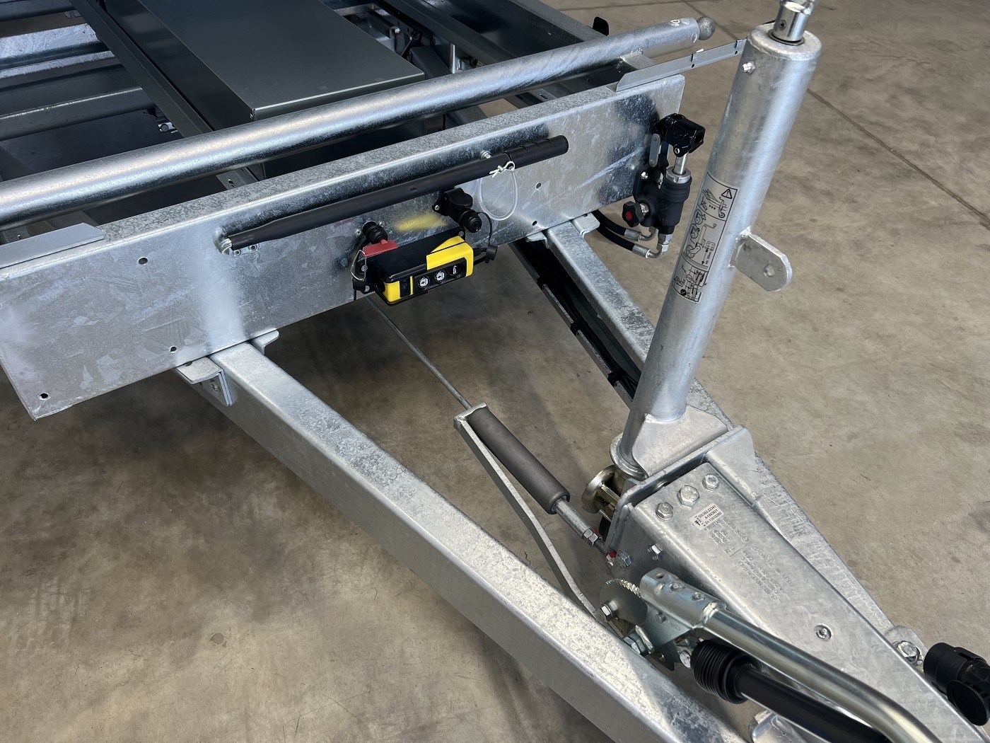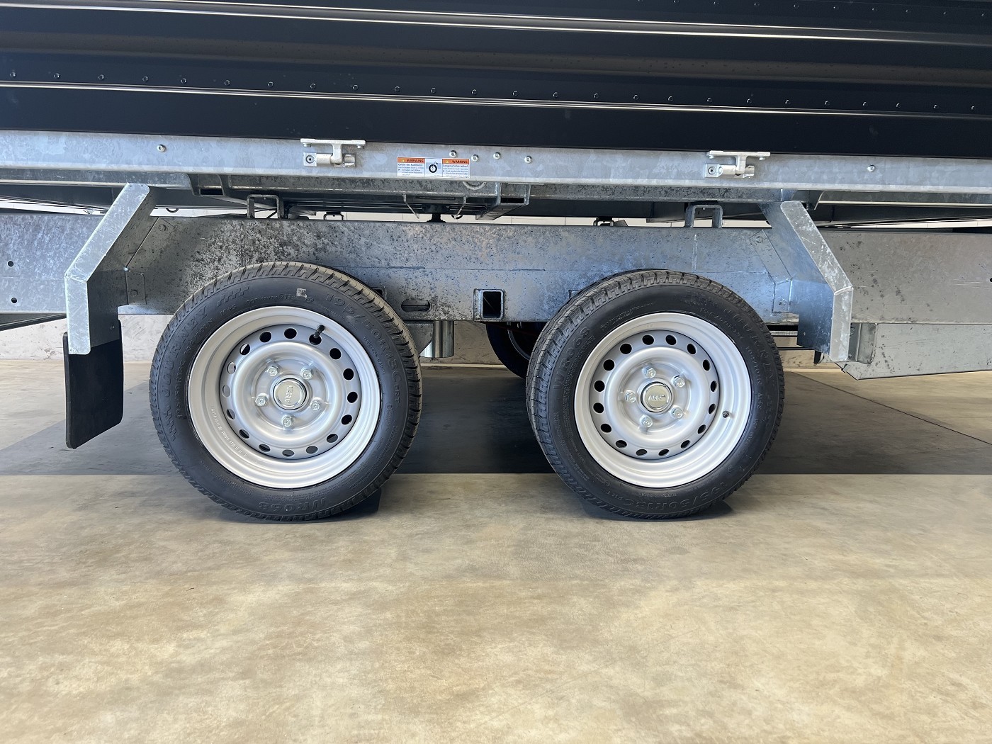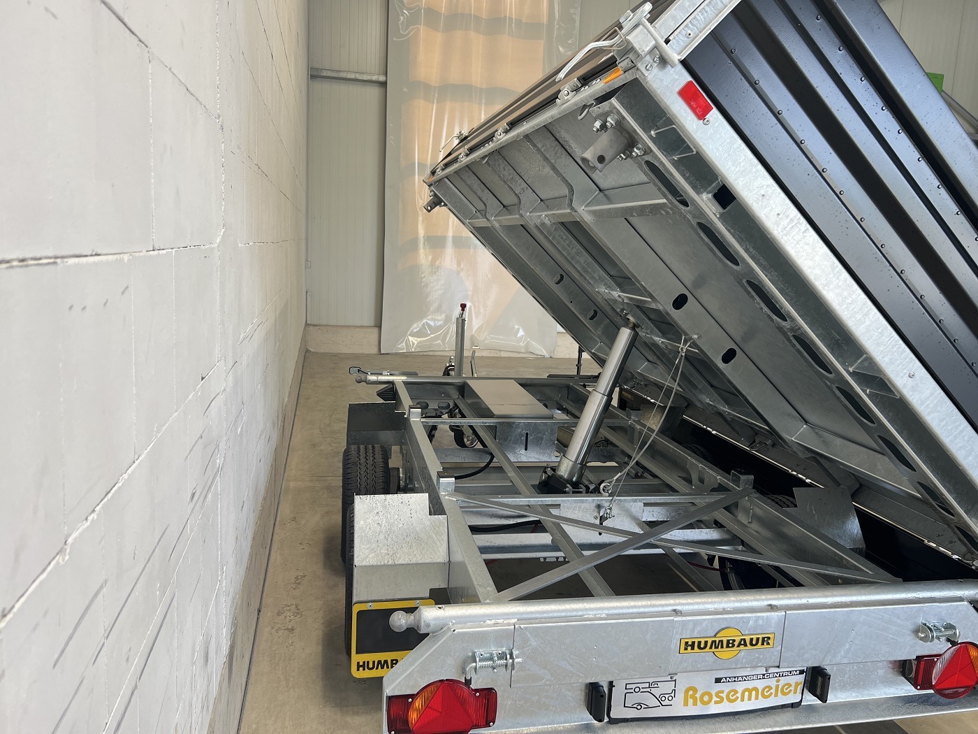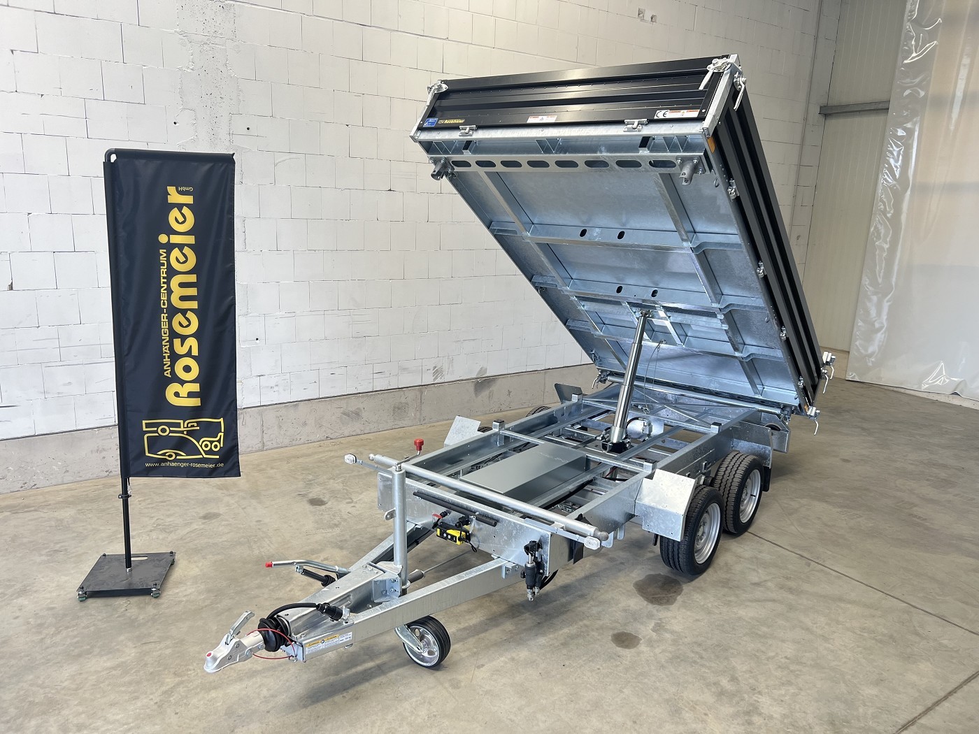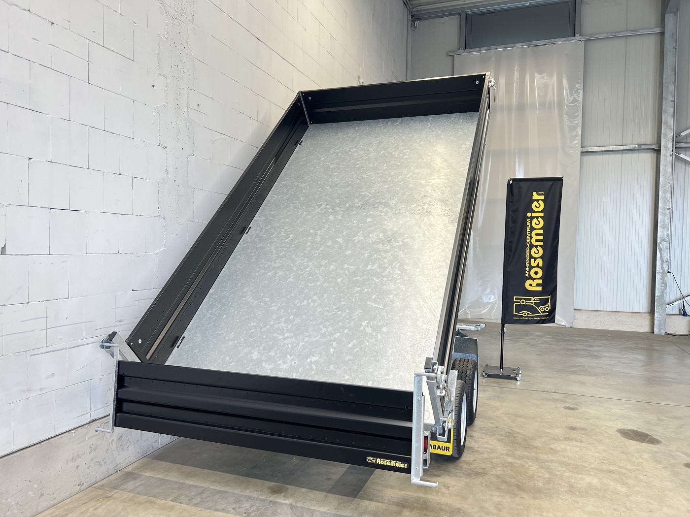 Humbaur Dreiseitenkipper mit E-Pumpe und schwarzen Stahlbordwänden