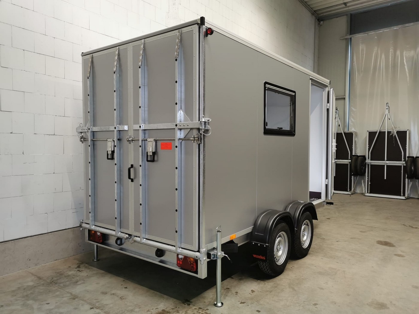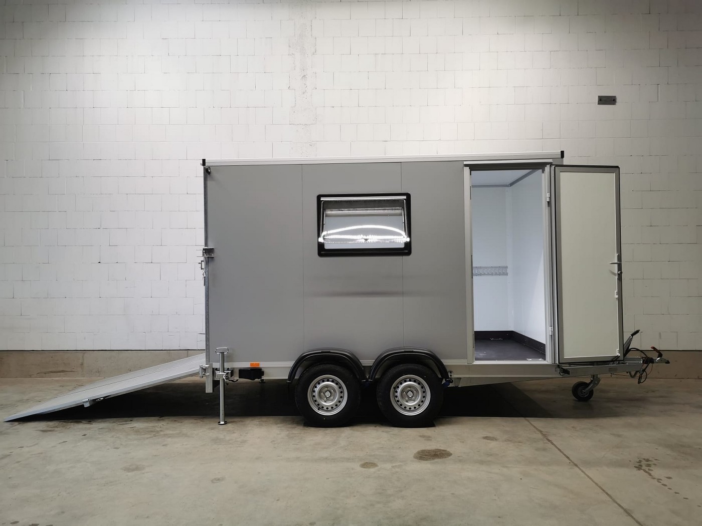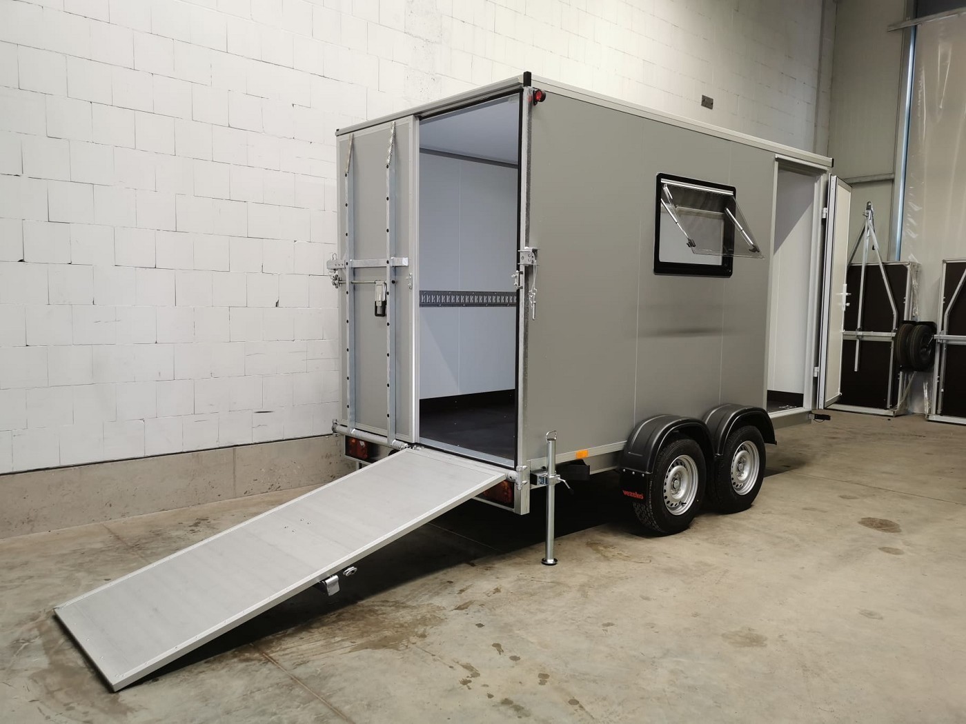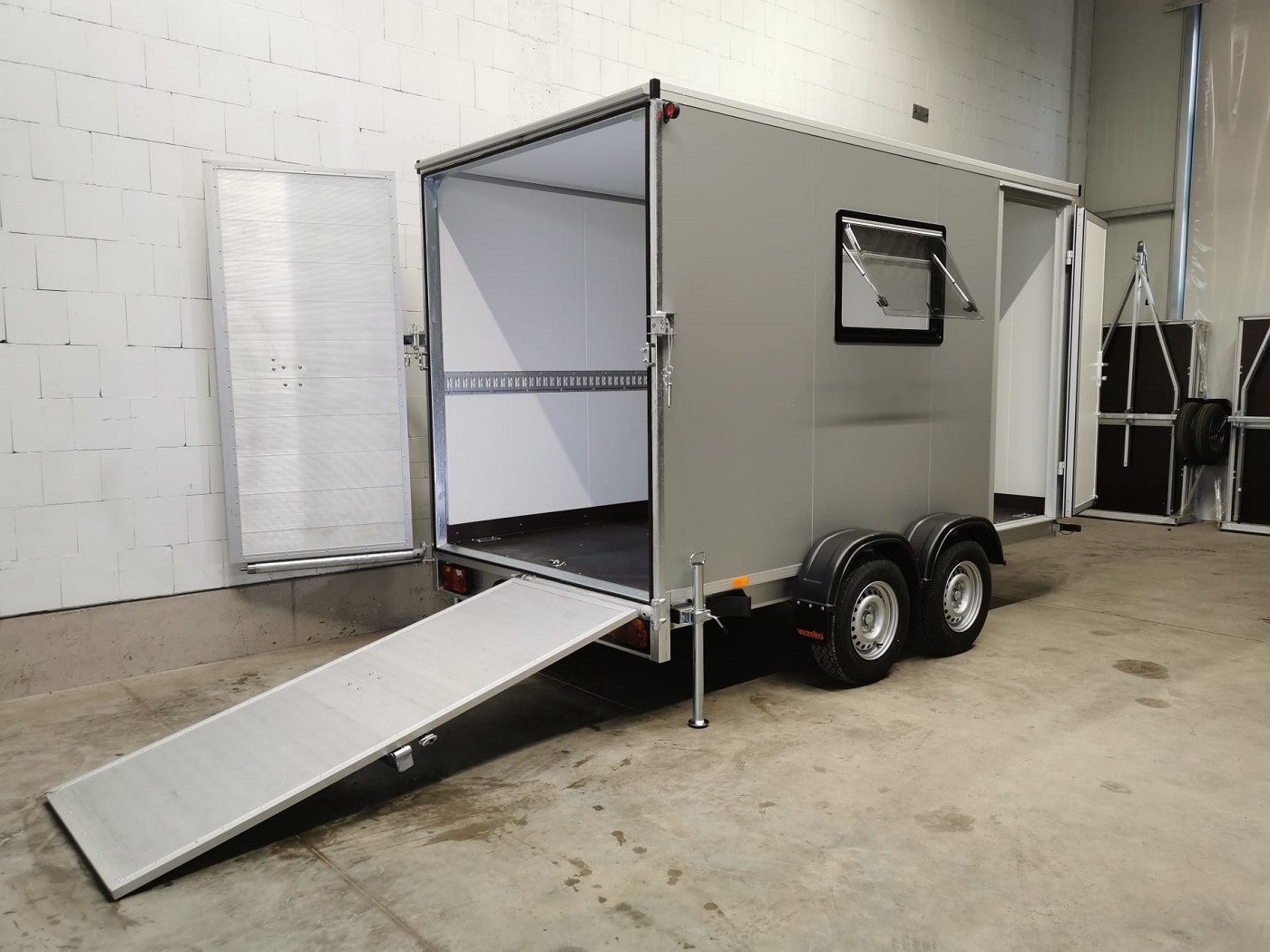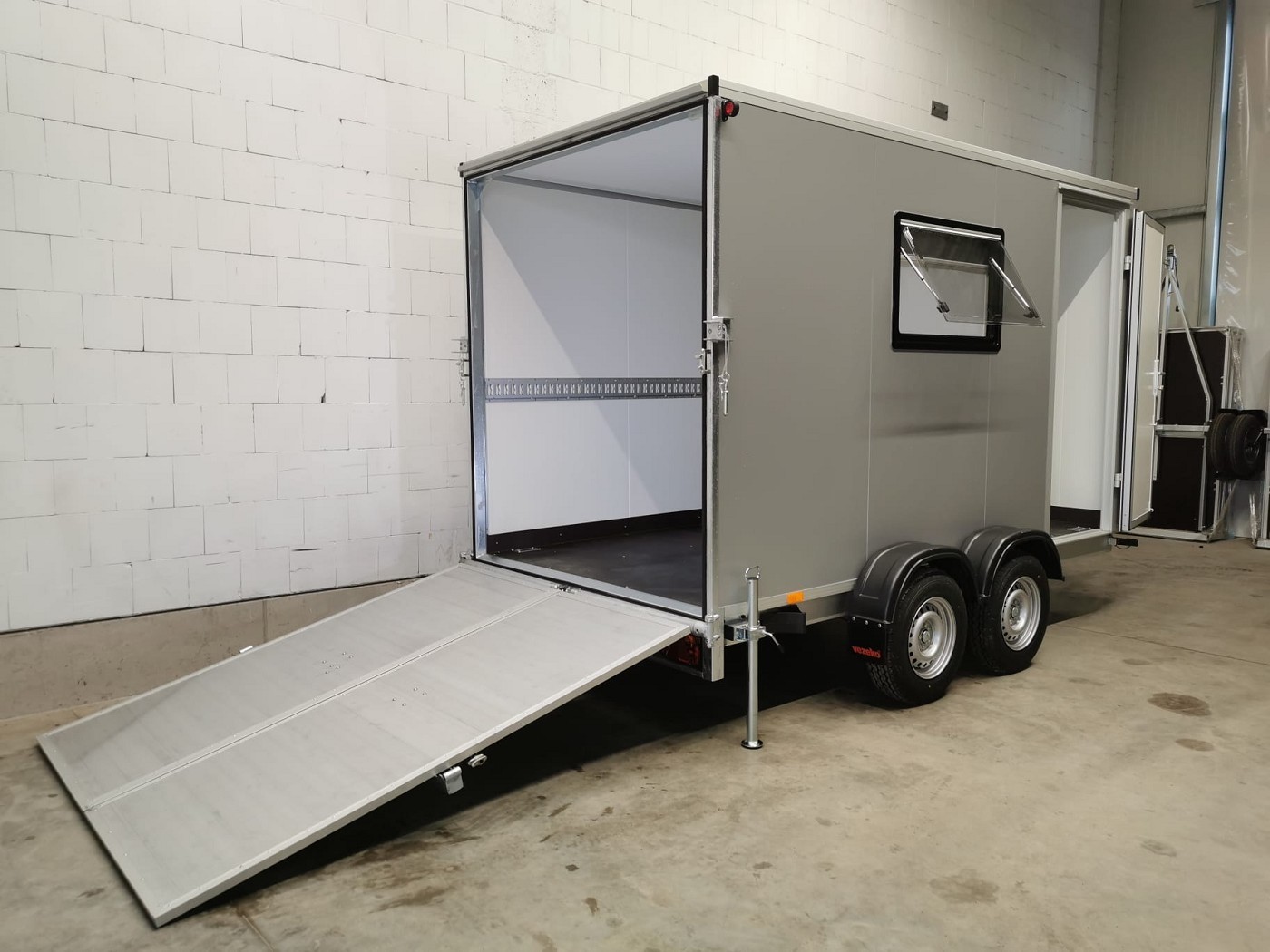 Kofferanhänger mit Türklappenkombination bestehend aus 2 Rampen und Doppelflügeltür zusätzlicher Seitentür und Fenster