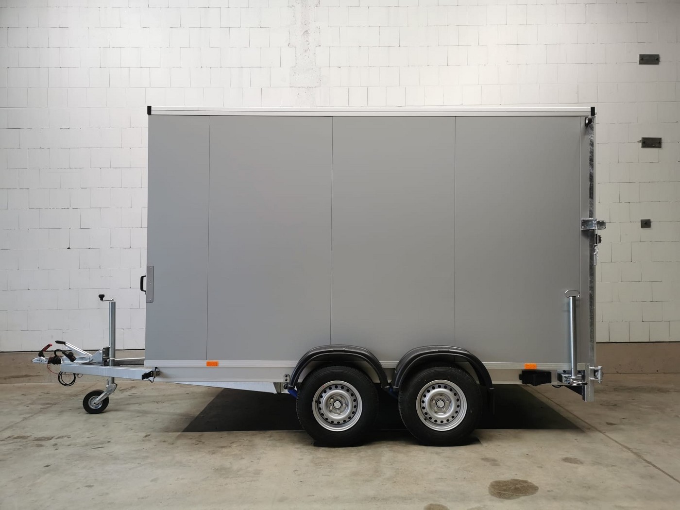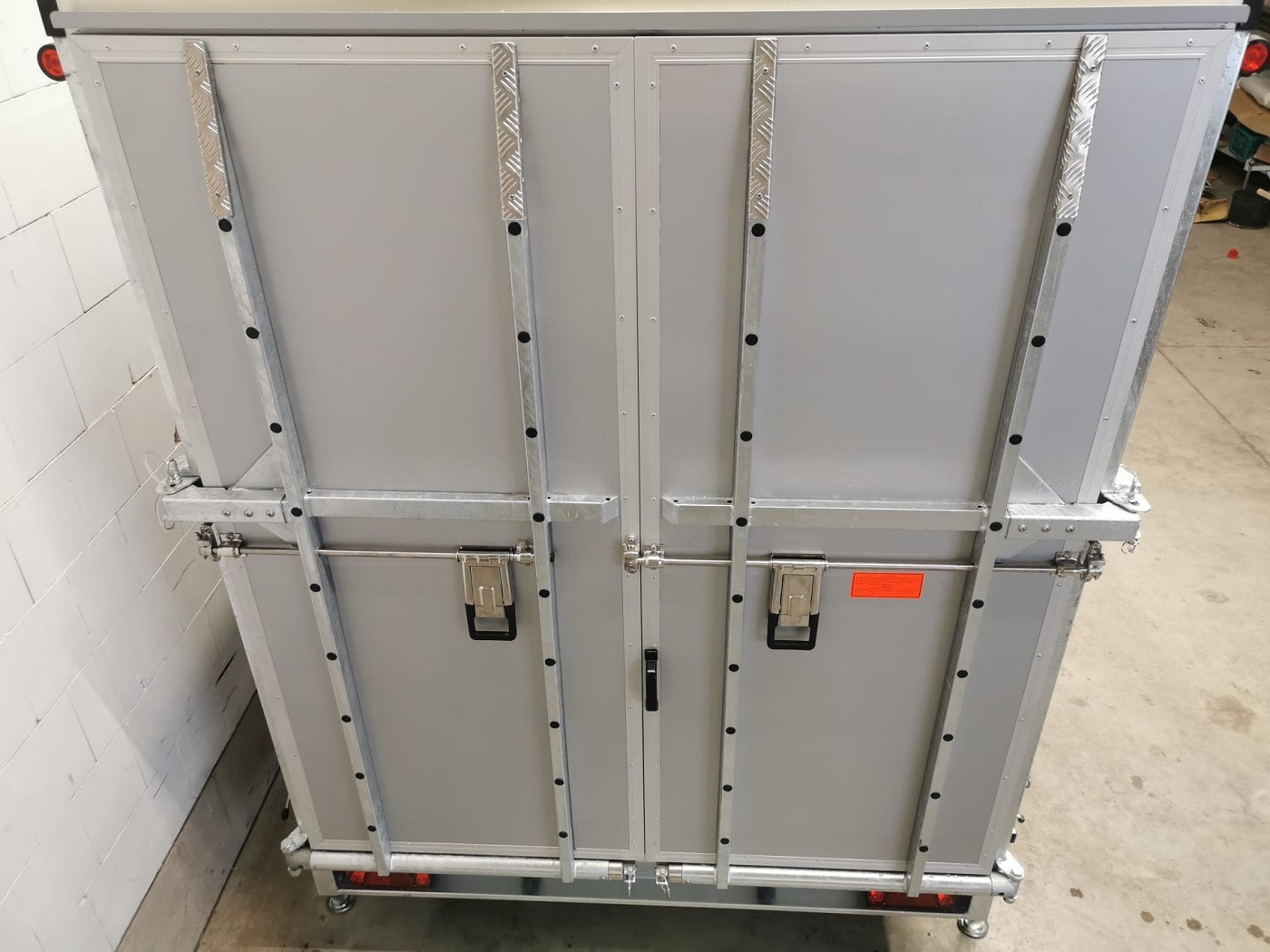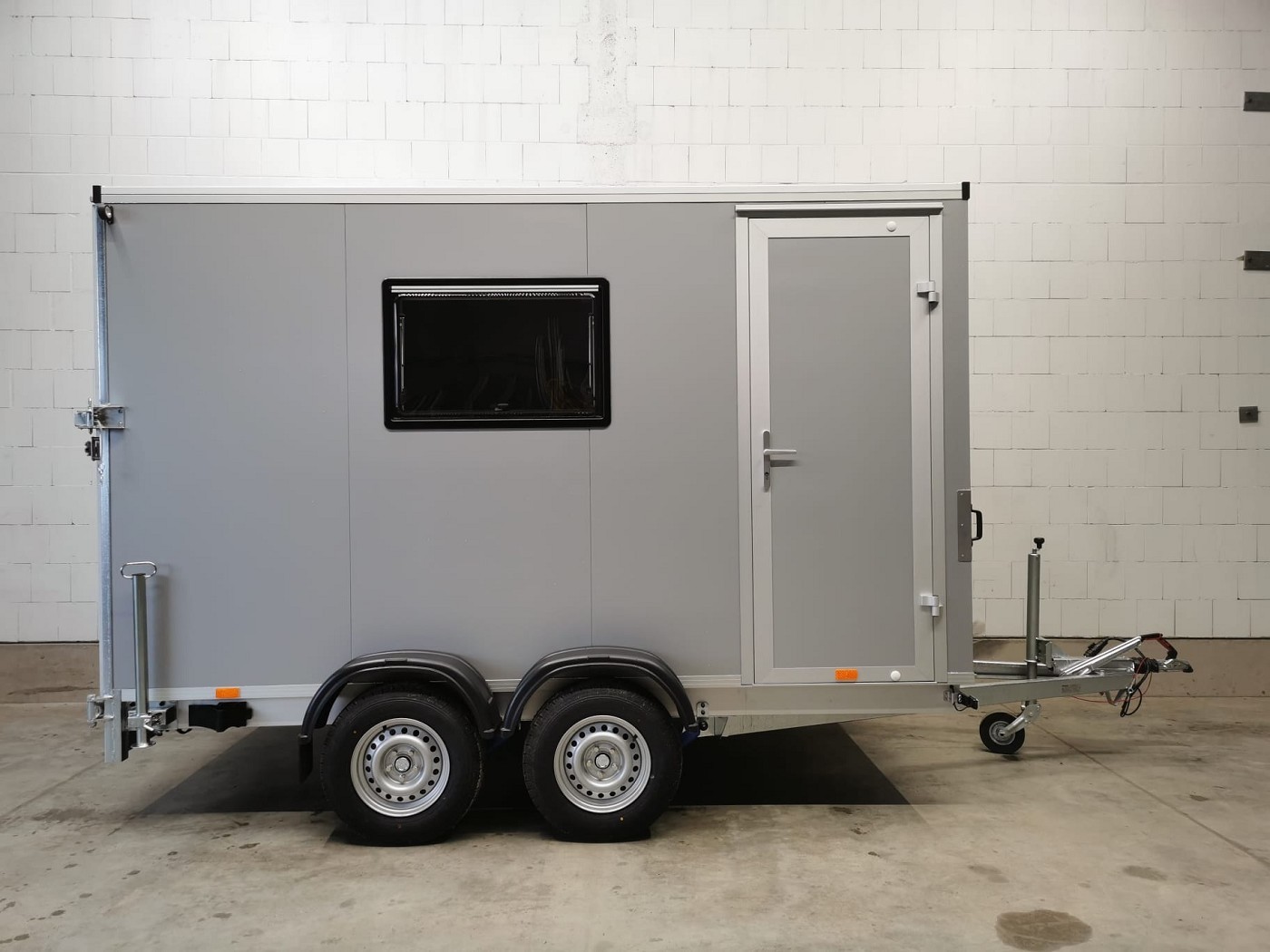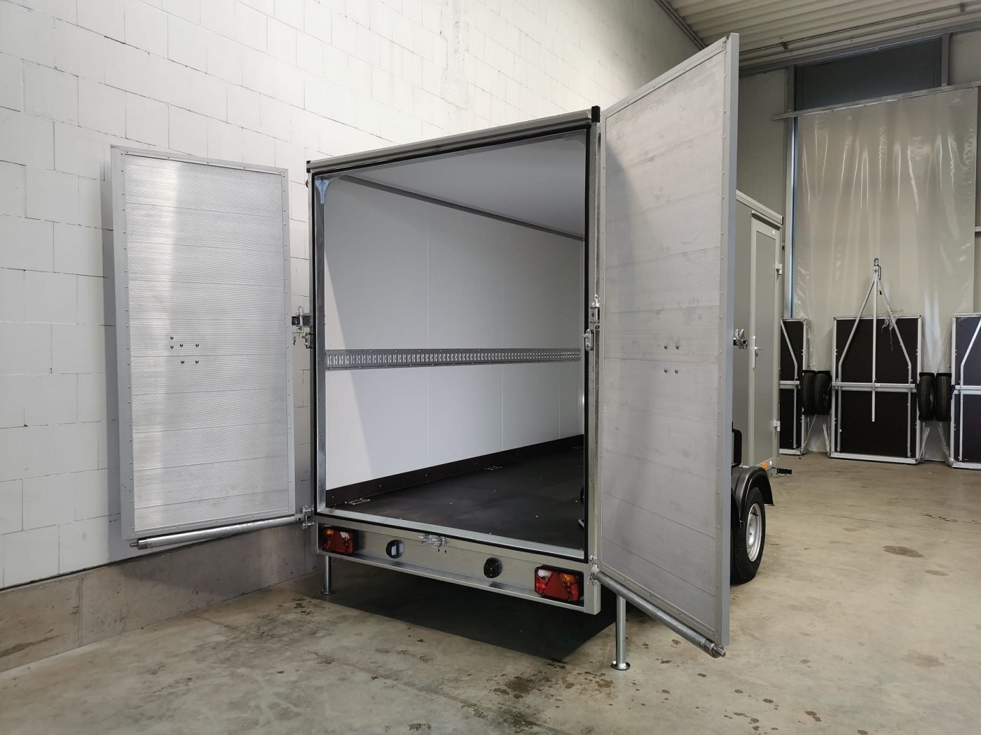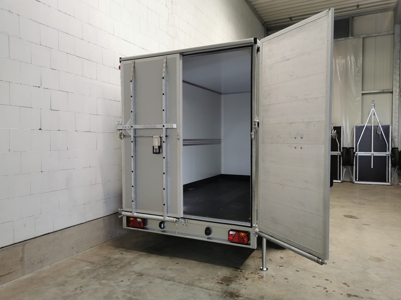Kofferanhänger mit Türklappenkombination bestehend aus 2 Rampen und Doppelflügeltür zusätzlicher Seitentür und Fenster