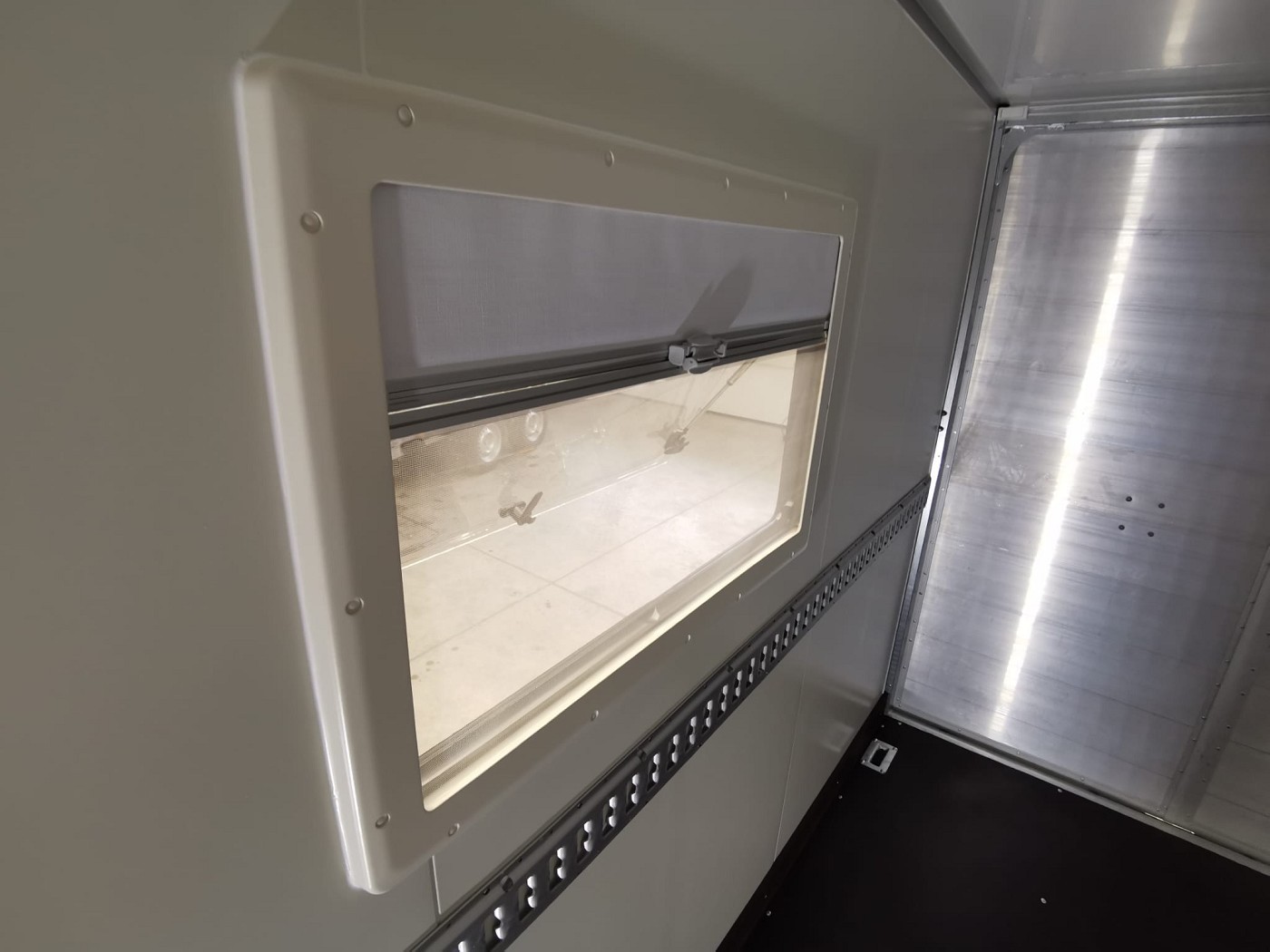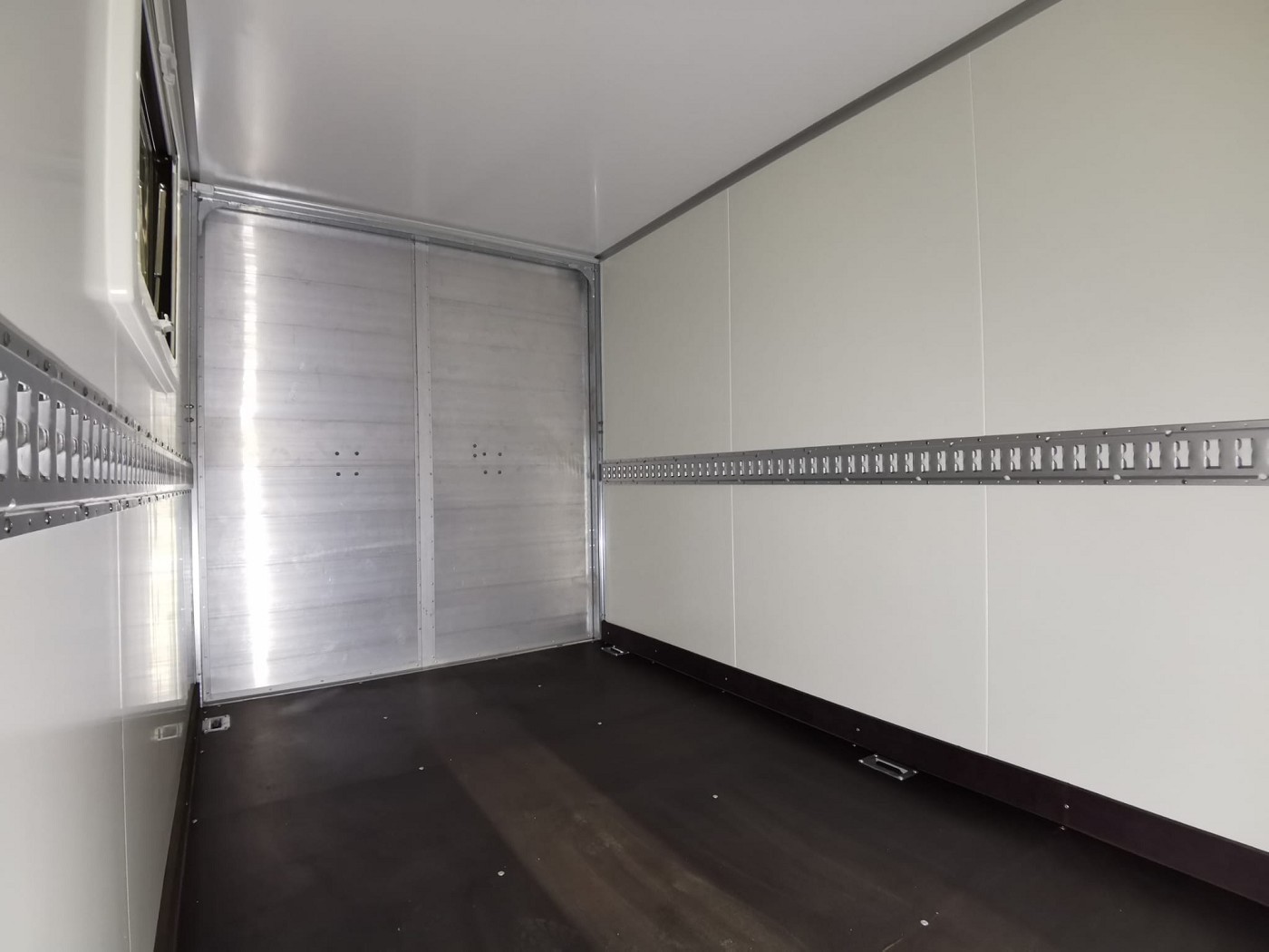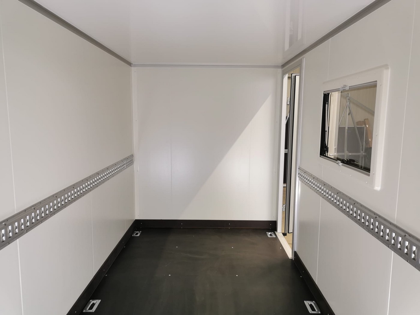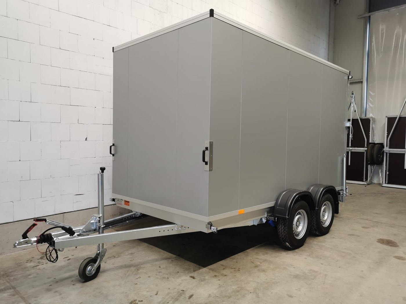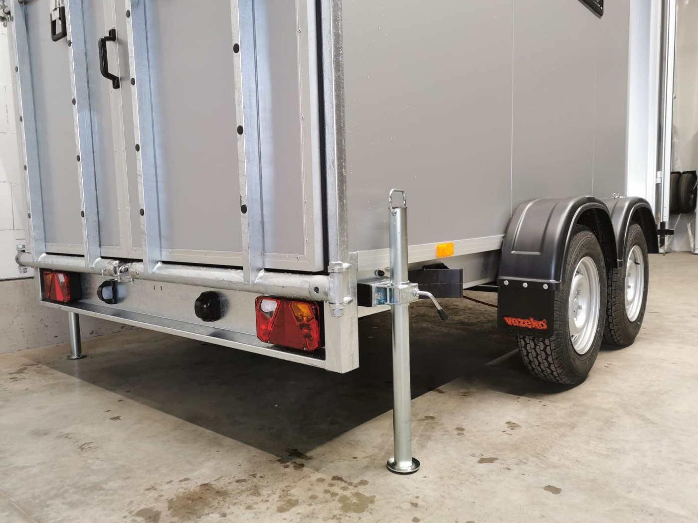 Kofferanhänger mit Türklappenkombination bestehend aus 2 Rampen und Doppelflügeltür zusätzlicher Seitentür und Fenster