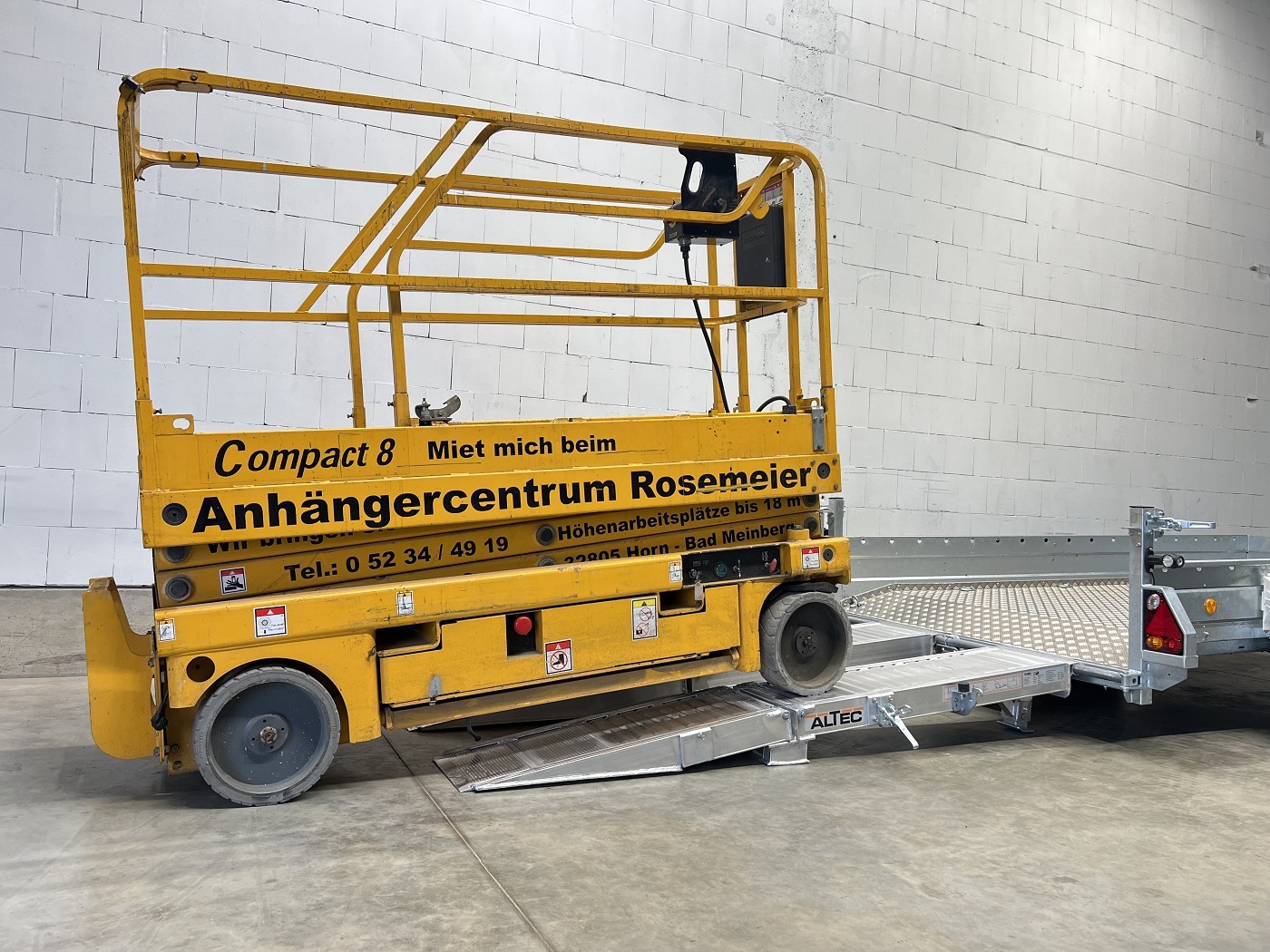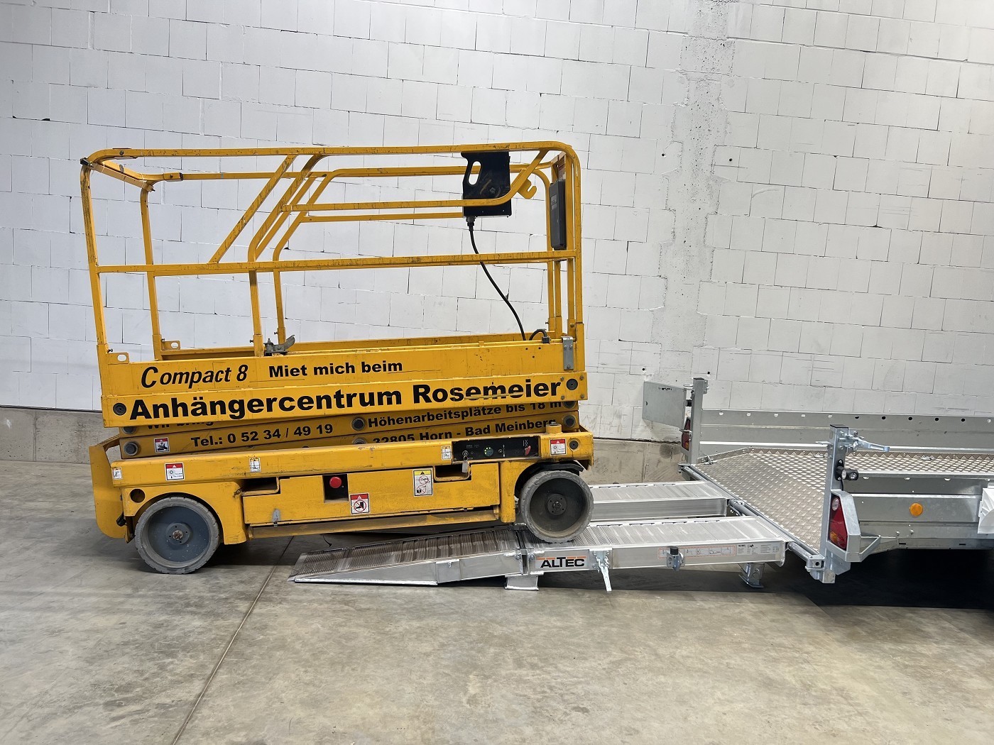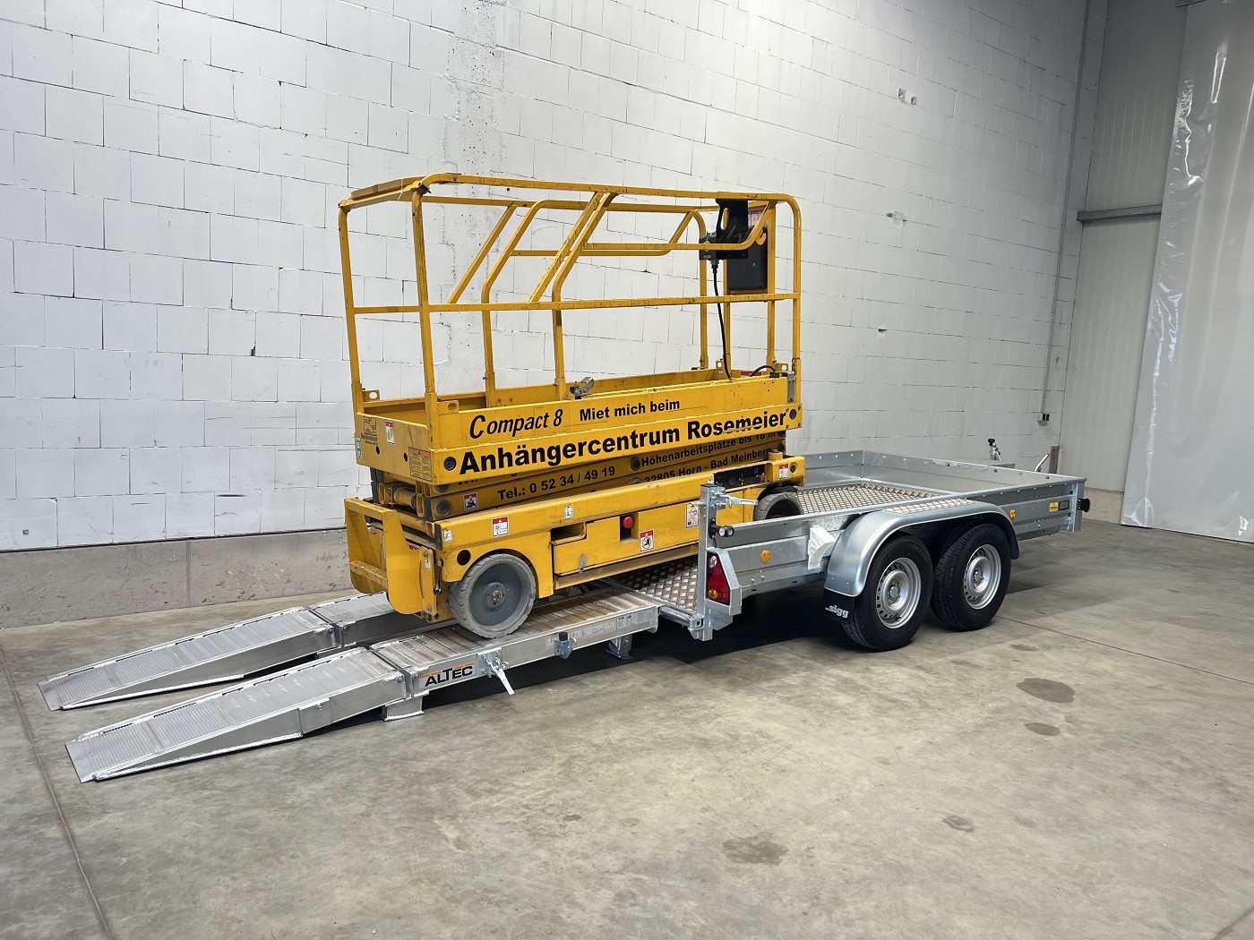 Baumaschinentransporter mit Faltrampen und extrem niedrigem Auffahrwinkel – ideal für den Transport von Scherenbühnen und anderen Machinen mit geringer Bodenfreiheit