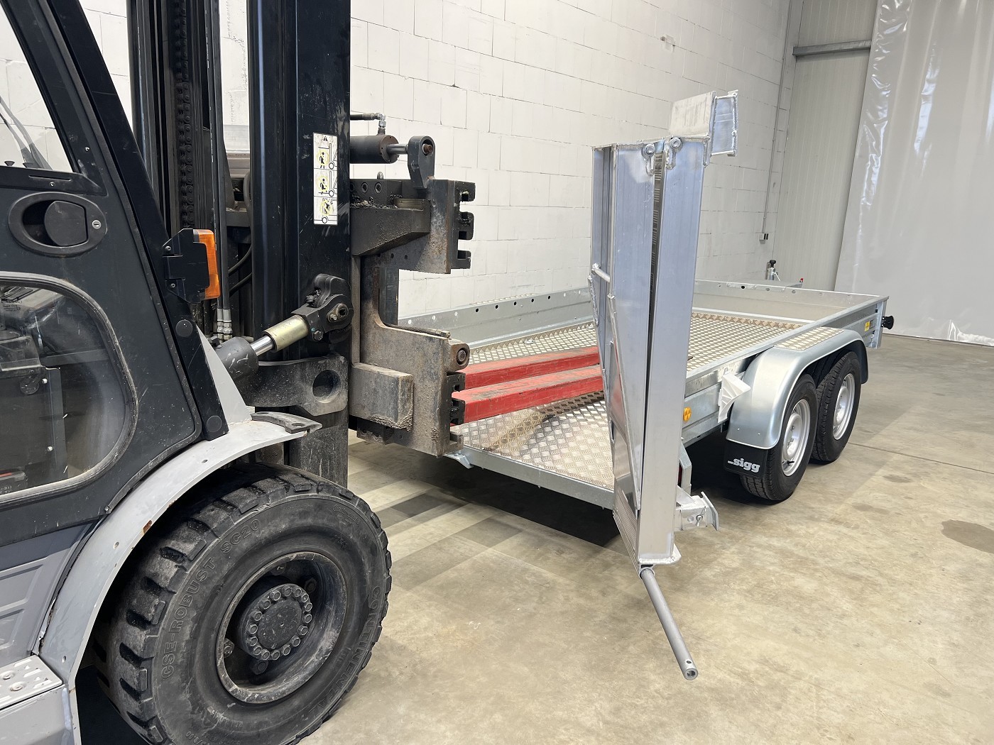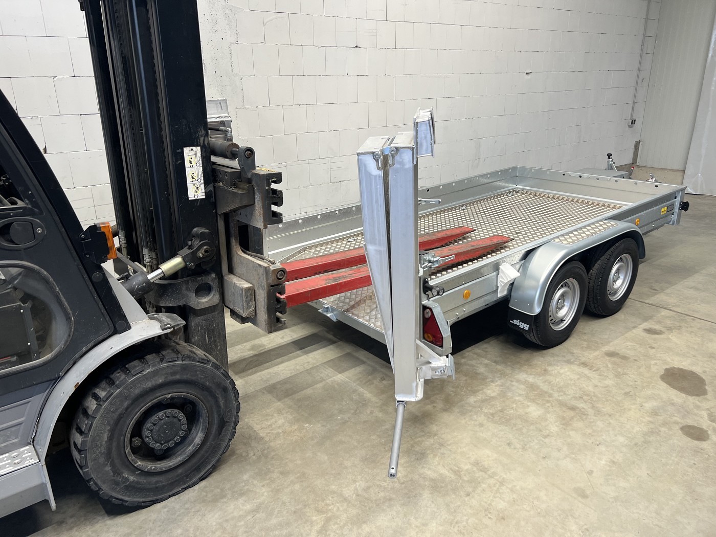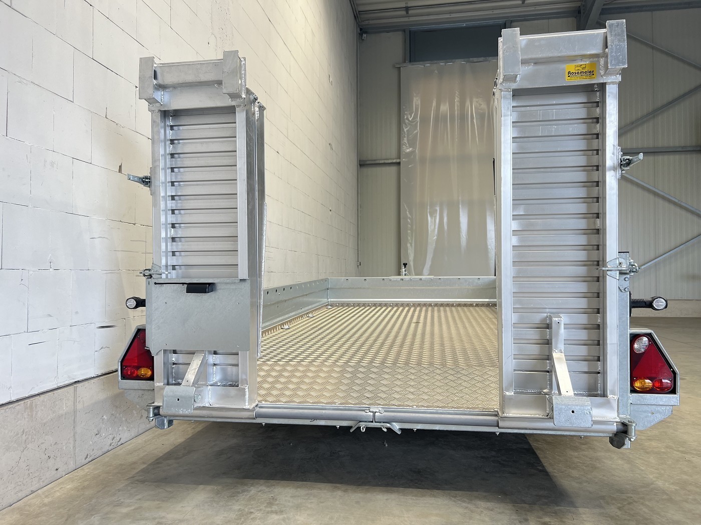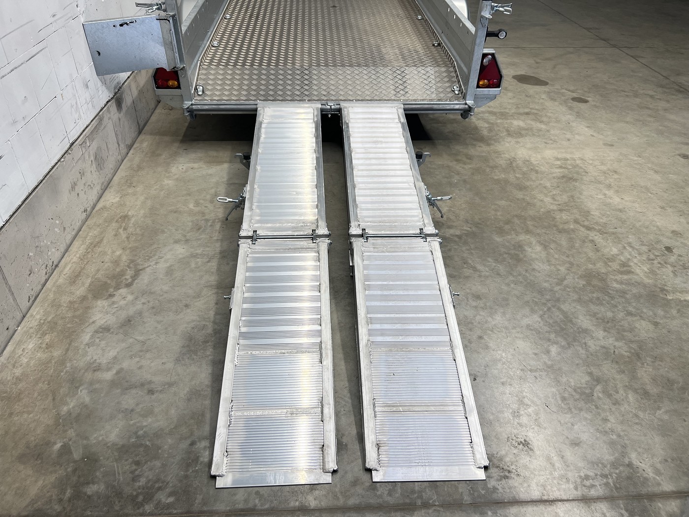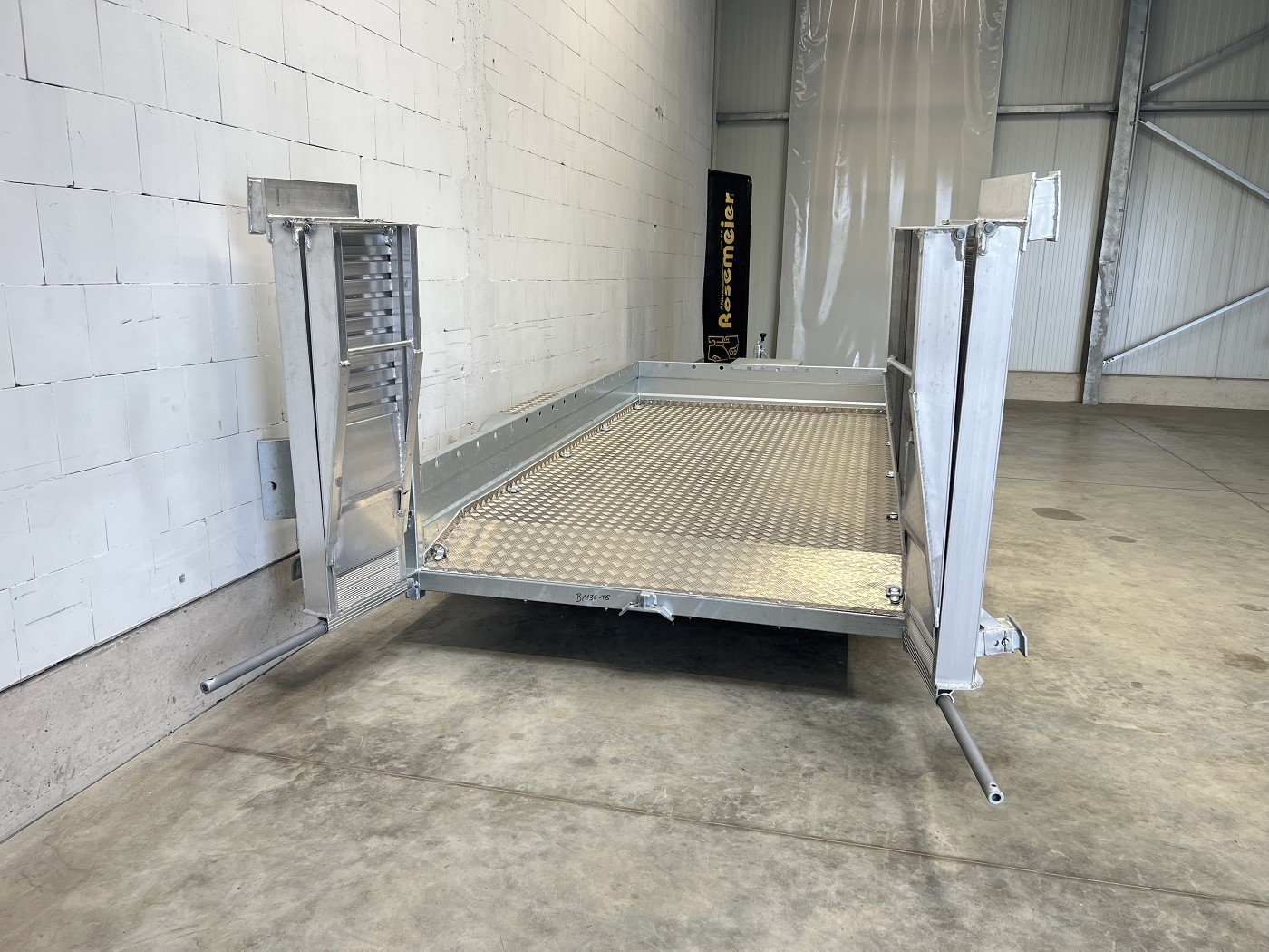 Schwenk- und klappbare Auffahrrampen (zum Patent angemeldet) – so lässt sich der Anhänger auch von hinten mit einem Stapler beladen – lassen sich in der Spurweite mühelos verstellen