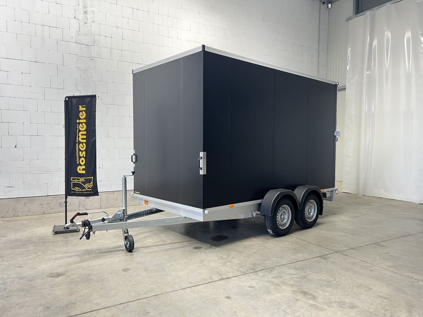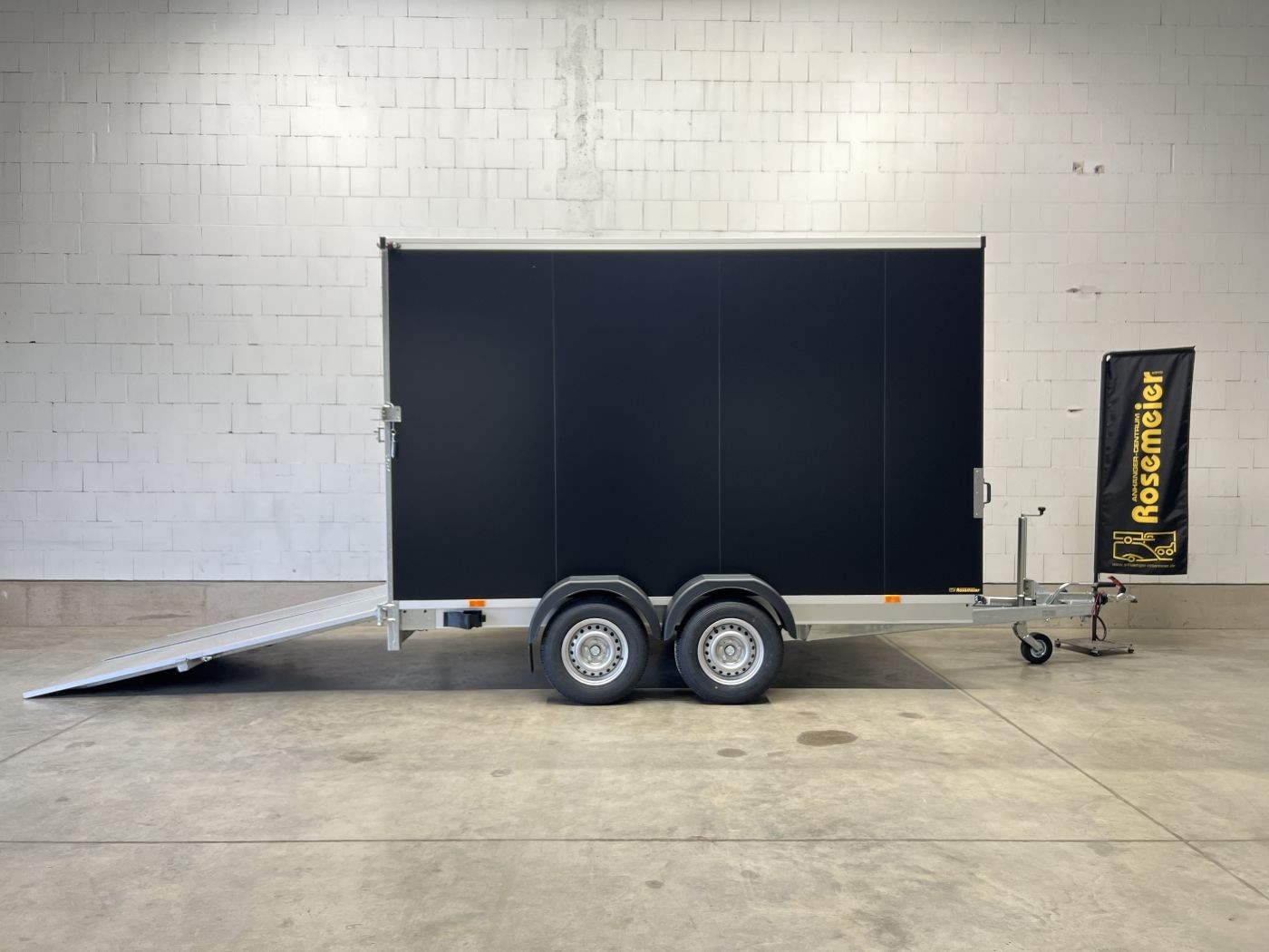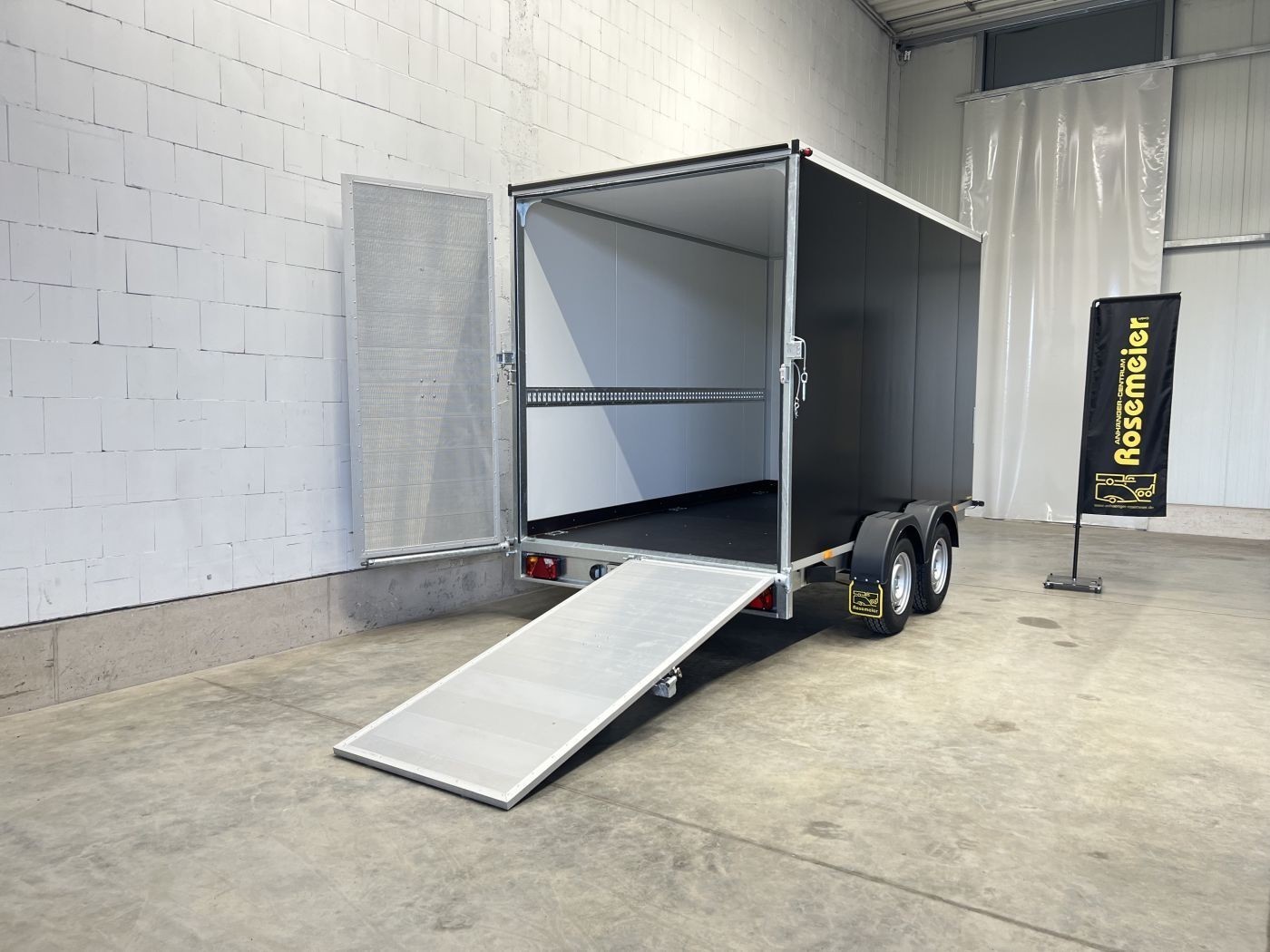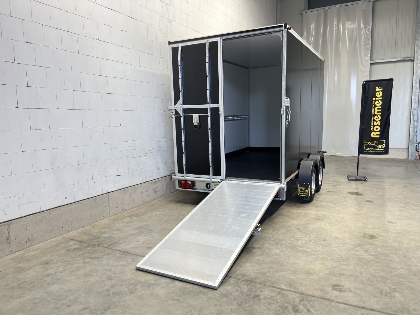 Kofferanhänger in schwarz mit Kombi-Auffahrrampe und Sonderhöhe