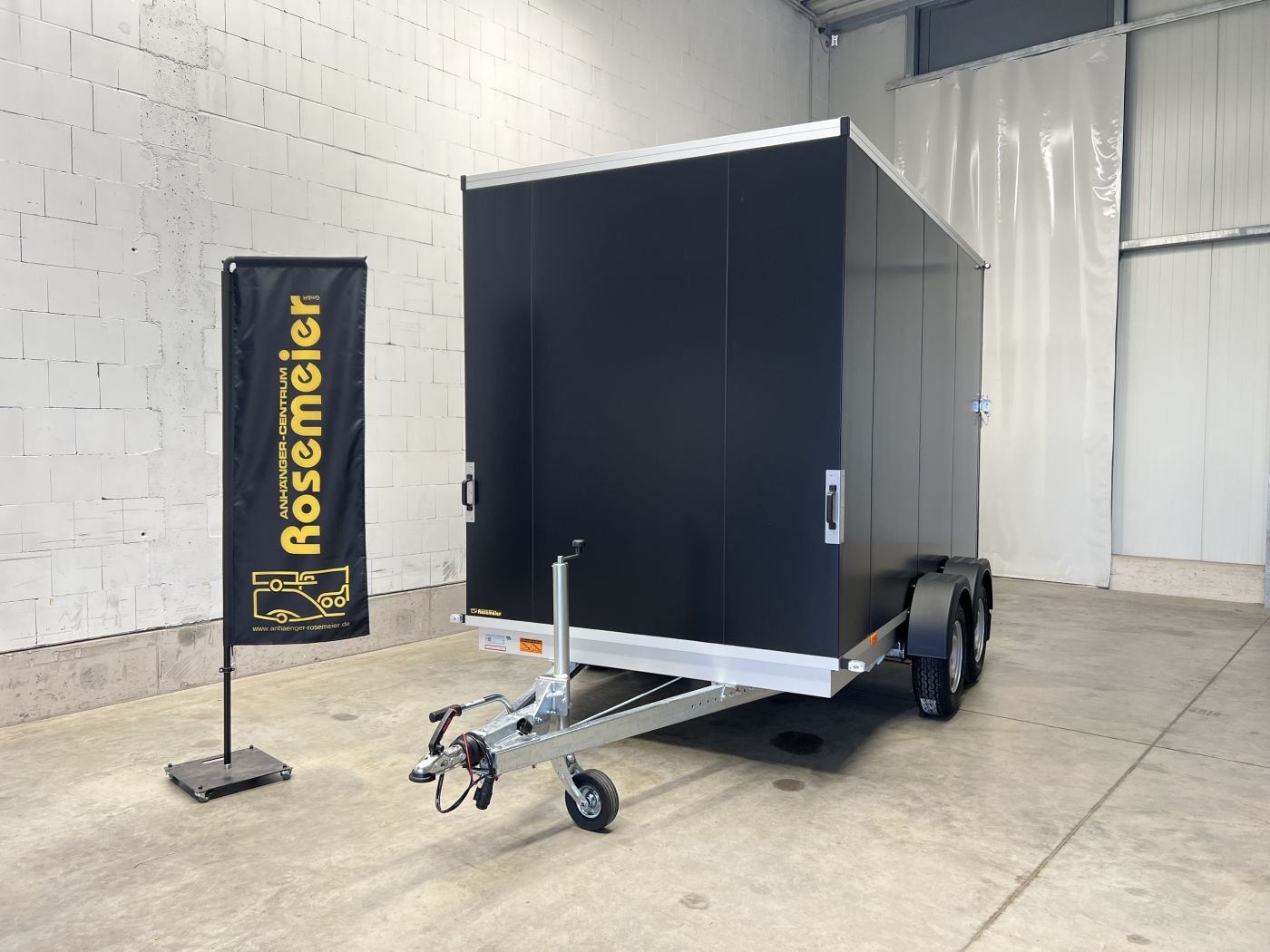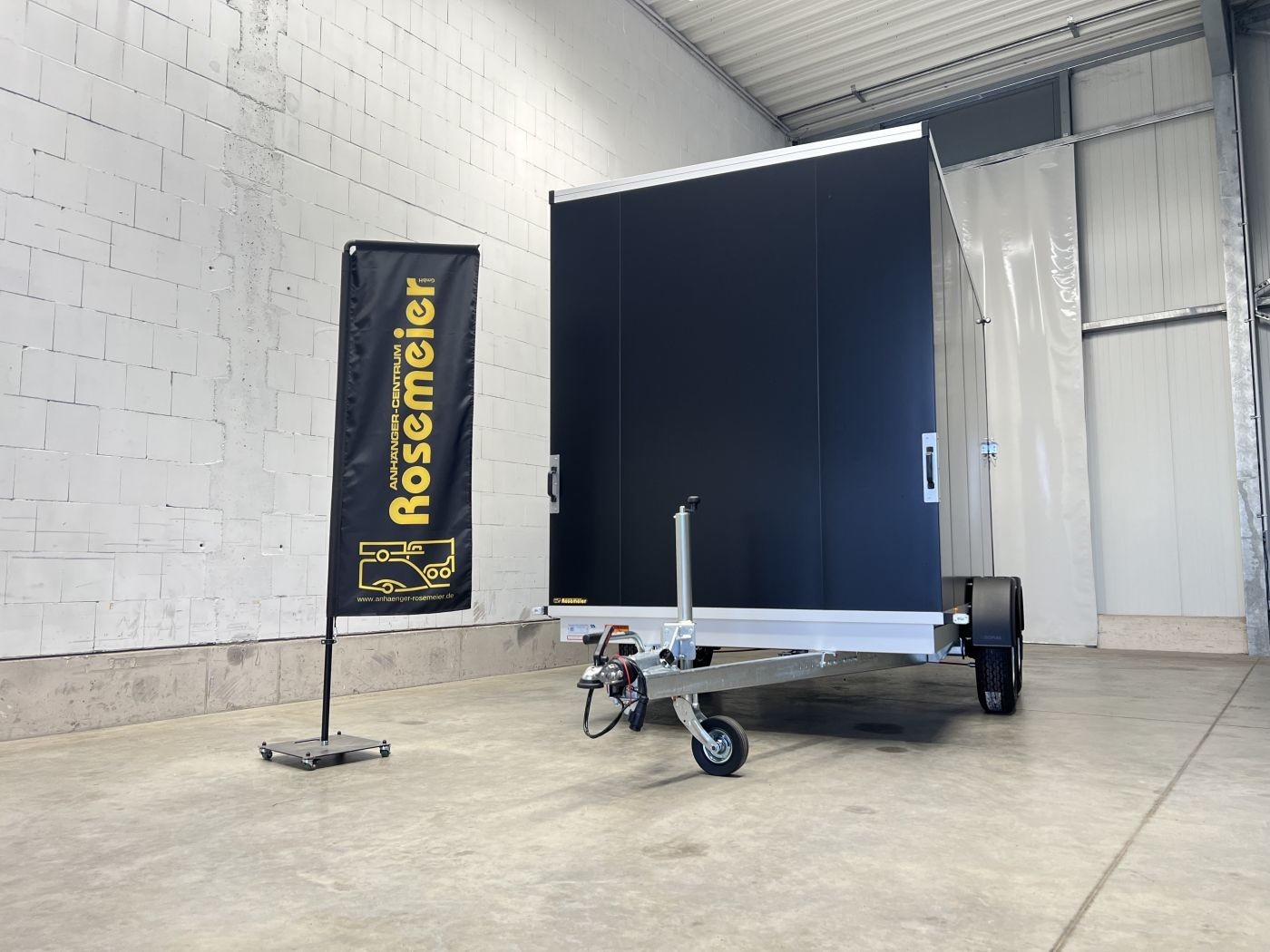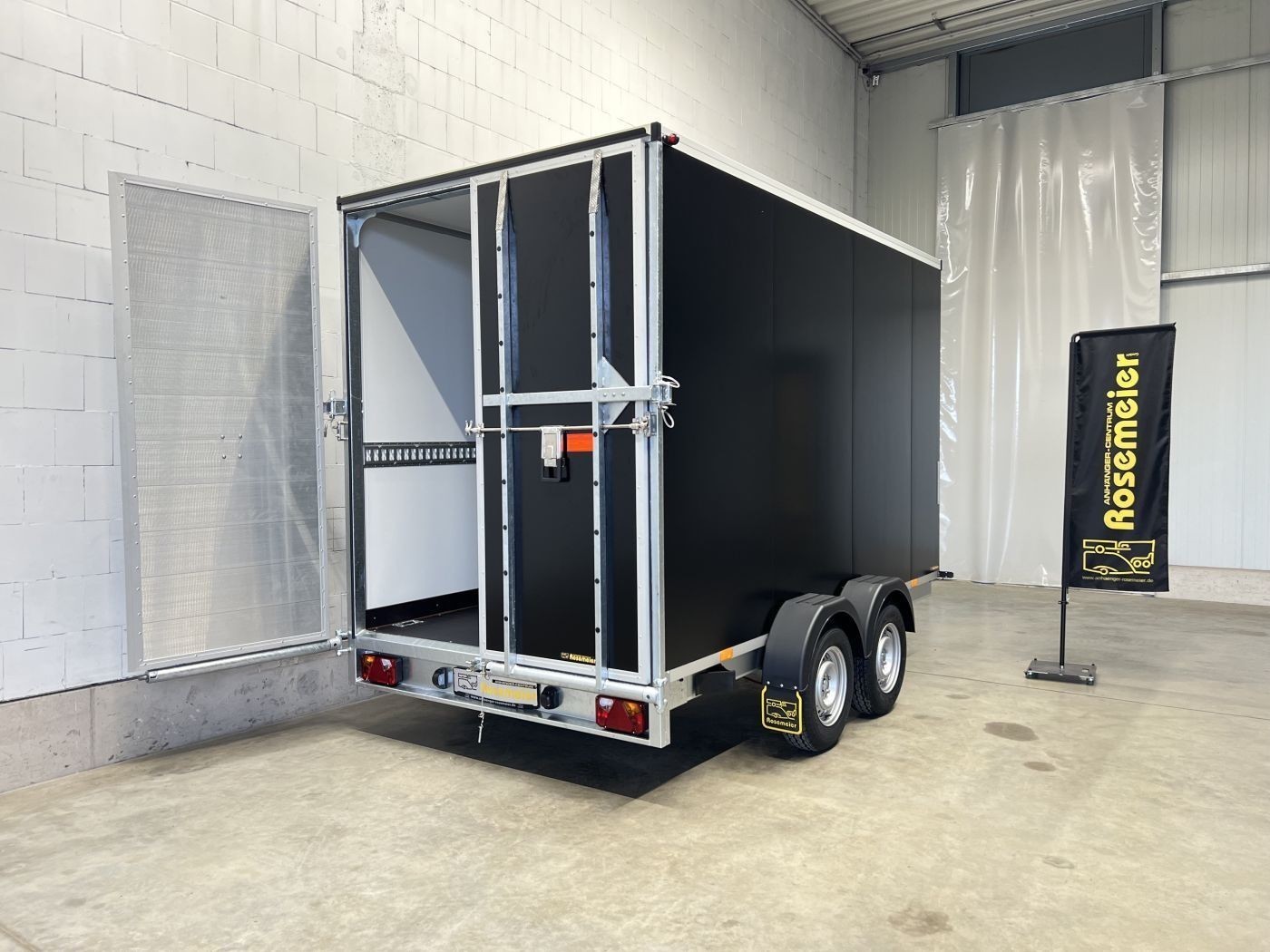 Kofferanhänger in schwarz mit Kombi-Auffahrrampe und Sonderhöhe