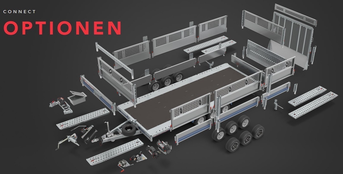 Der anpassungsfähige Multifunktionsanhänger für gewerbliche Güter und Fahrzeuge aller Art. Jede verfügbare Option ist flexibel an- oder abbaubar und ermöglicht so eine bedarfsgerechte Anpassung Ihres Connect´s für nahezu jeden Einsatzbereich.