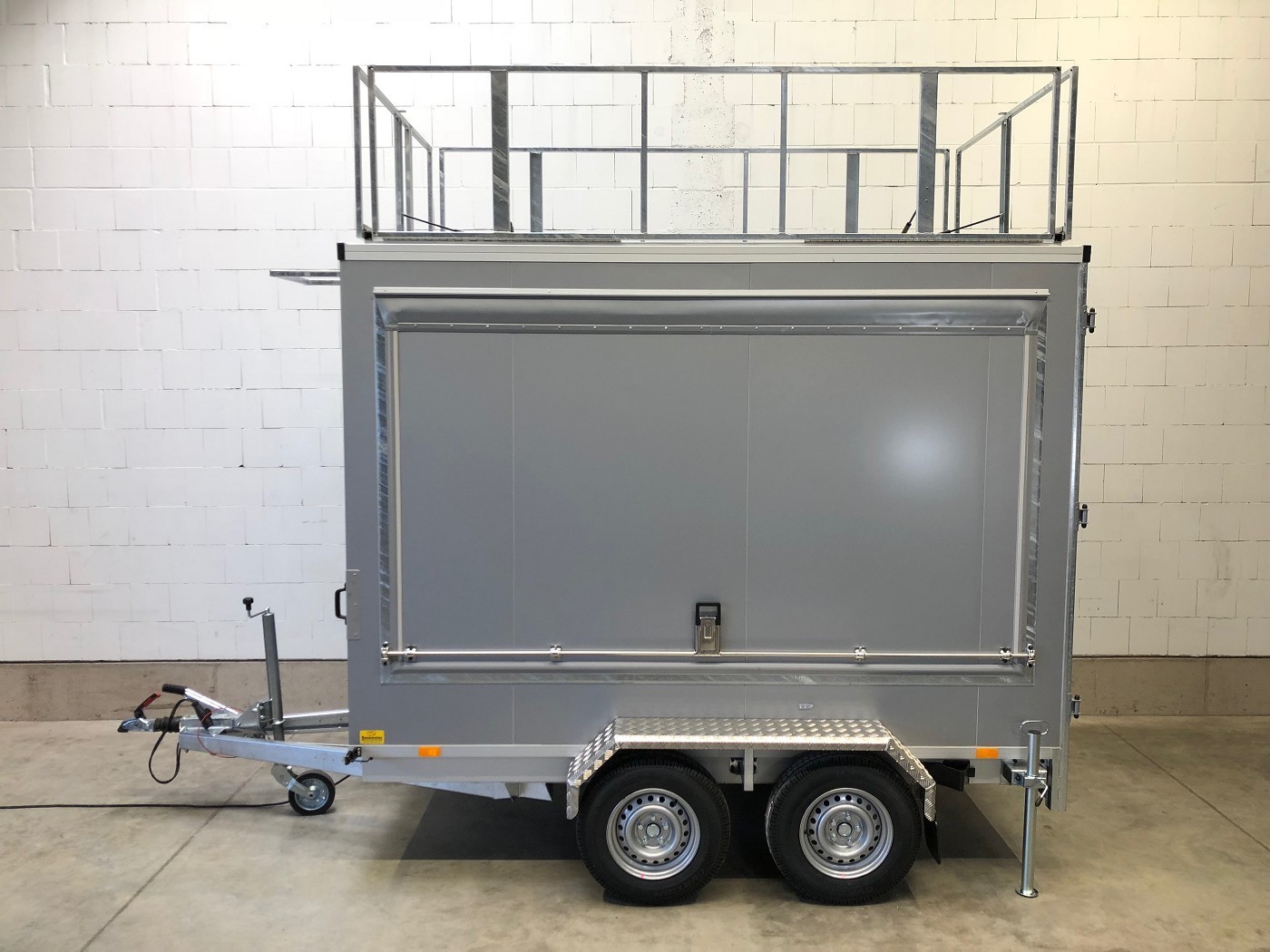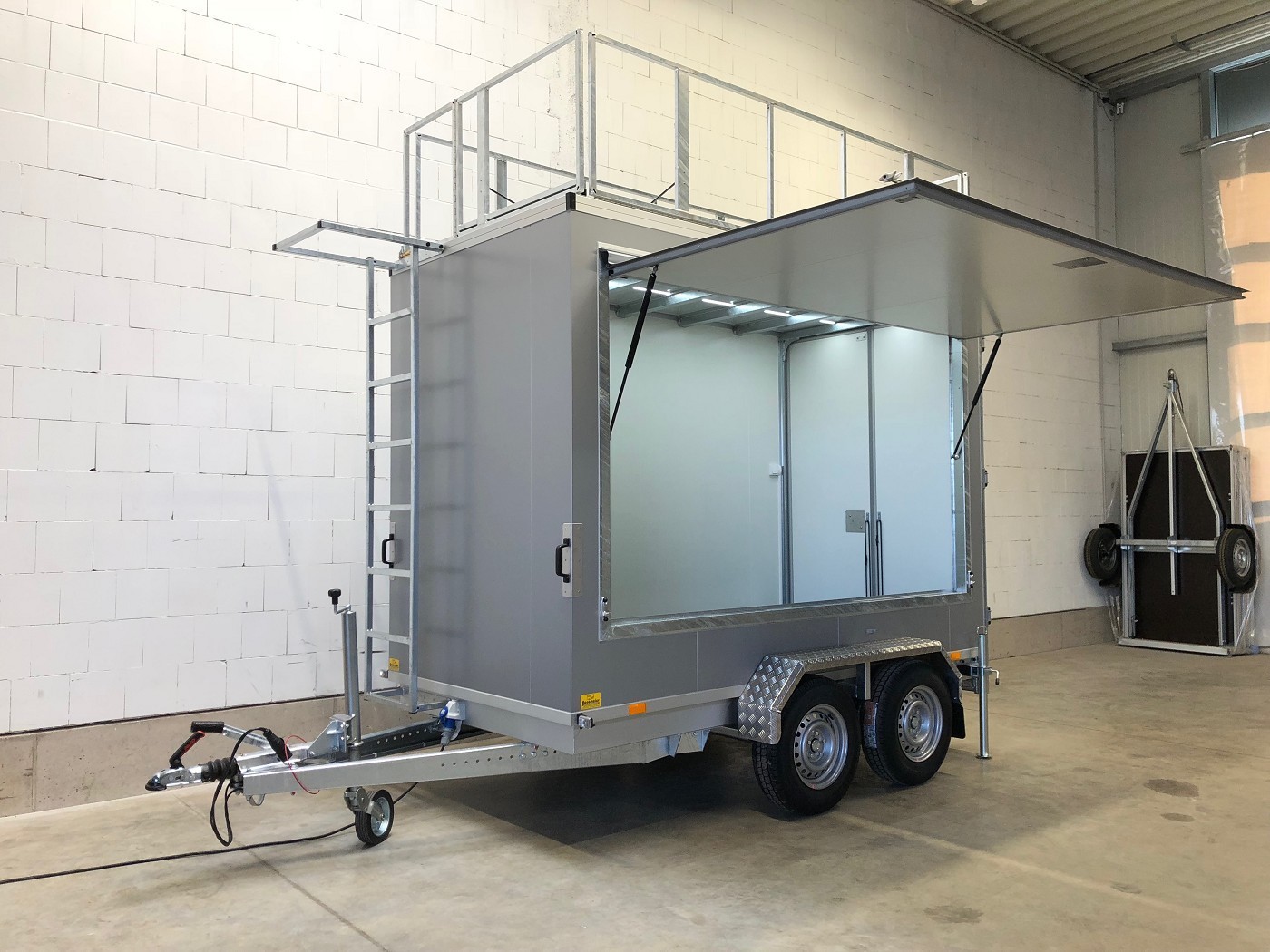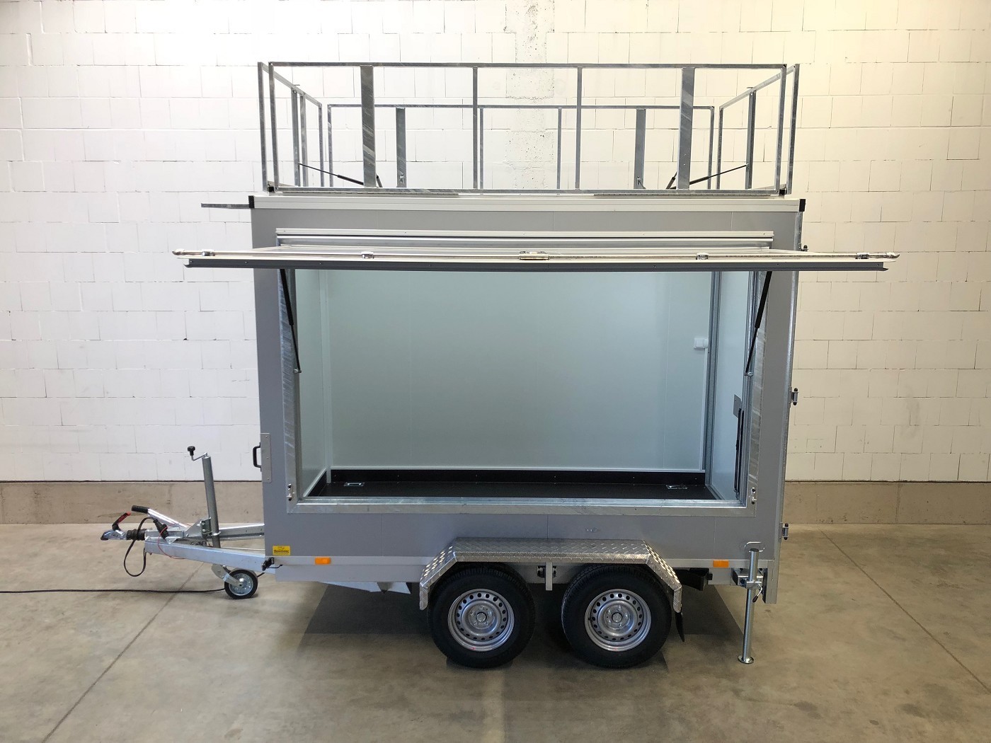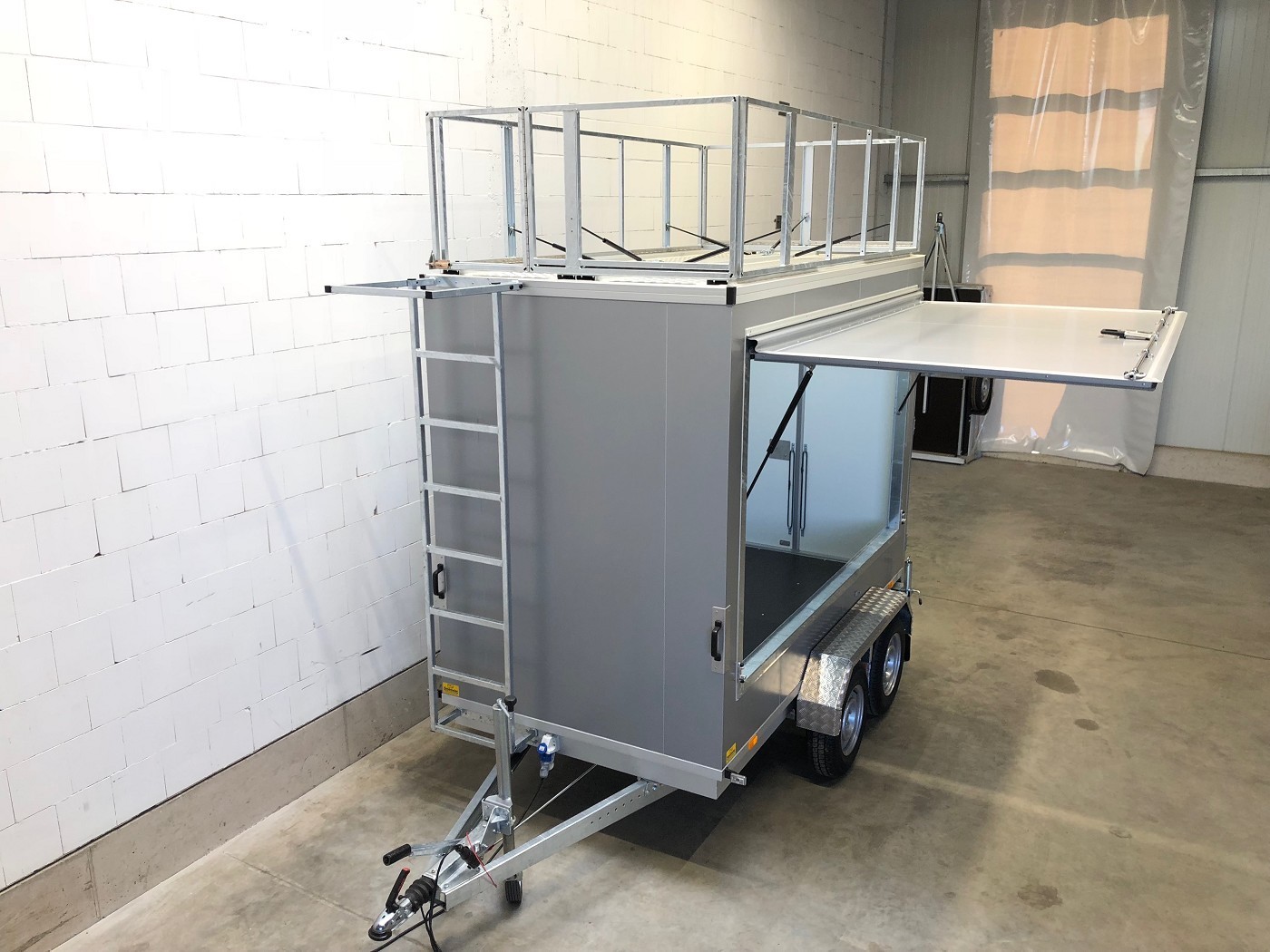 Kofferanhänger / Promotionanhänger mit Verkaufsklappe, begehbarem Dach und Dachwerbetafeln