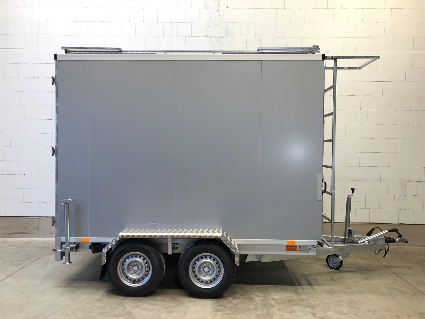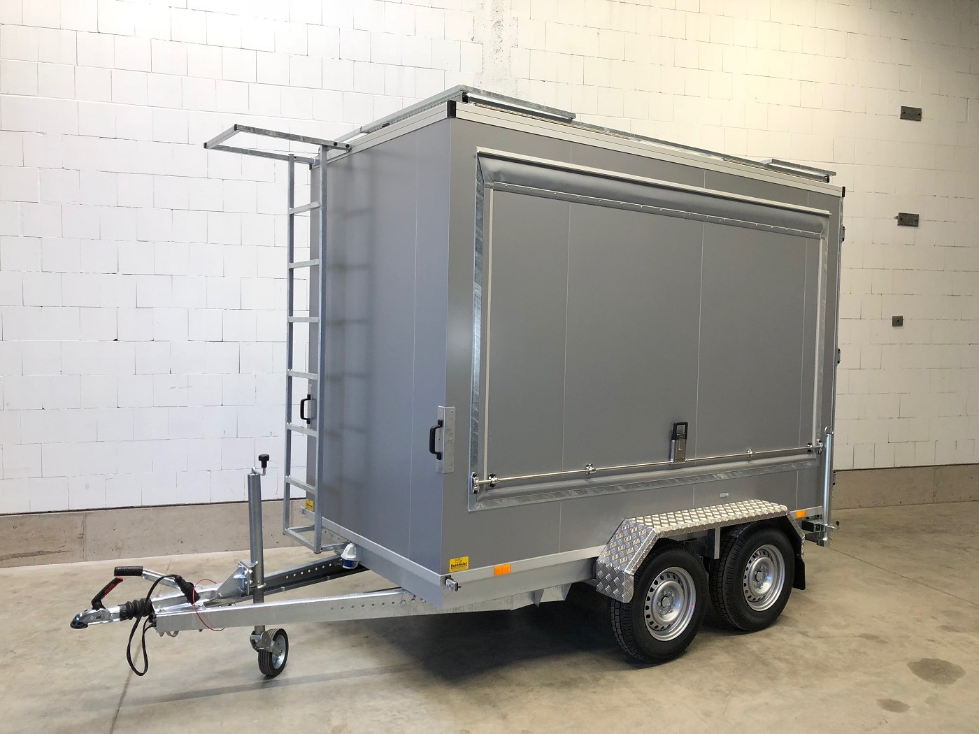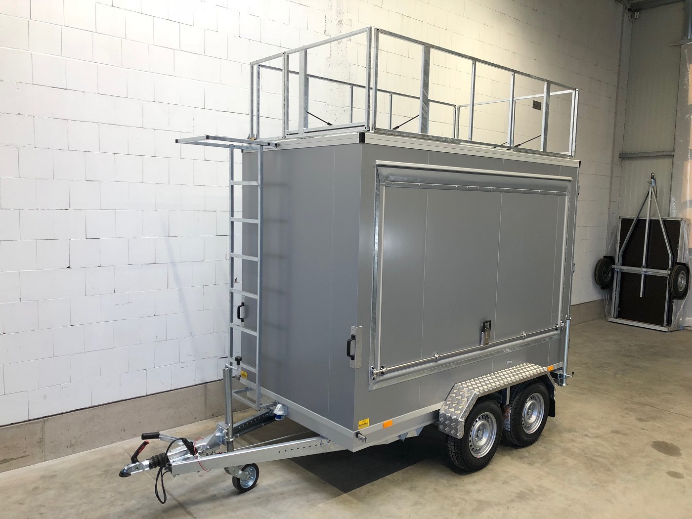 Kofferanhänger / Promotionanhänger mit Verkaufsklappe, begehbarem Dach und Dachwerbetafeln