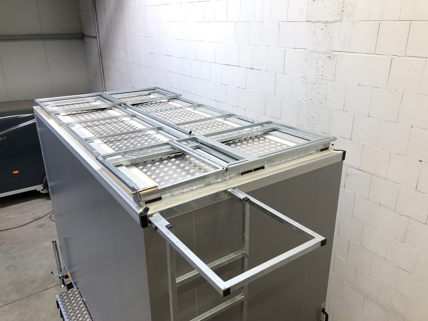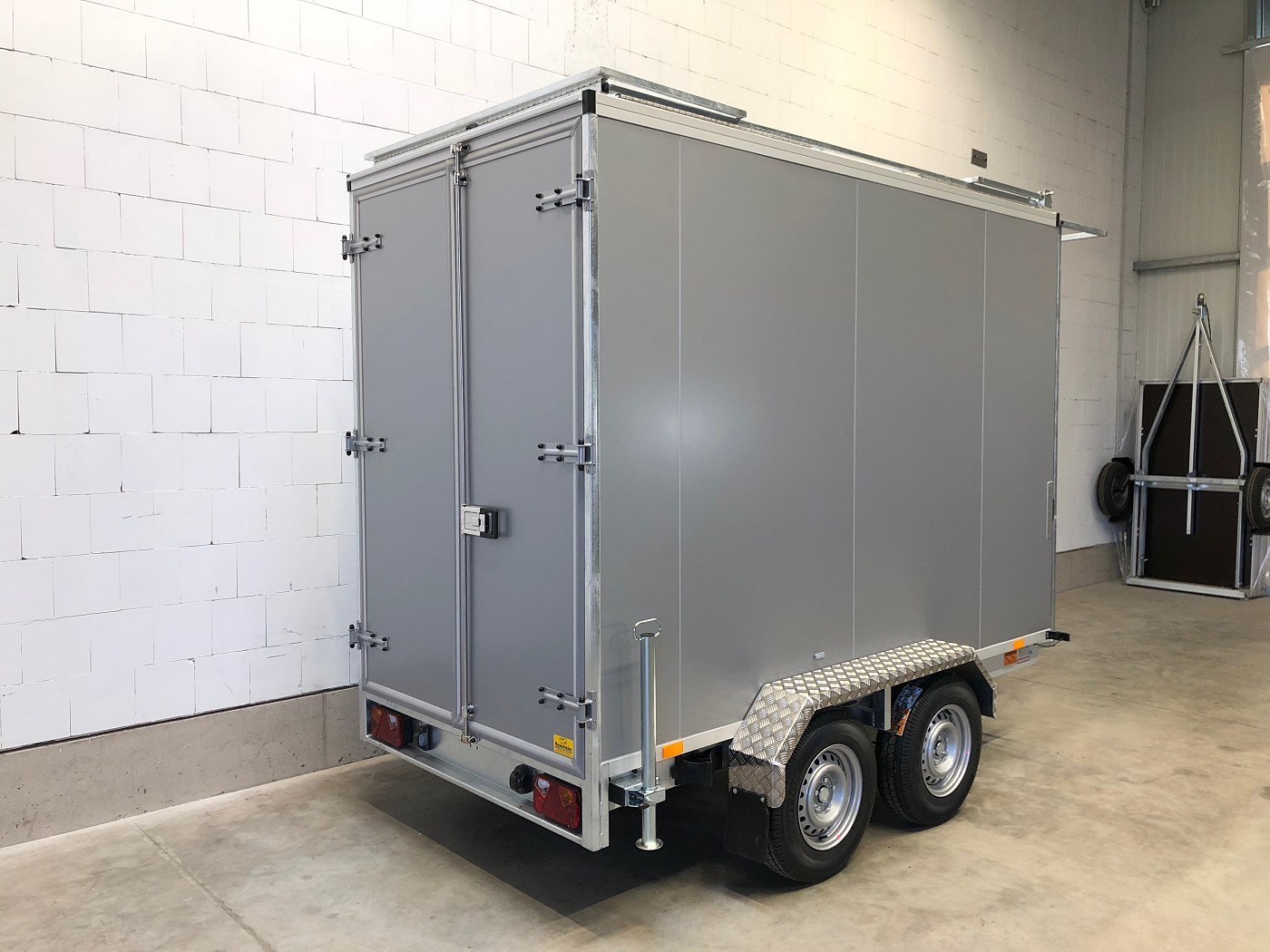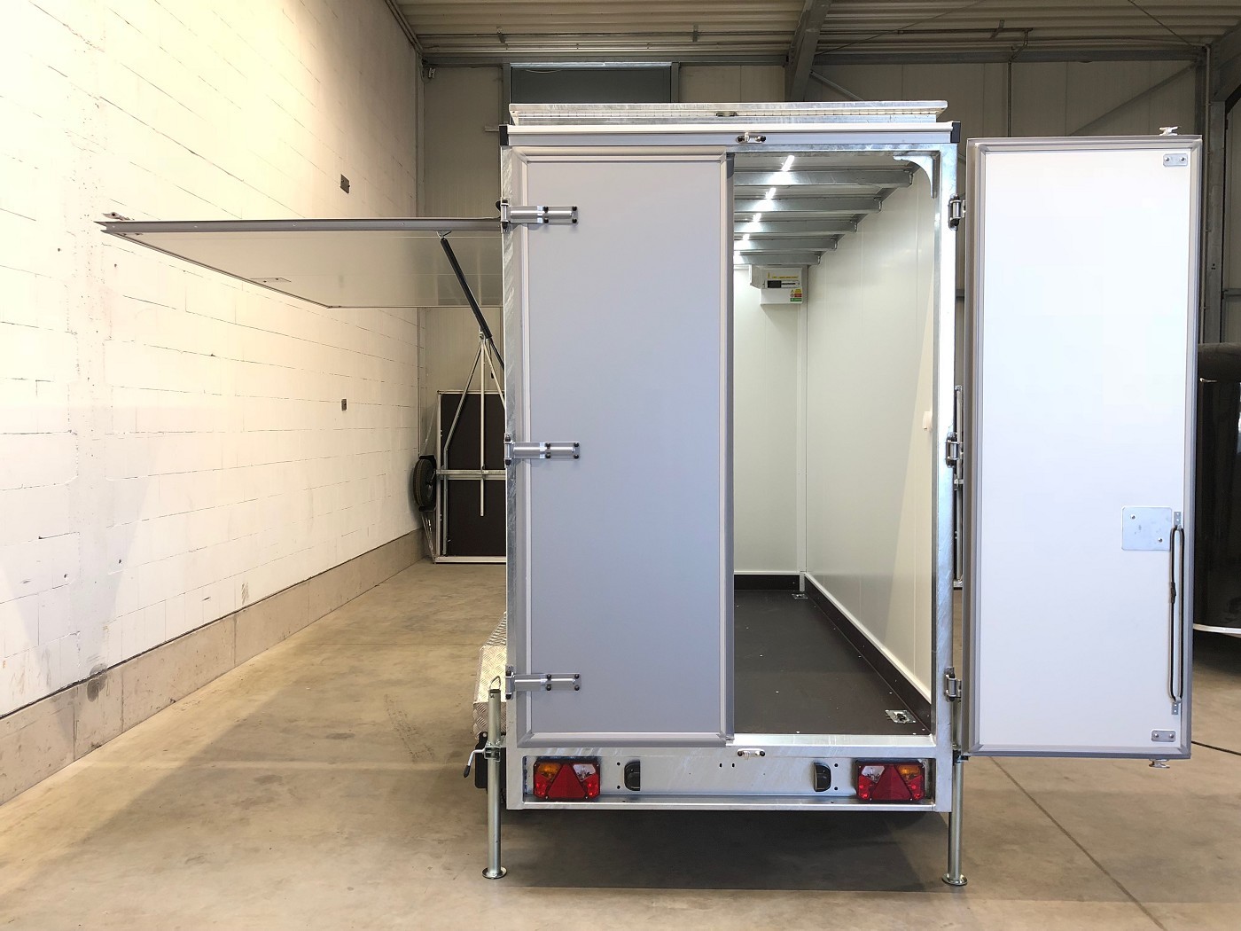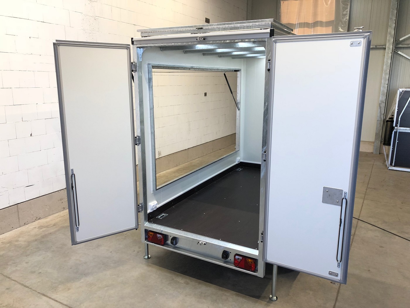 Kofferanhänger / Promotionanhänger mit Verkaufsklappe, begehbarem Dach und Dachwerbetafeln