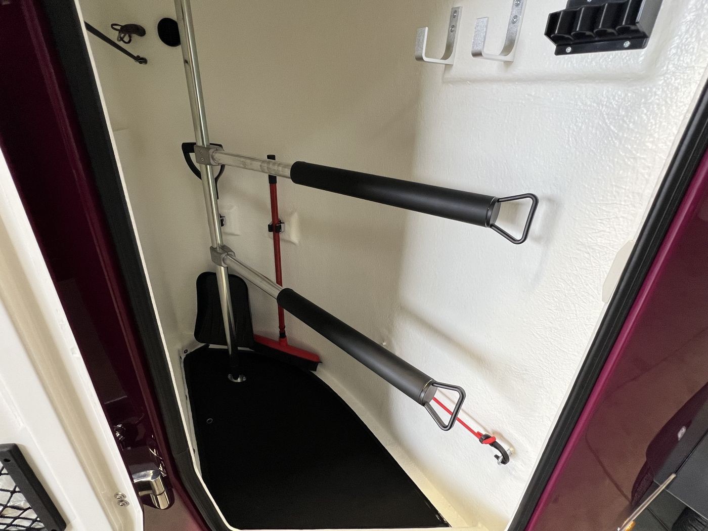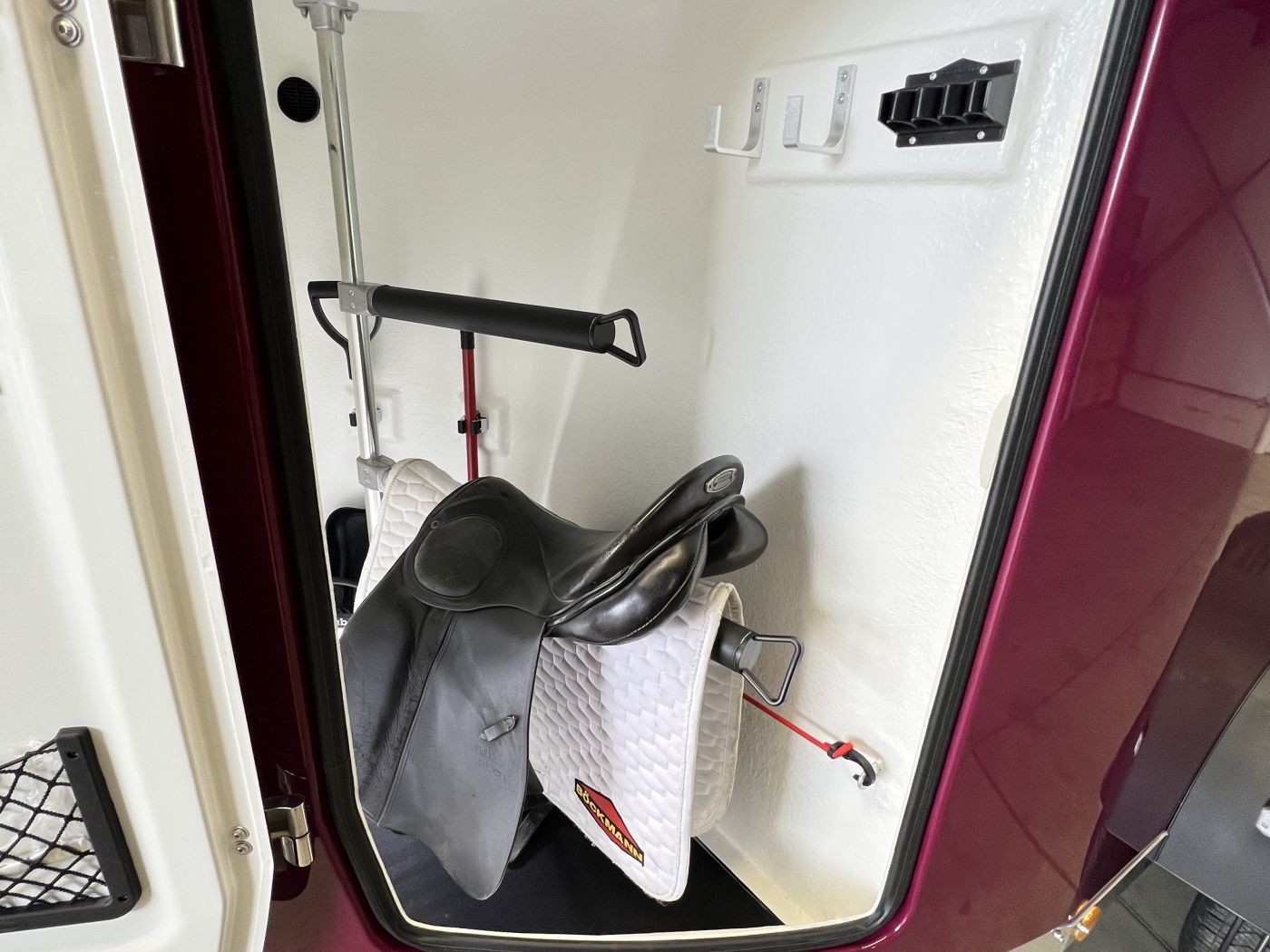 · Sattelkammer – von außen zugänglich mit ausziehbaren Sattelhaltern, Besen mit Teleskopstiel, Schaufel, kleinem Gepäcknetz sowie Spiegel an der Türinnenseite, kleiner Regalboden, große Trensenhaken, Gertenhalter, Klapphocker und LED-Beleuchtung