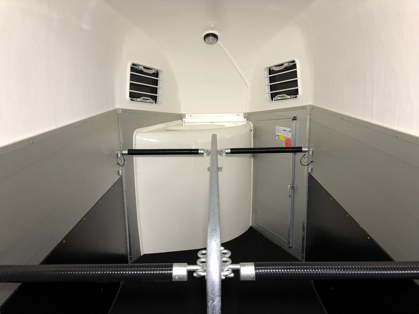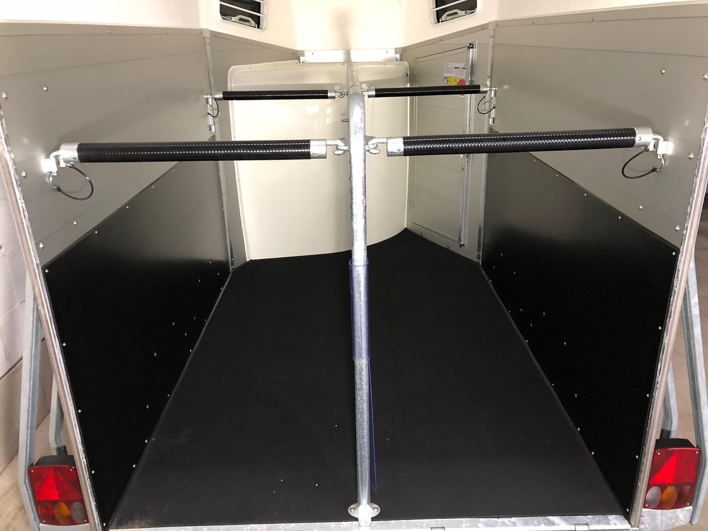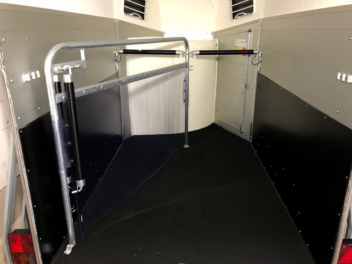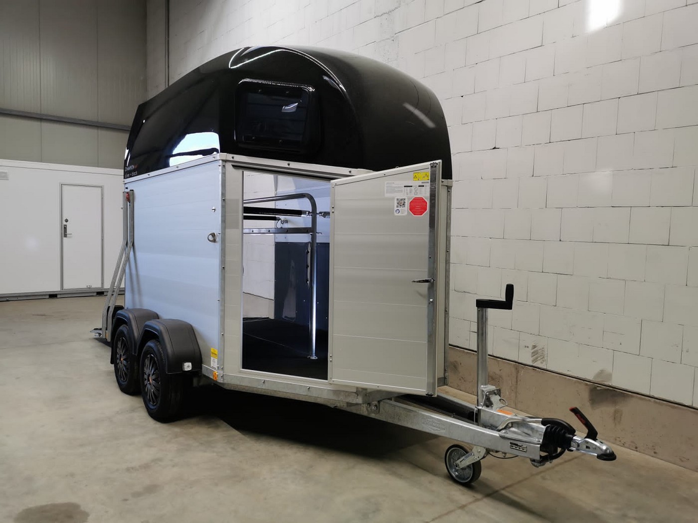 Pferdeanhänger mit Sattelkammer, Aluboden, Trittschutz, Trittleisten auf der Beladeklappe, Radstoßdämpfer für die 100 km/h-Abnahme