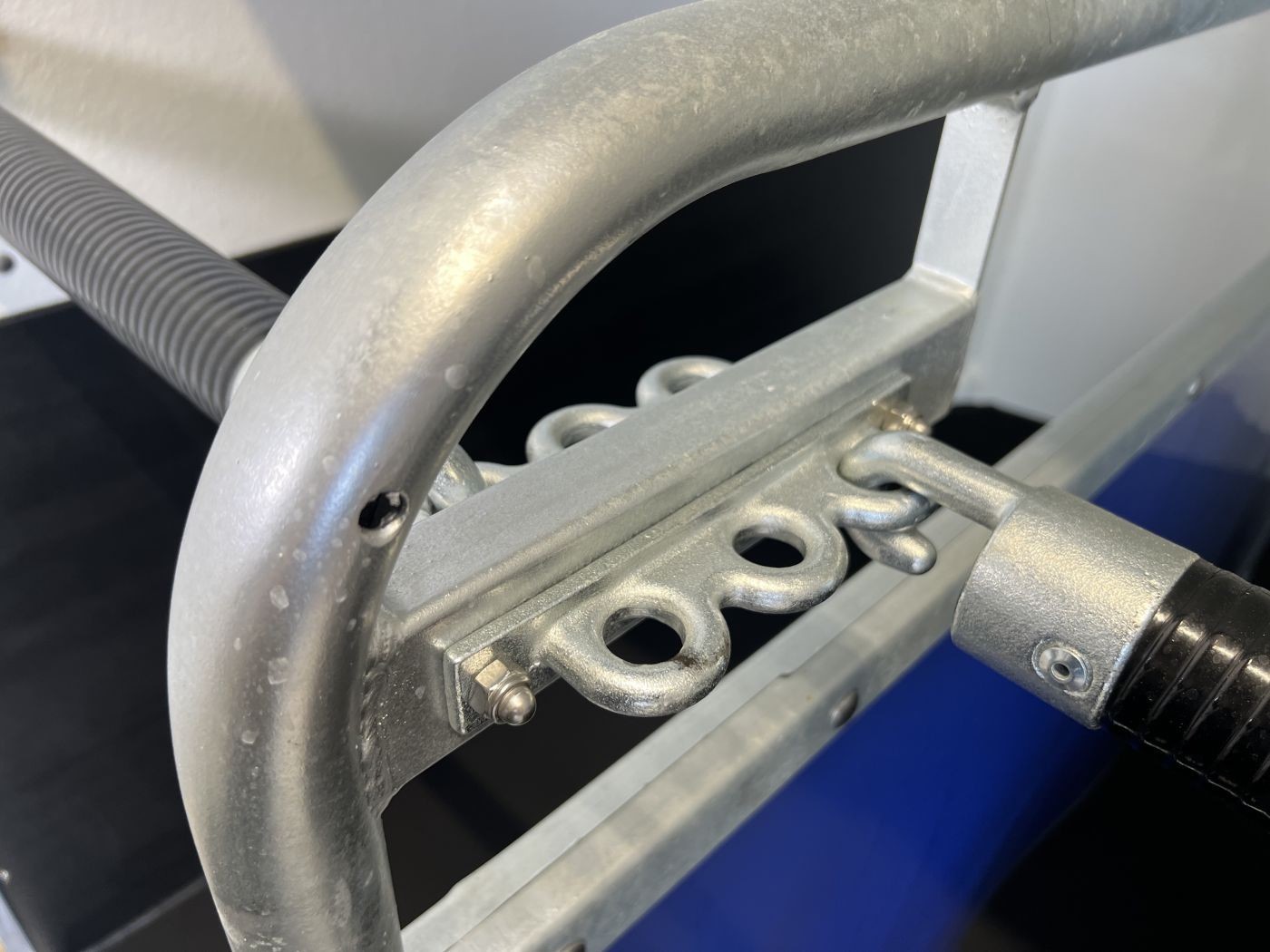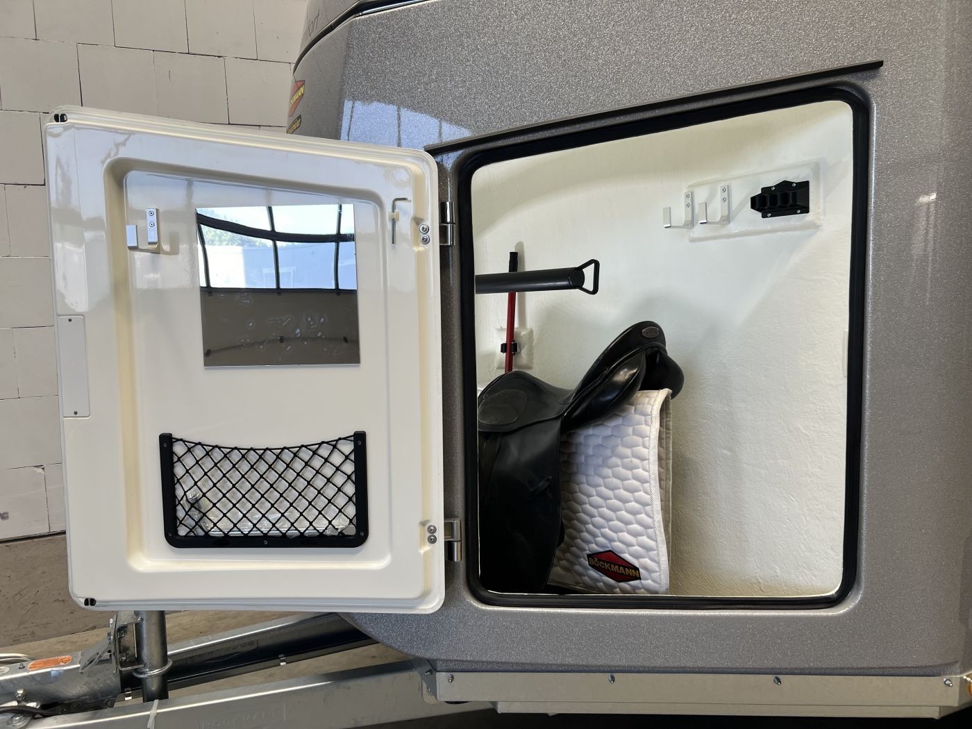 • Sattelkammer ausgestattet mit: Schaufel und Besen, Trensenhalter, div. Haken, Ablagefach, Staunetz, Spiegel und Leine zum Aufhängen von Decken