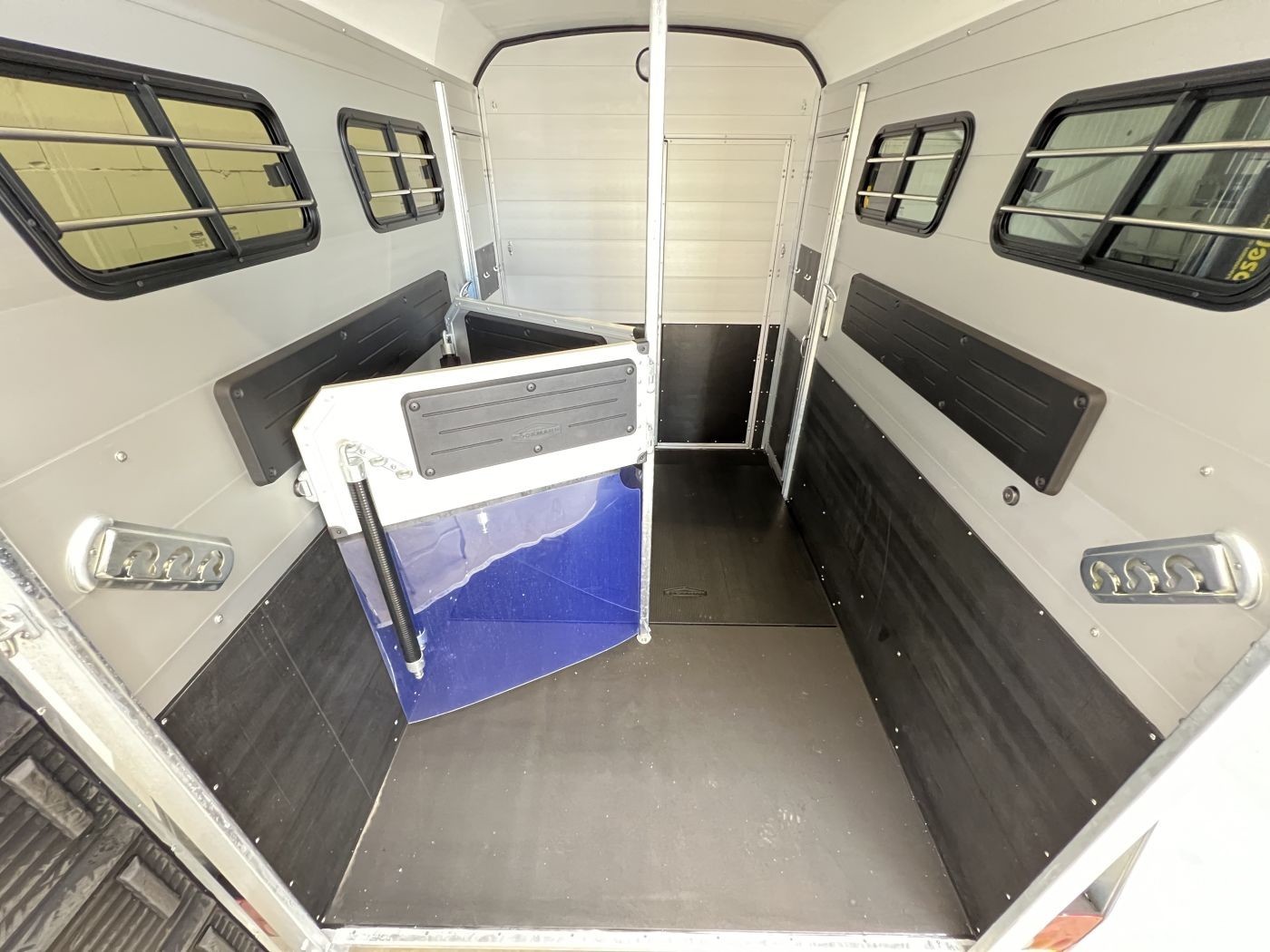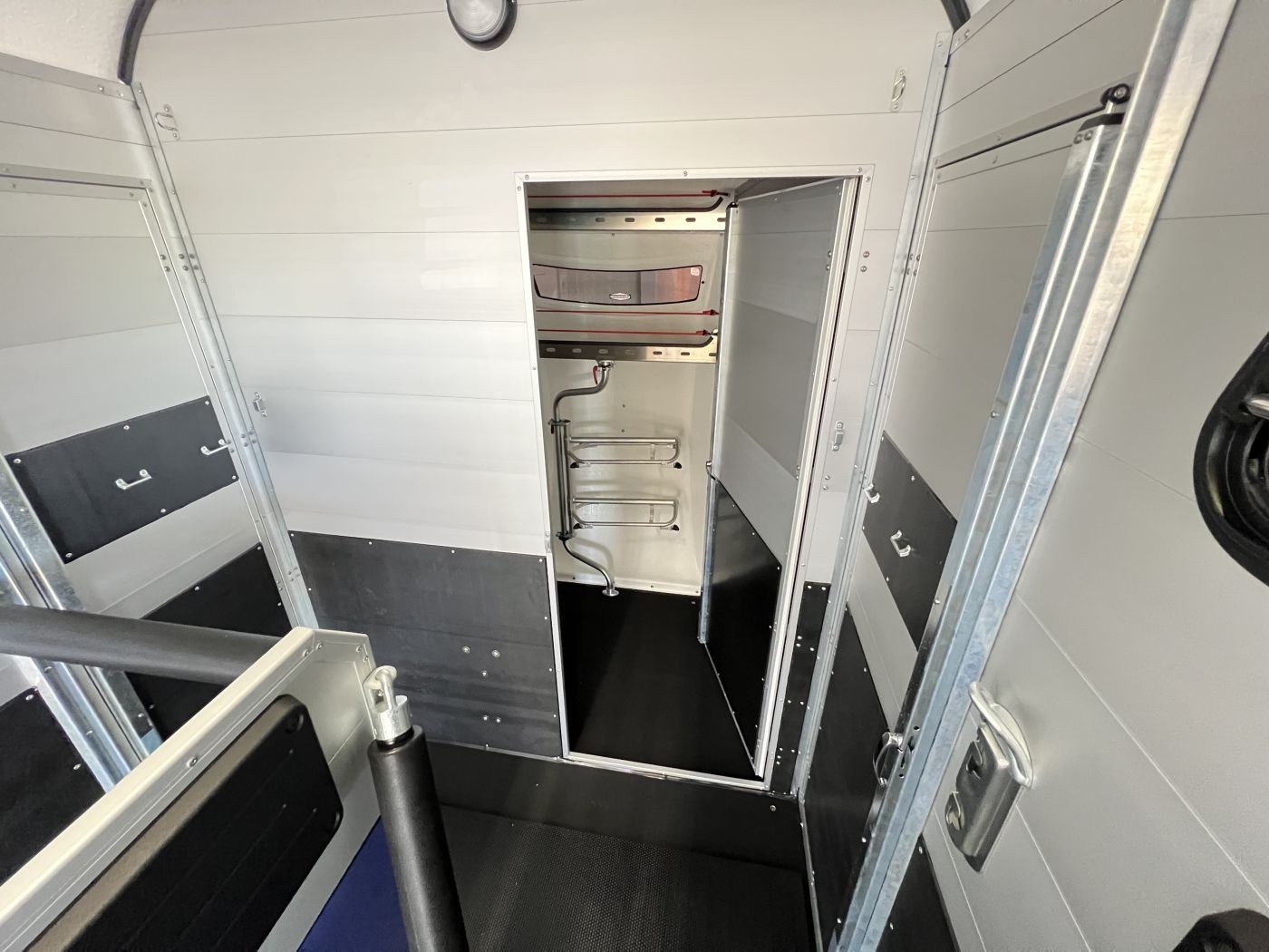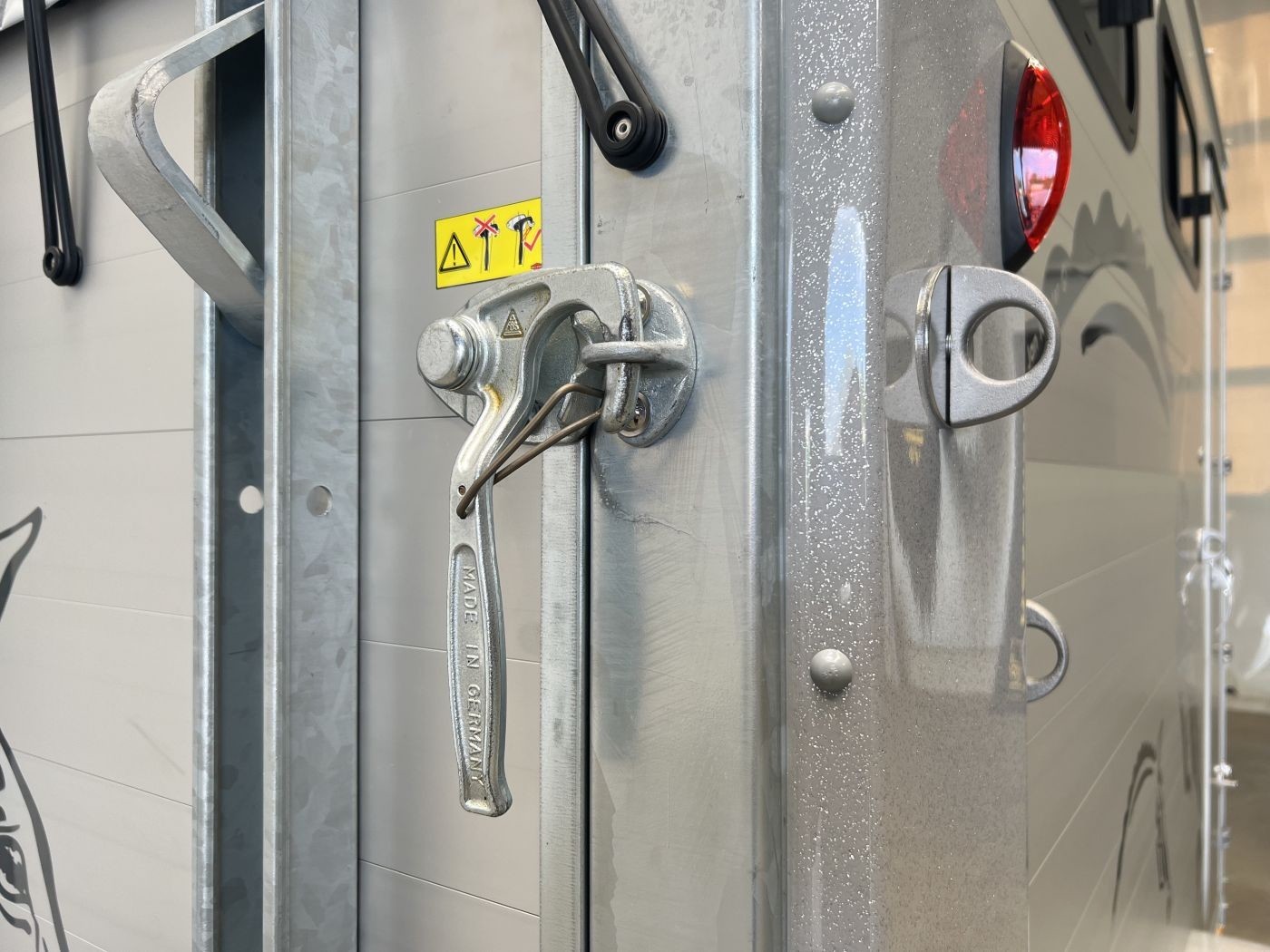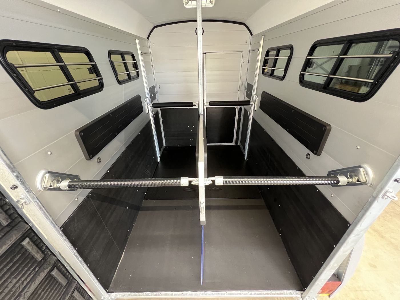 Ein besonderes Highlight der Modelle ist der neue Portax Lichtbogen, der das direkte Blendlicht auf ein Minimum reduziert. Dadurch werden Störfaktoren für Ihre Pferde deutlich verringert und alle Beteiligten gelangen entspannt ans Ziel. Doch auch im Innenraum hat sich einiges im Vergleich zum Vorgängermodell getan. Ein Exzenterspanner und ein Magnetfeststeller sind absolute Neuheiten, die im Pferderaum das Handling vereinfachen. So ermöglicht der Exzenterspanner den einfachen Ausbau der Mittelpfosten-Trennwand und ermöglicht so den komfortablen Transport von Stute mit Fohlen. Ein Magnetfeststeller ermöglicht das Feststellen der Trennwand-Flügel auf beiden Seiten und gewährleistet so viel Platz und Sicherheit beim Verladen.