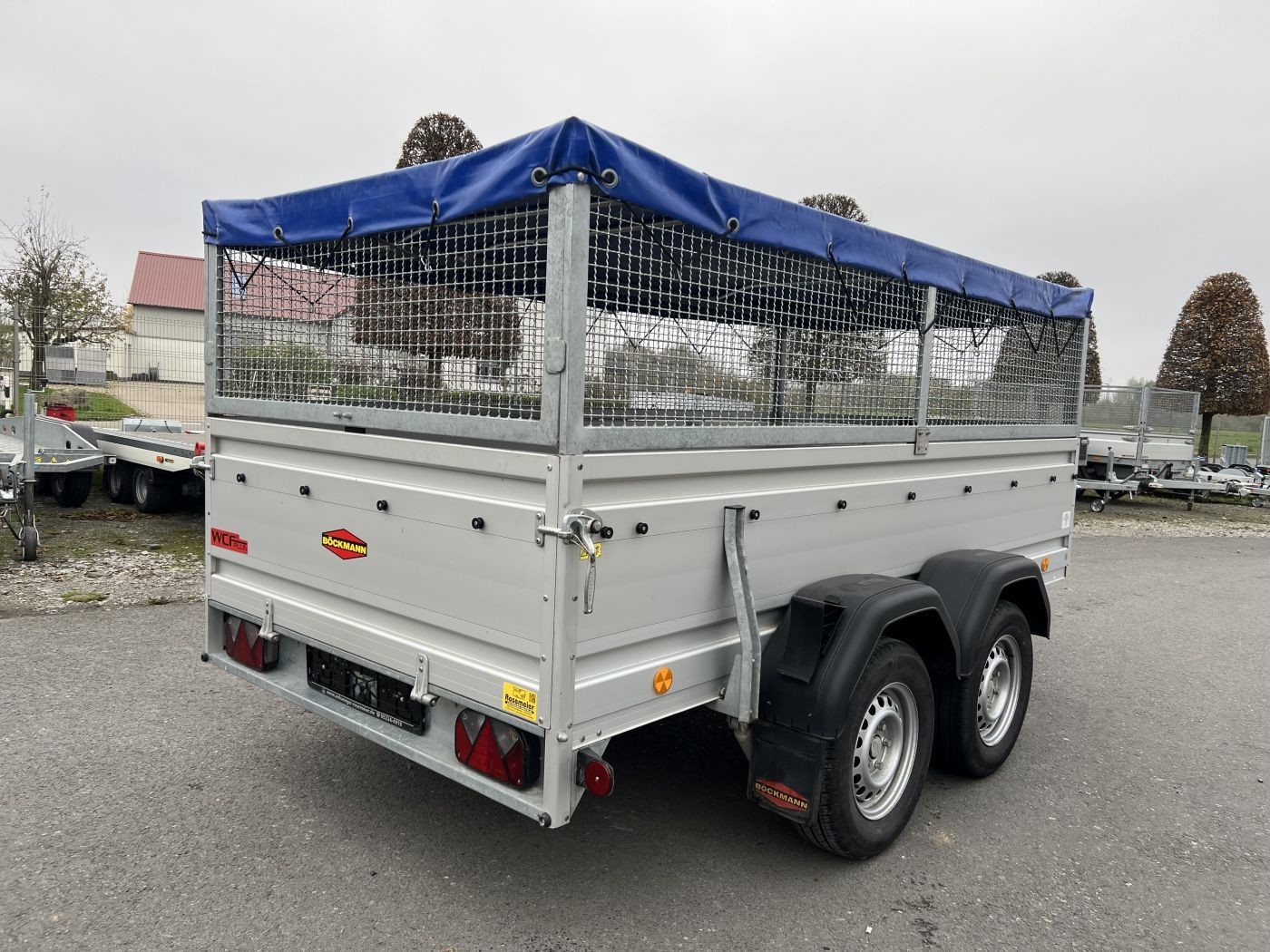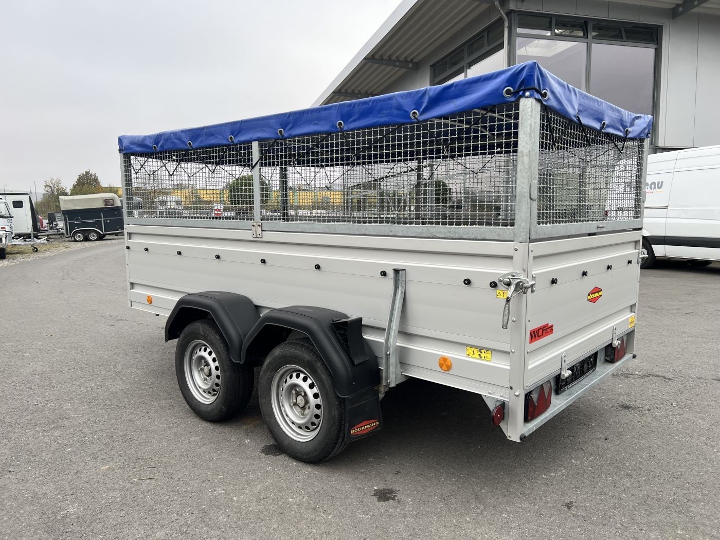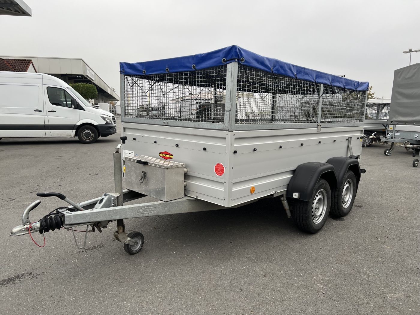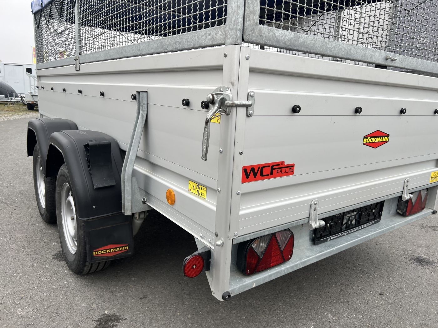Gebrauchter Böckmann Kastenanhänger mit WCF-Fahrwerk, Bordwanderhöhung, Gitteraufsatz und Flachplane