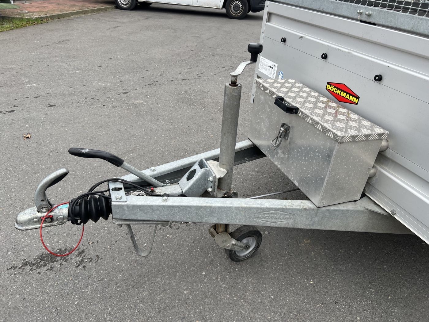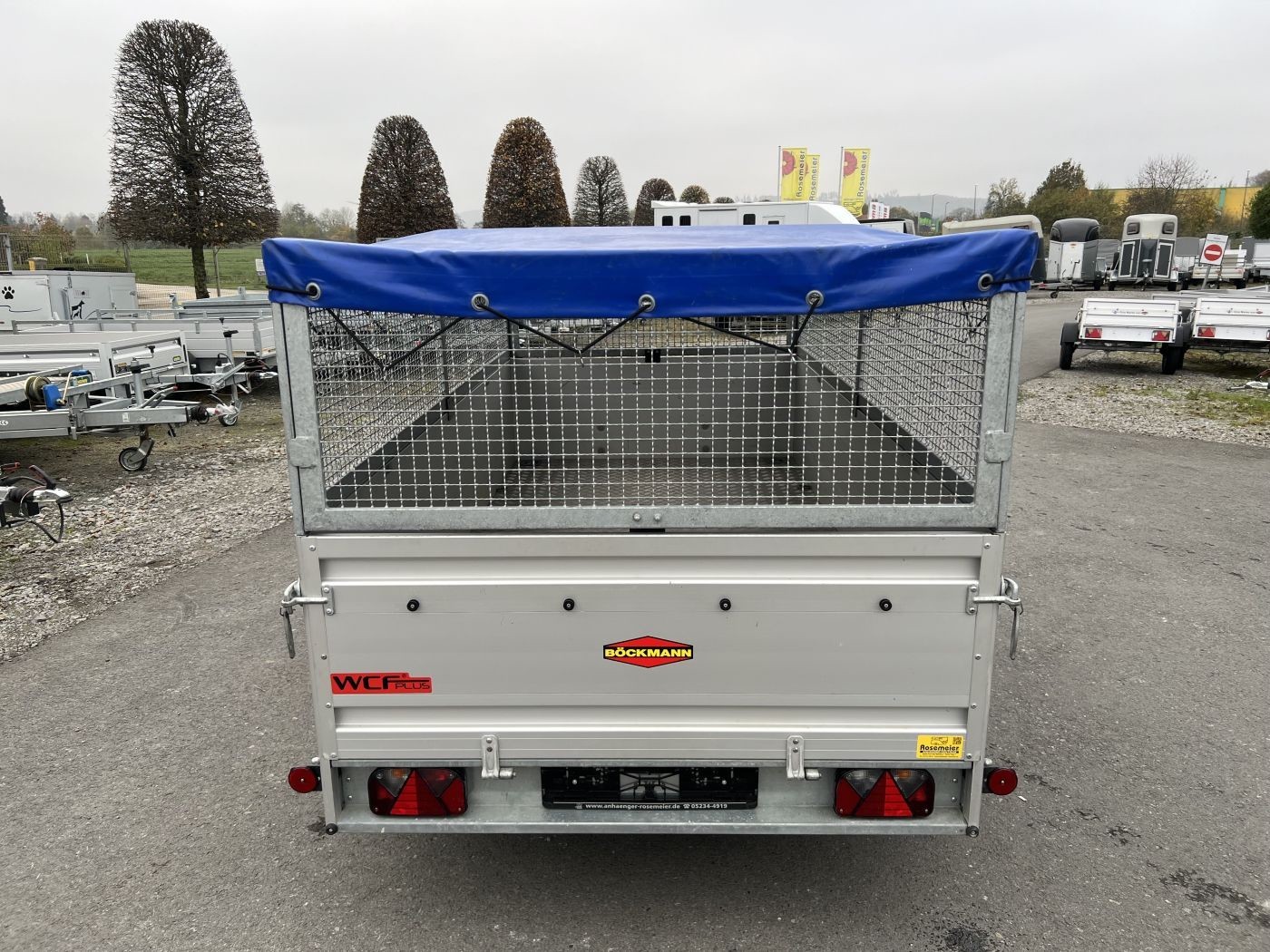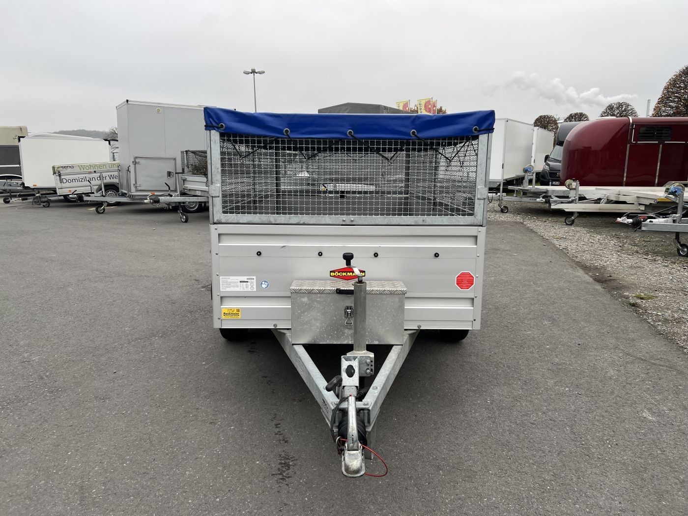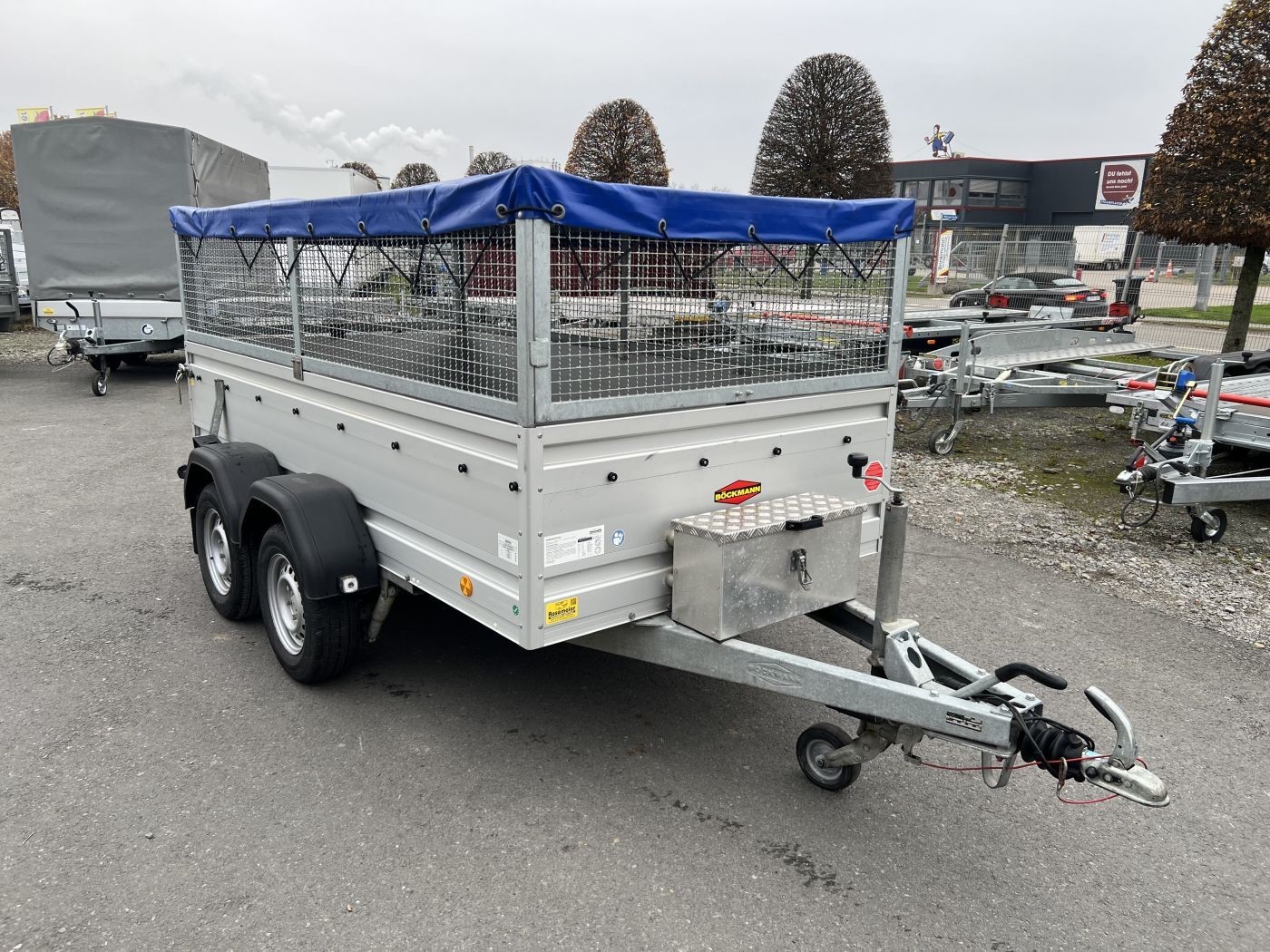 Gebrauchter Böckmann Kastenanhänger mit WCF-Fahrwerk, Bordwanderhöhung, Gitteraufsatz und Flachplane