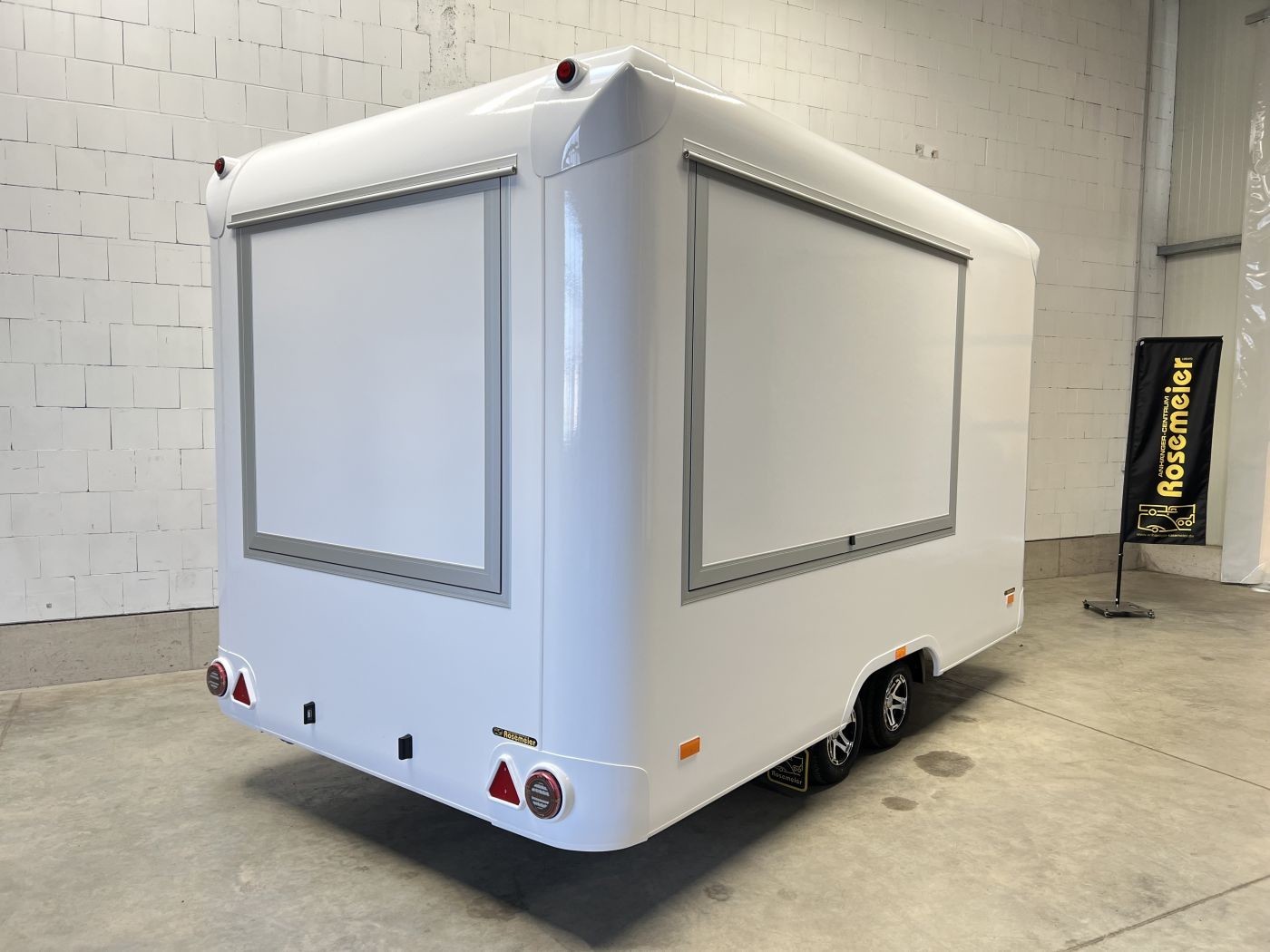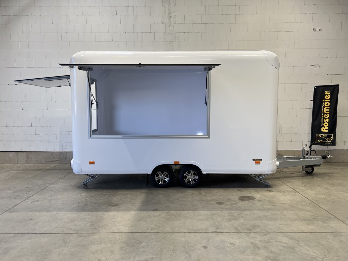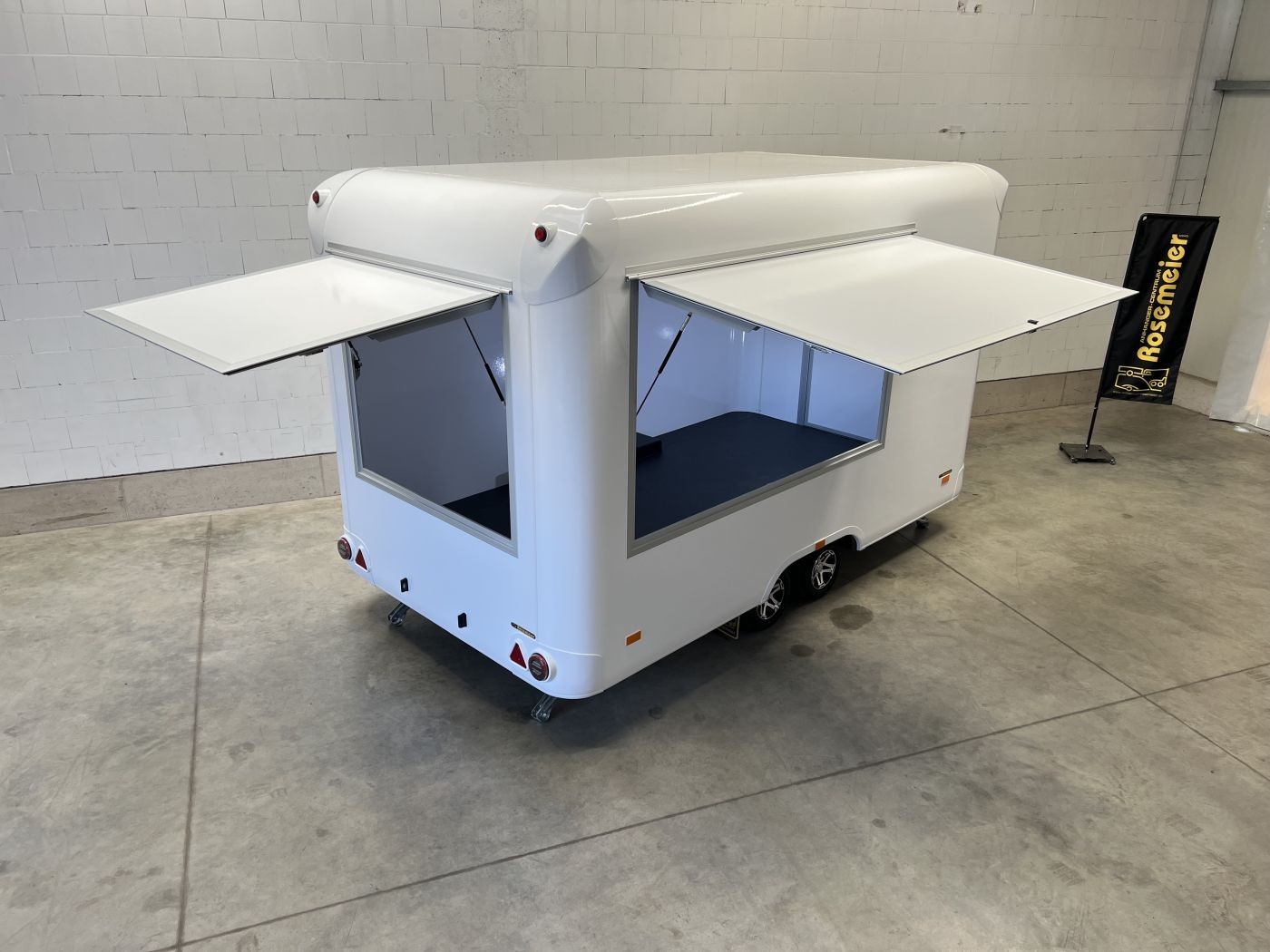 Entdecken Sie unseren exklusiven Foodtrailer mit zwei Verkaufsklappen die ideale Lösung für Veranstaltungen im Freien, Festivals, Konzerte, Messen und ähnliche Events.
