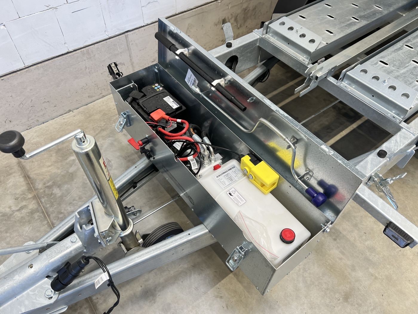 – Metallkiste zur geschützten Aufbewahrung von Batterie, Kabel, Pumpstange und weiterem Zubehör, auf der Deichsel verbaut