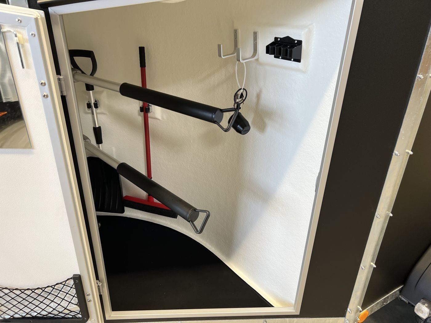 Abschließbare Sattelkammer: Ausgestattet mit ausziehbaren Sattelhaltern, Besen, Schaufel, Staunetz, Trensen- und Gertenhaltern