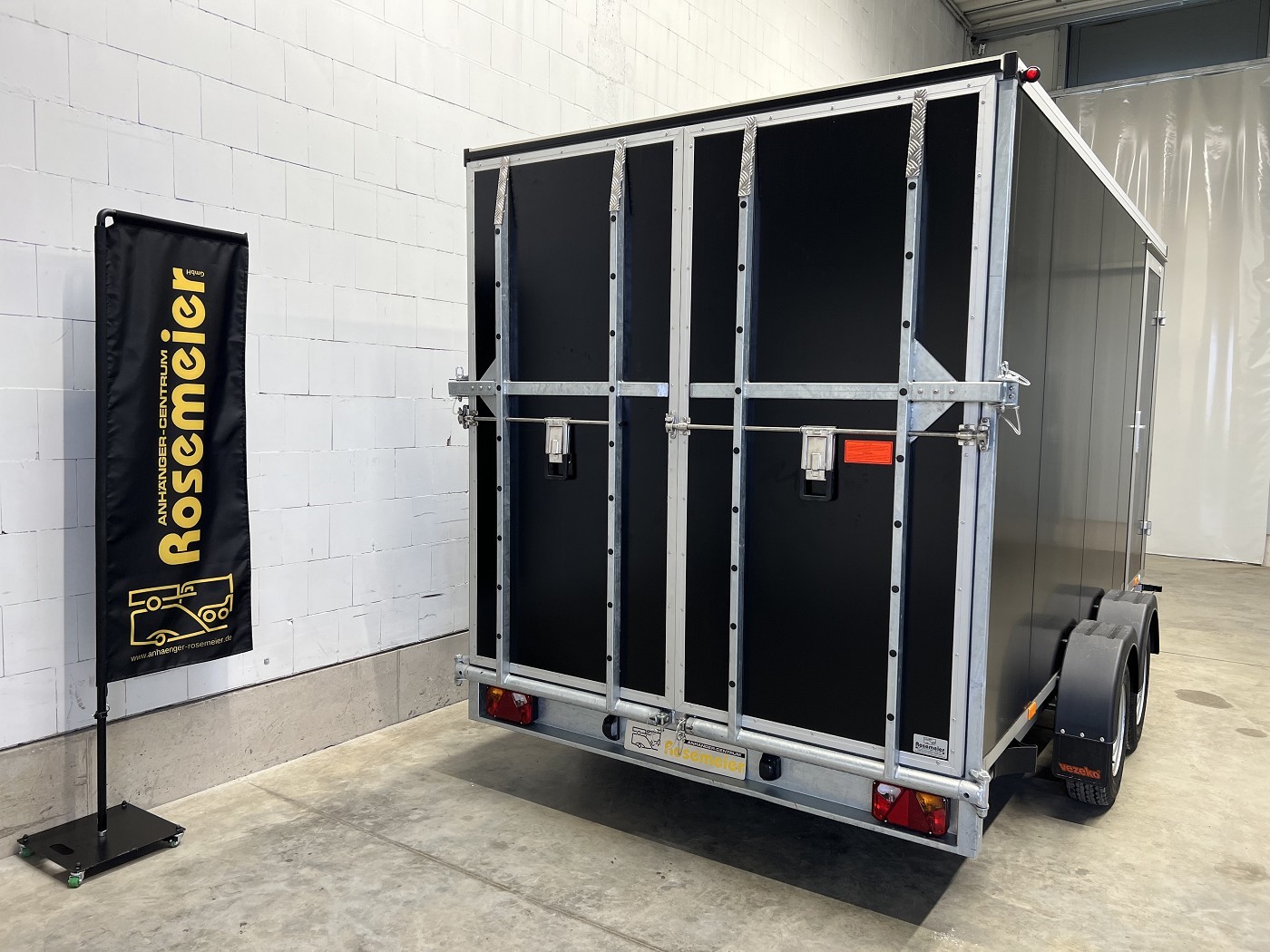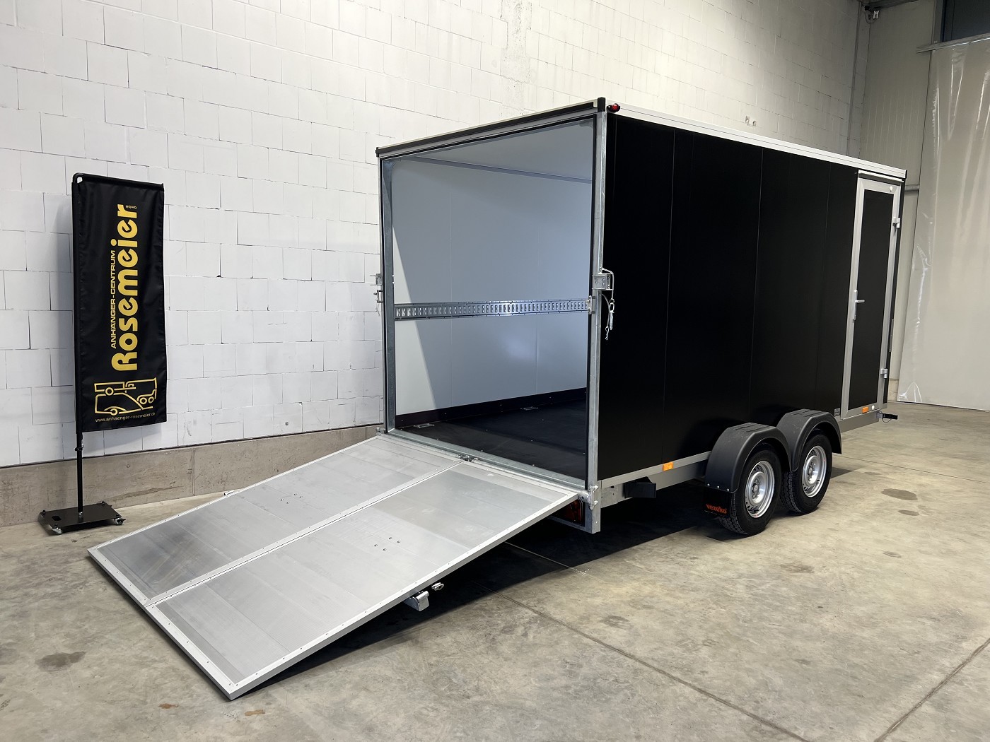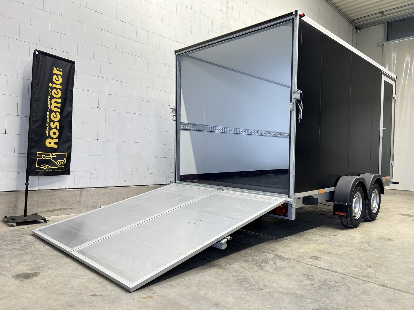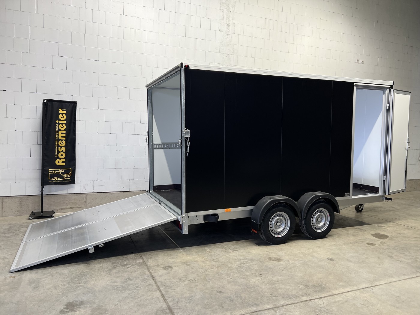 Kofferanhänger in schwarz mit Kombi-Auffahrrampe und Servicetür