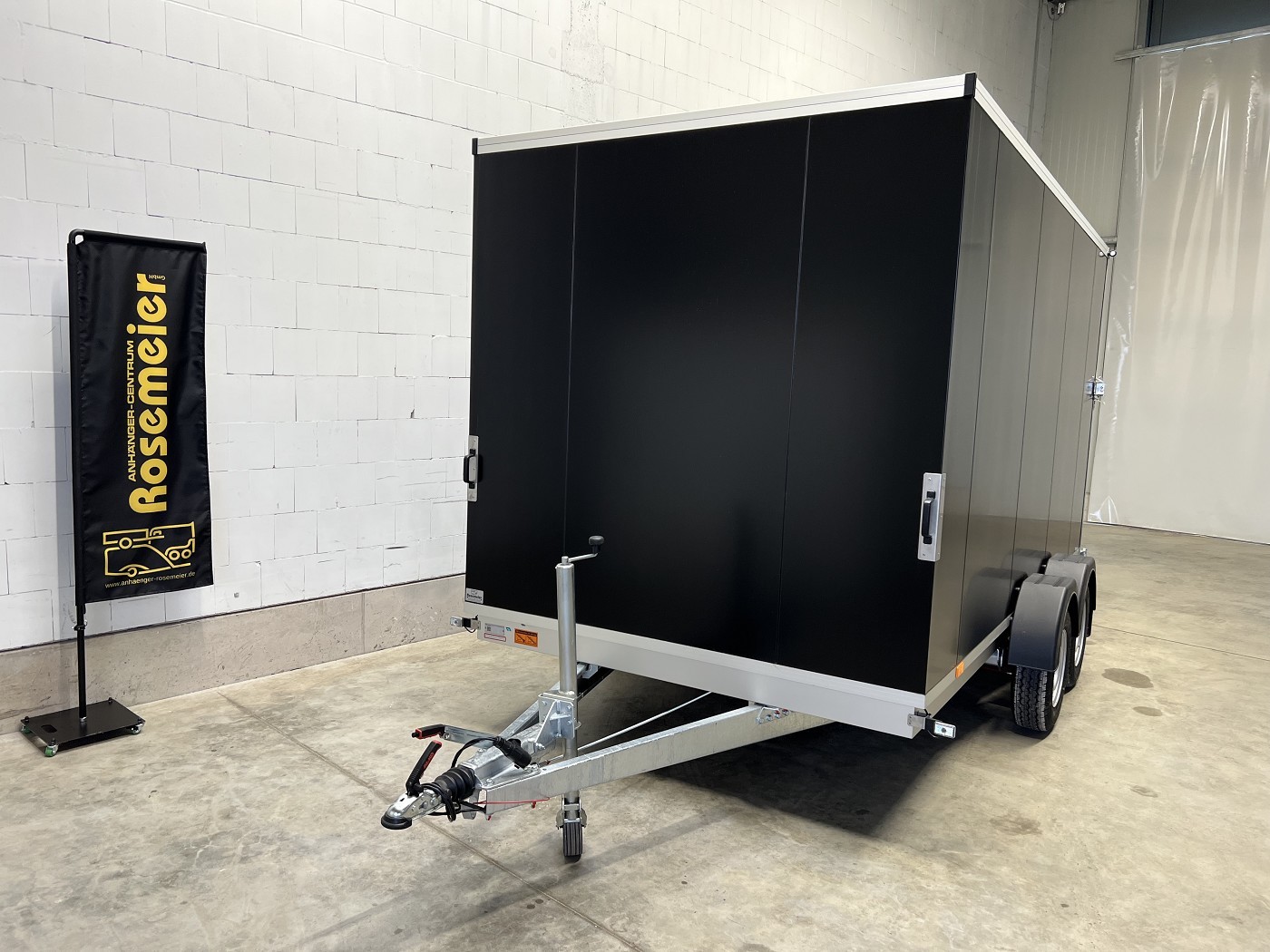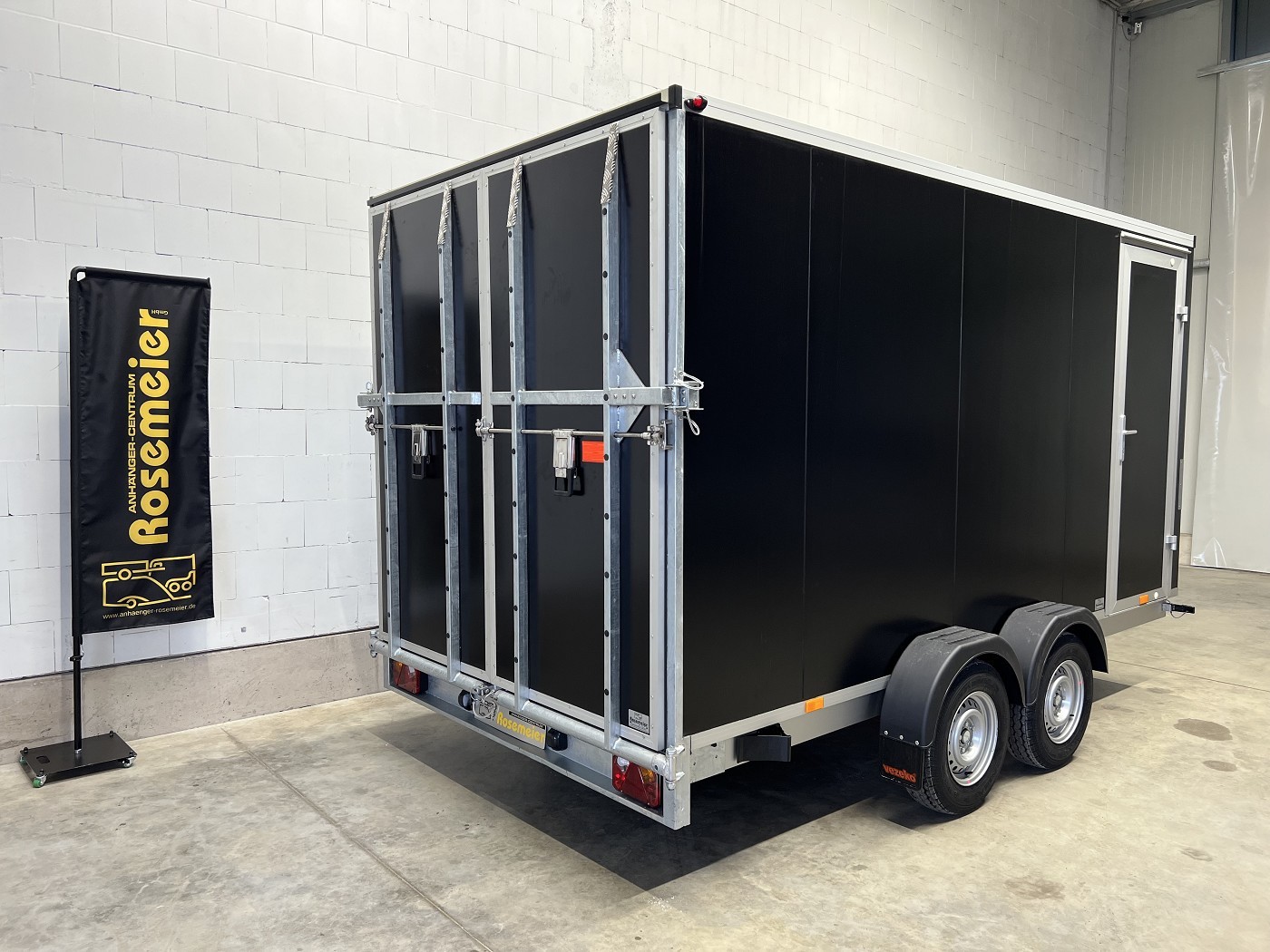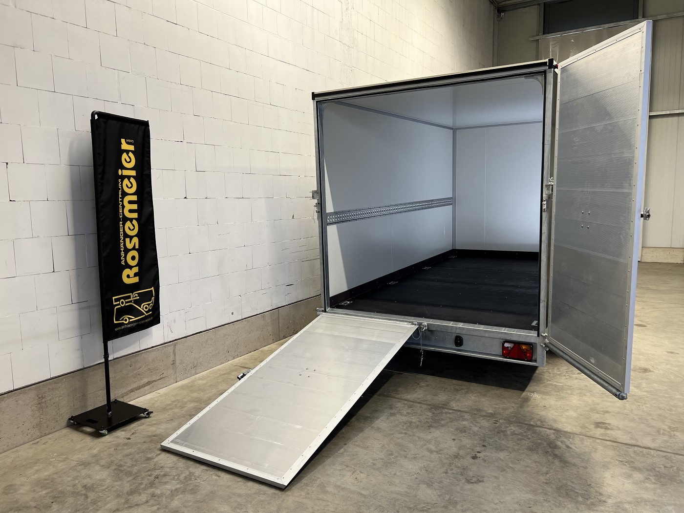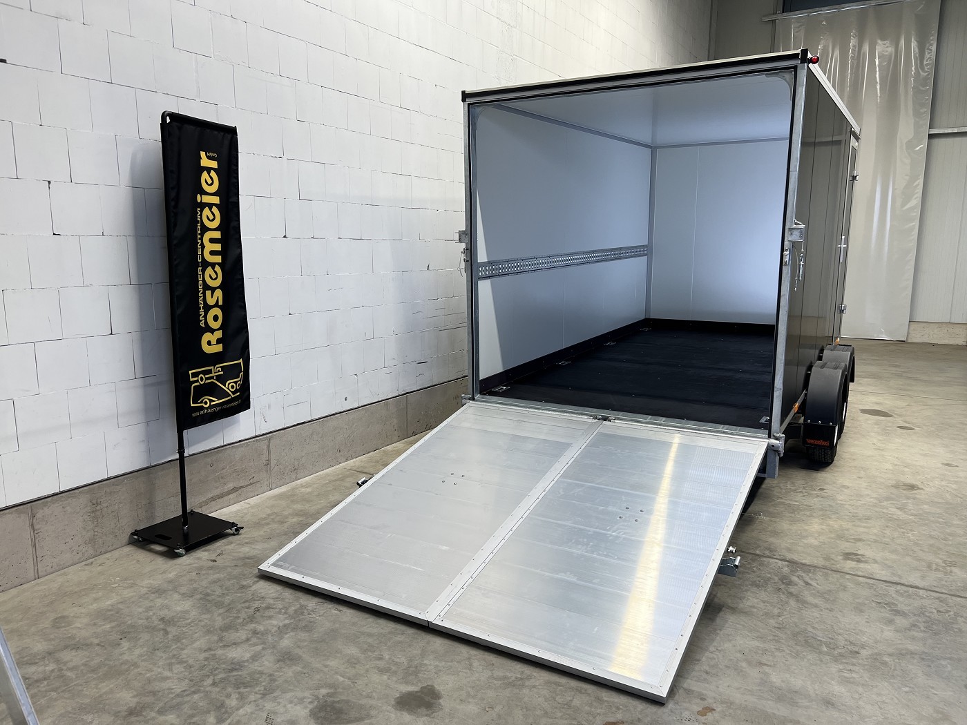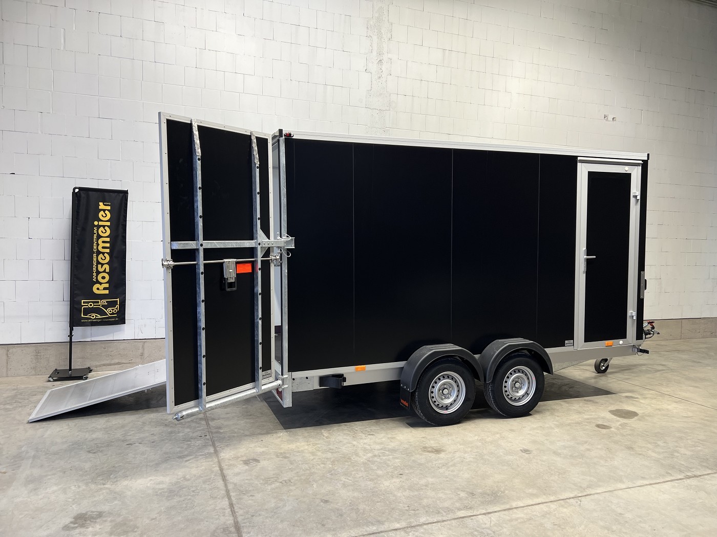 Kofferanhänger in schwarz mit Kombi-Auffahrrampe und Servicetür