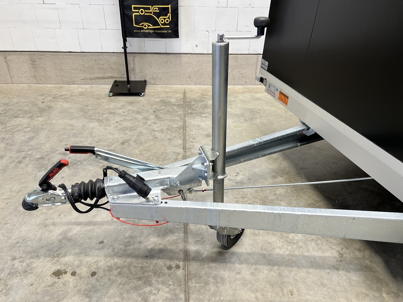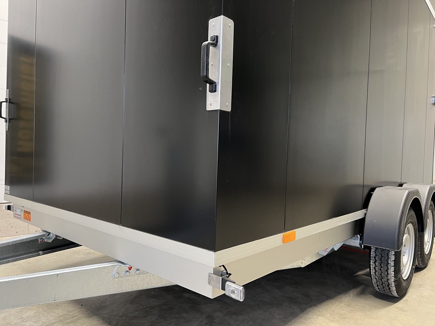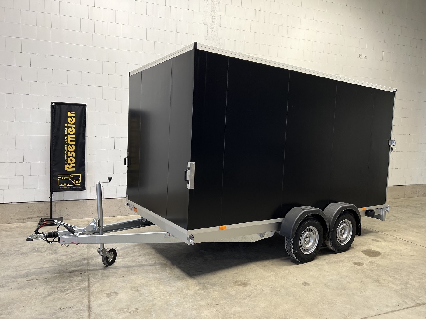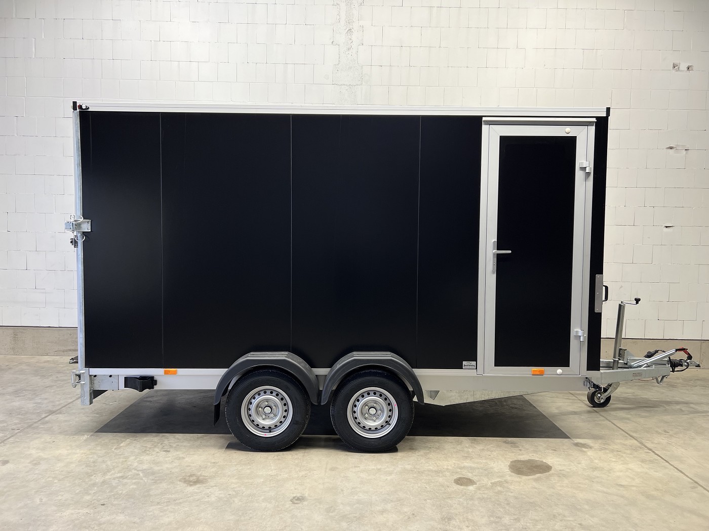 Kofferanhänger in schwarz mit Kombi-Auffahrrampe und Servicetür