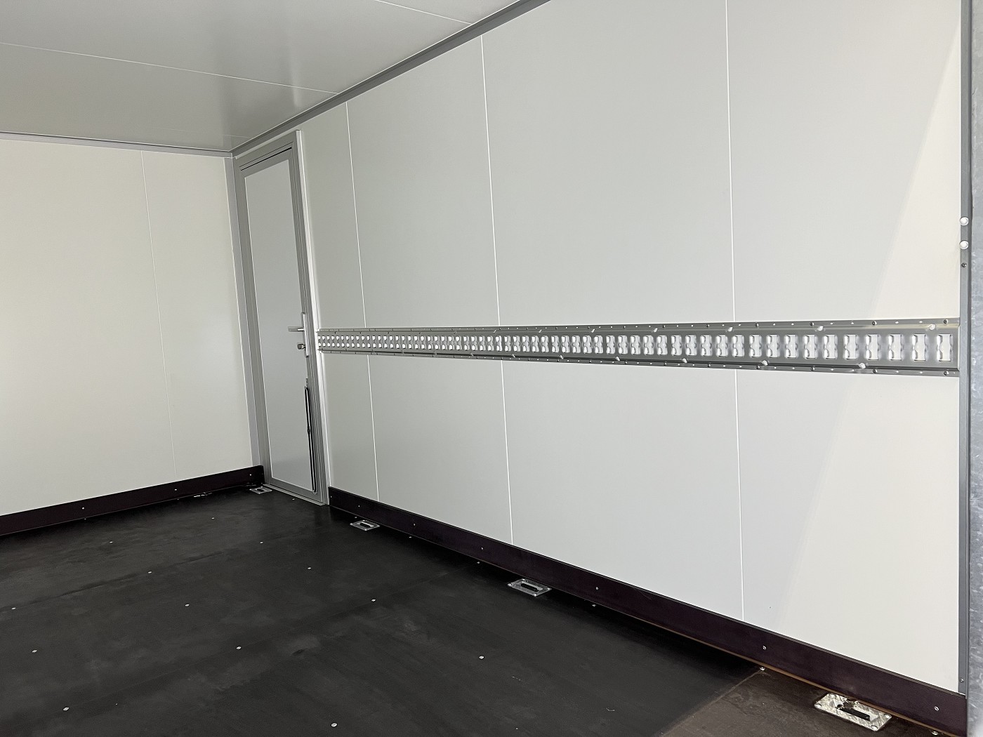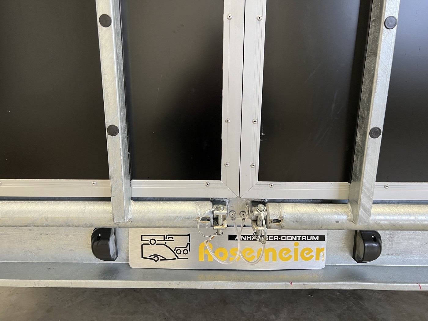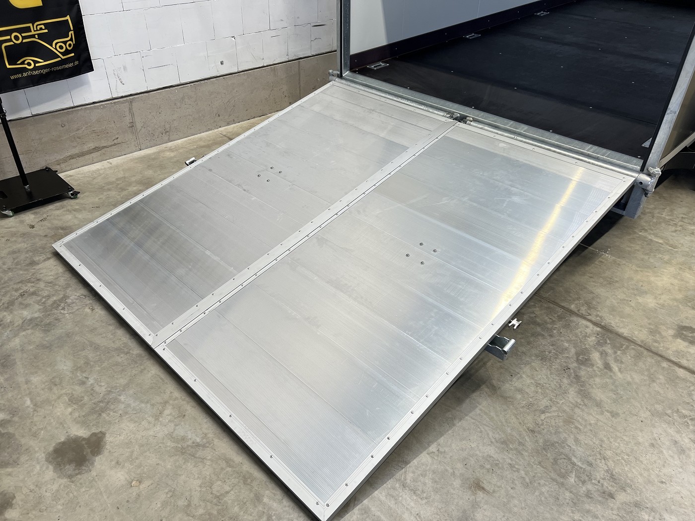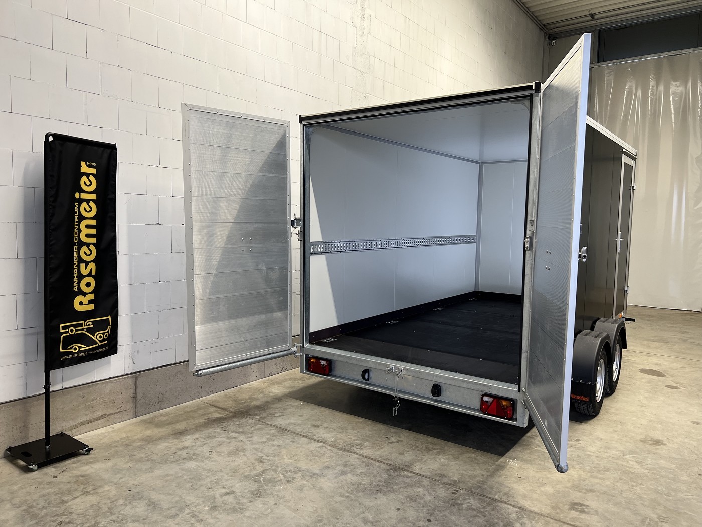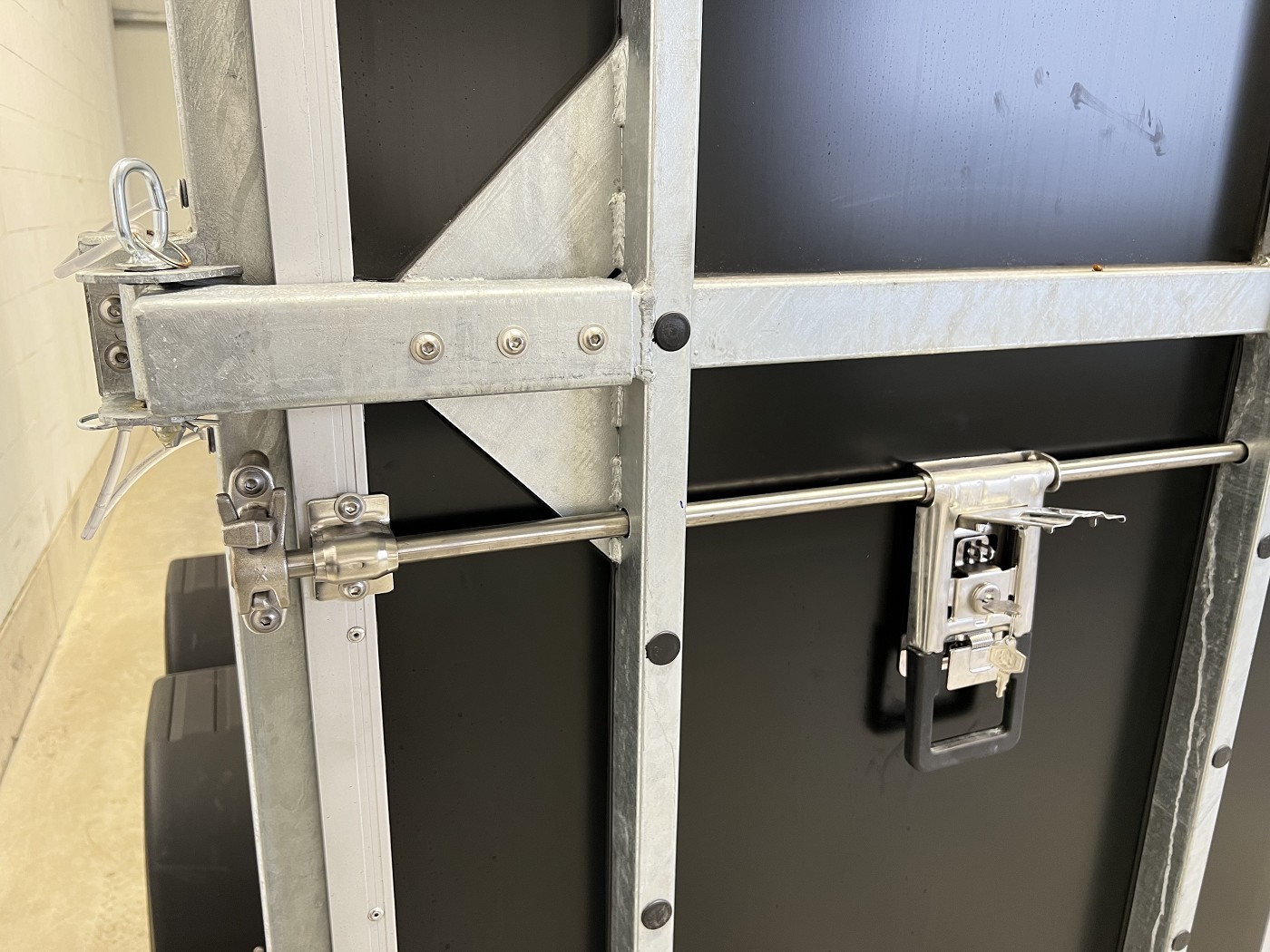 Kofferanhänger in schwarz mit Kombi-Auffahrrampe und Servicetür