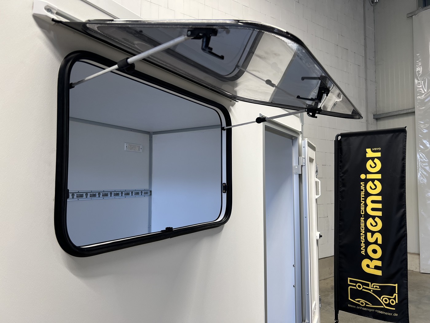 Kofferanhänger 1-Achser mit Doppelflügeltür, Seitentür und einem Fenster seitlich