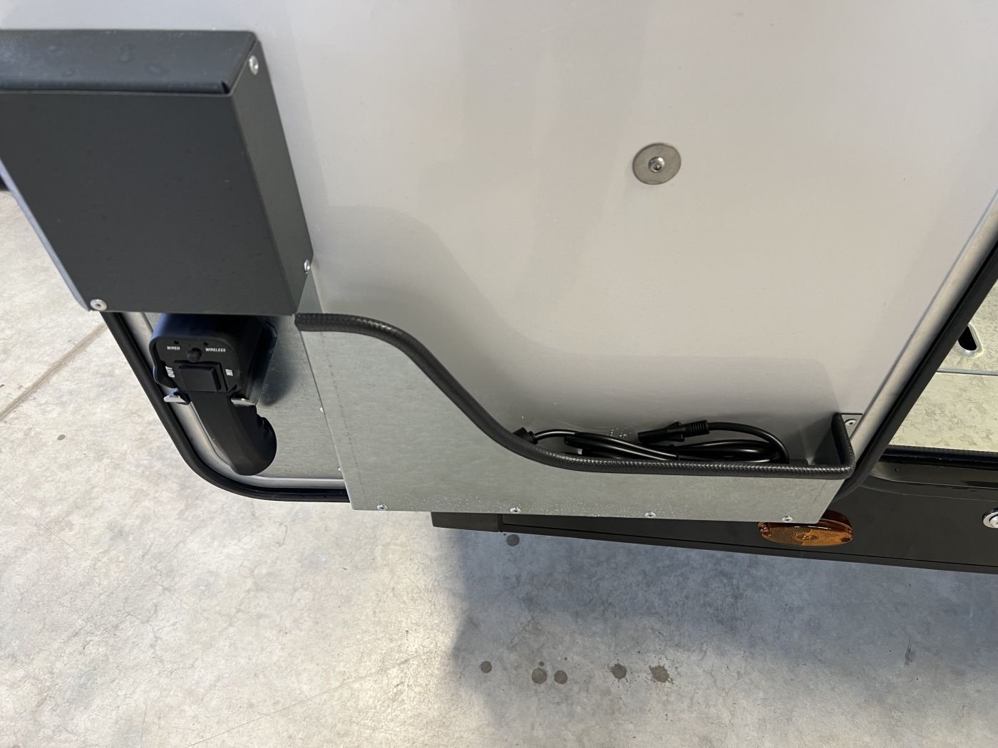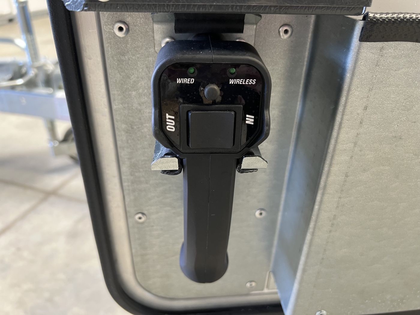 Die Bordbatterie und die Steuerung des Anhängers befinden sich in einem wasserdichten Gehäuse mit Schaltern, Batteriestandsanzeige und Anschlüssen für Seilwinde und Kippfunktion.