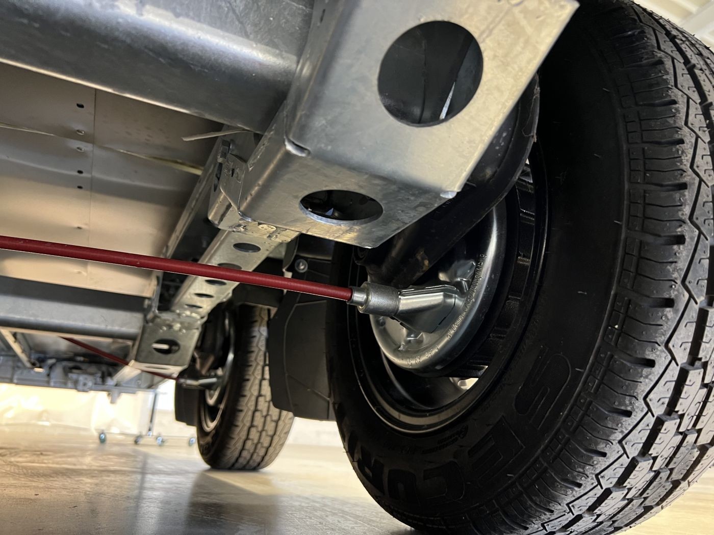 Die Batterie wird während der Fahrt über das Zugfahrzeug geladen und kann zusätzlich über ein mitgeliefertes Ladegerät an der Steckdose geladen werden