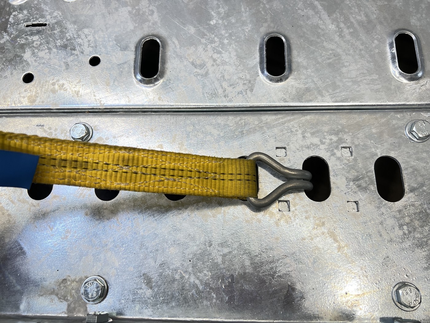 • Die vorderen Keile sind verstellbar und bilden die Basis der formschlüssigen Ladungssicherung. Jede Kette wird durch einen bis zu 10 t. belastbaren 75 mm breiten Gurt (gelb) fixiert. Geschützt werden die Gurte durch eine hochbelastbare Ummantelung (blau). Zertifiziert vom TÜV Nord