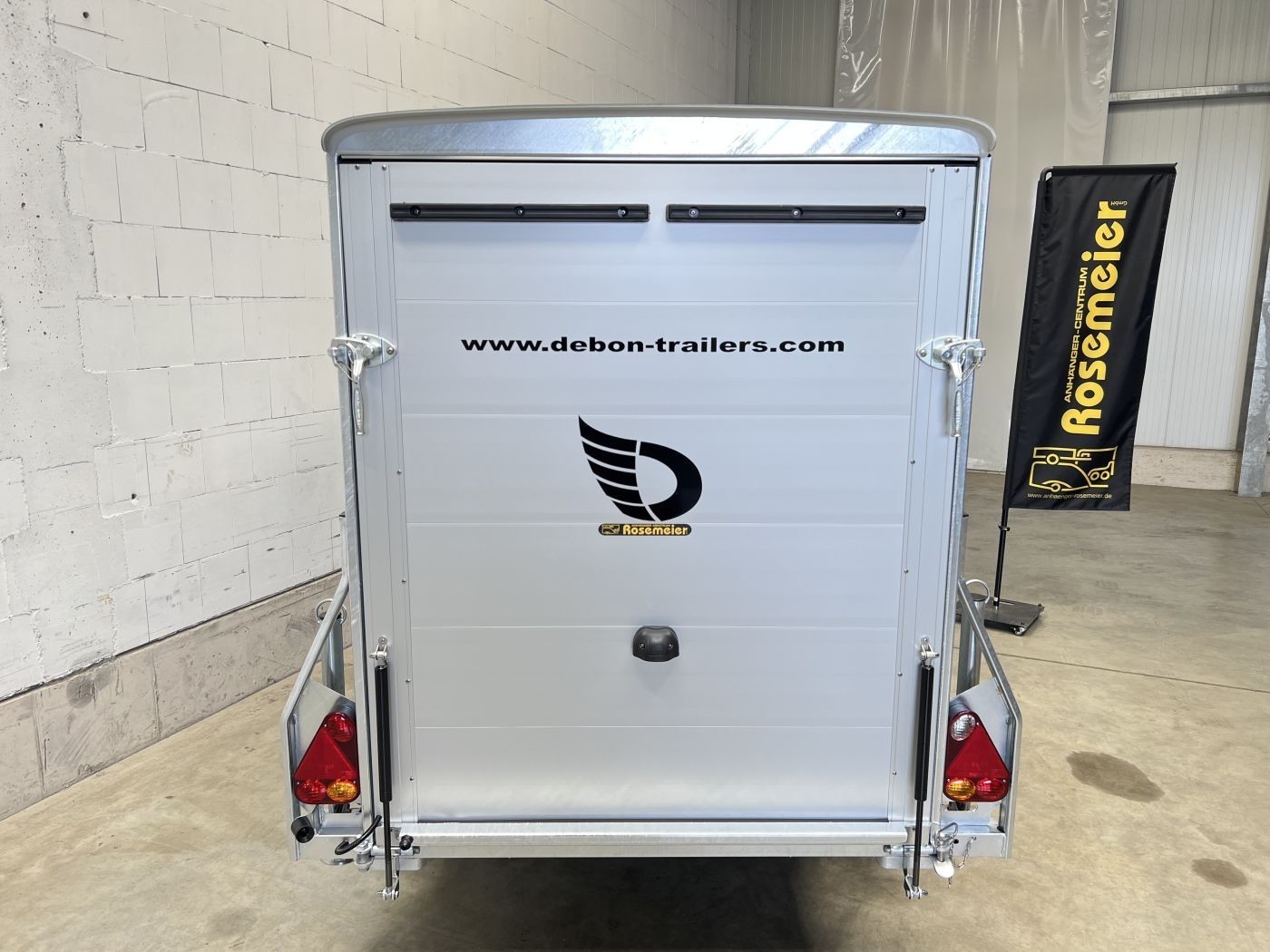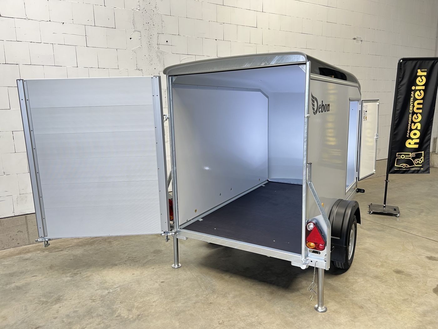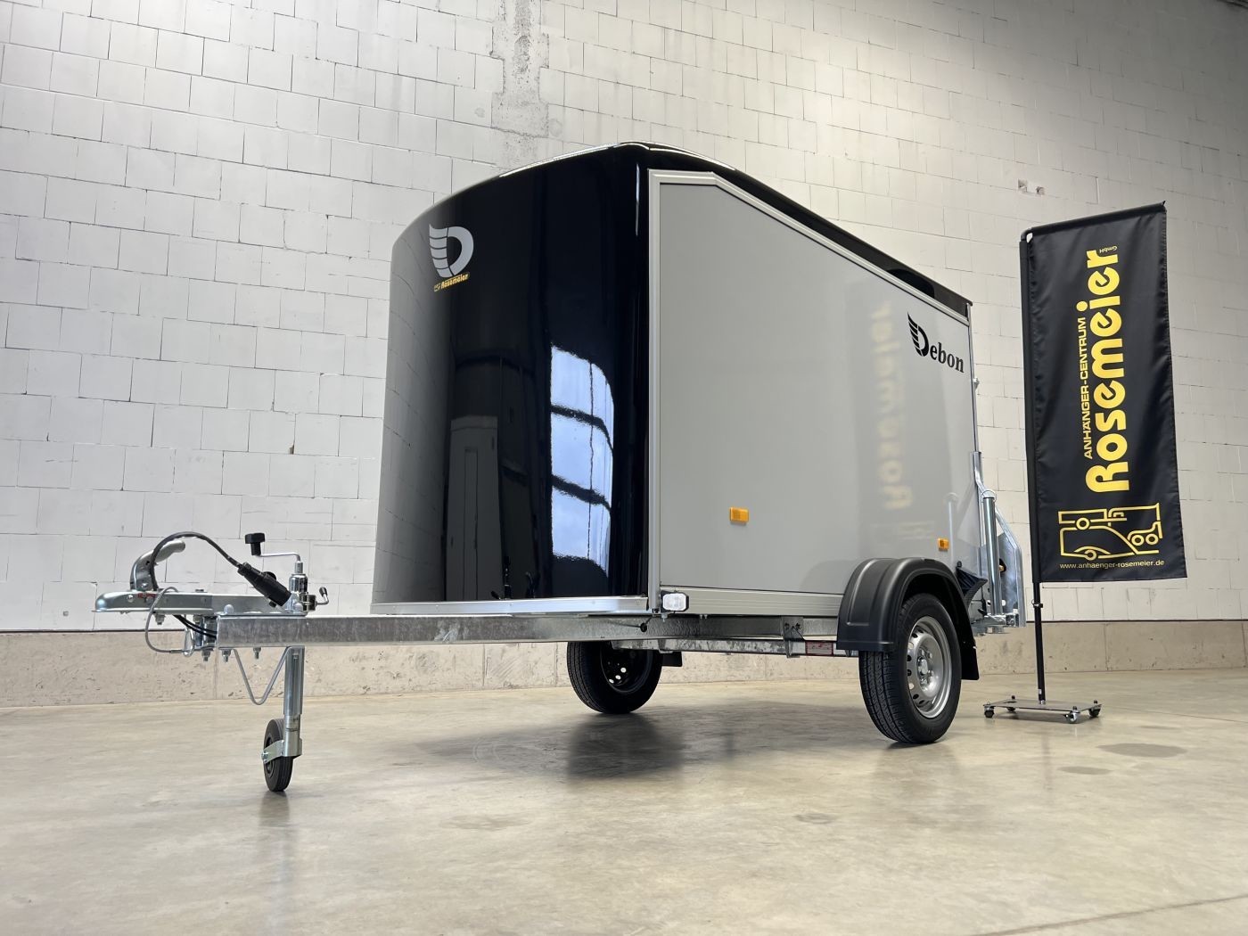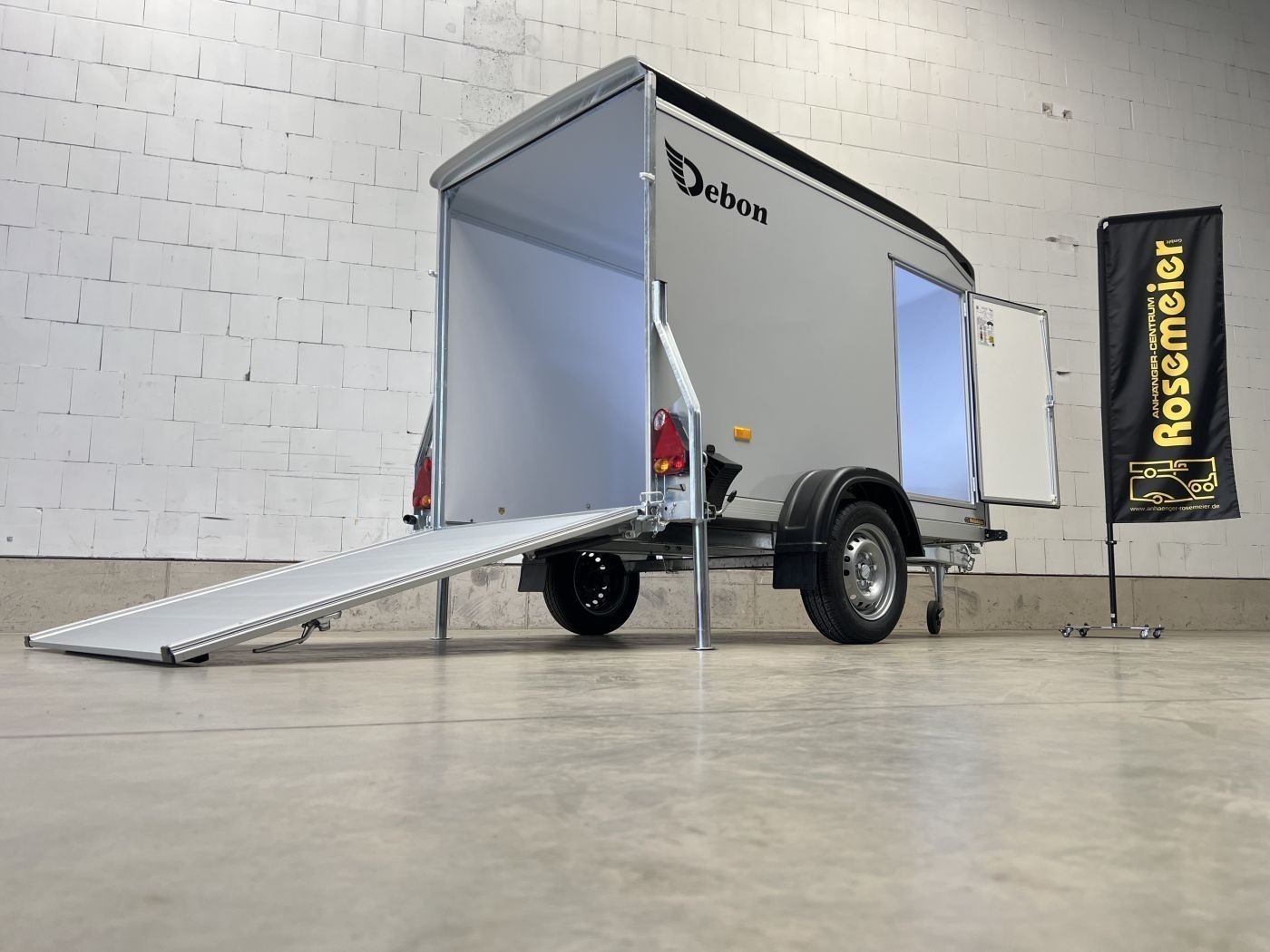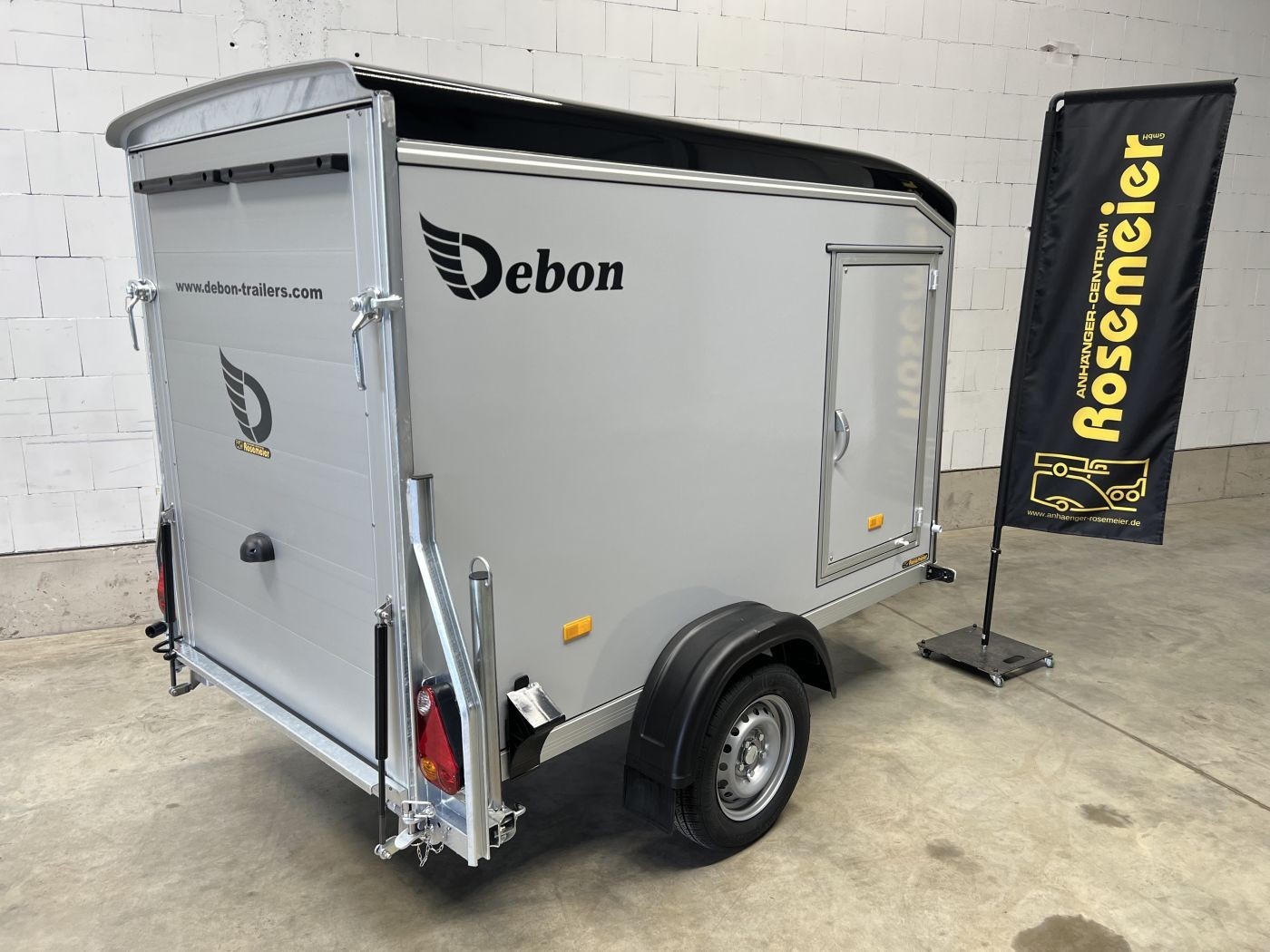 Debon Kofferanhänger mit Plywoodwänden, aerodynamischer Polyesterhaube und Seitentür