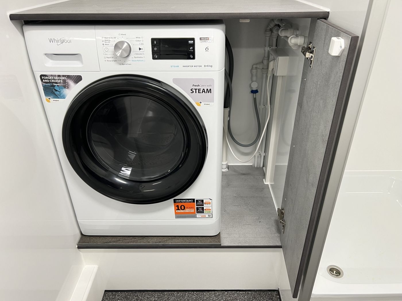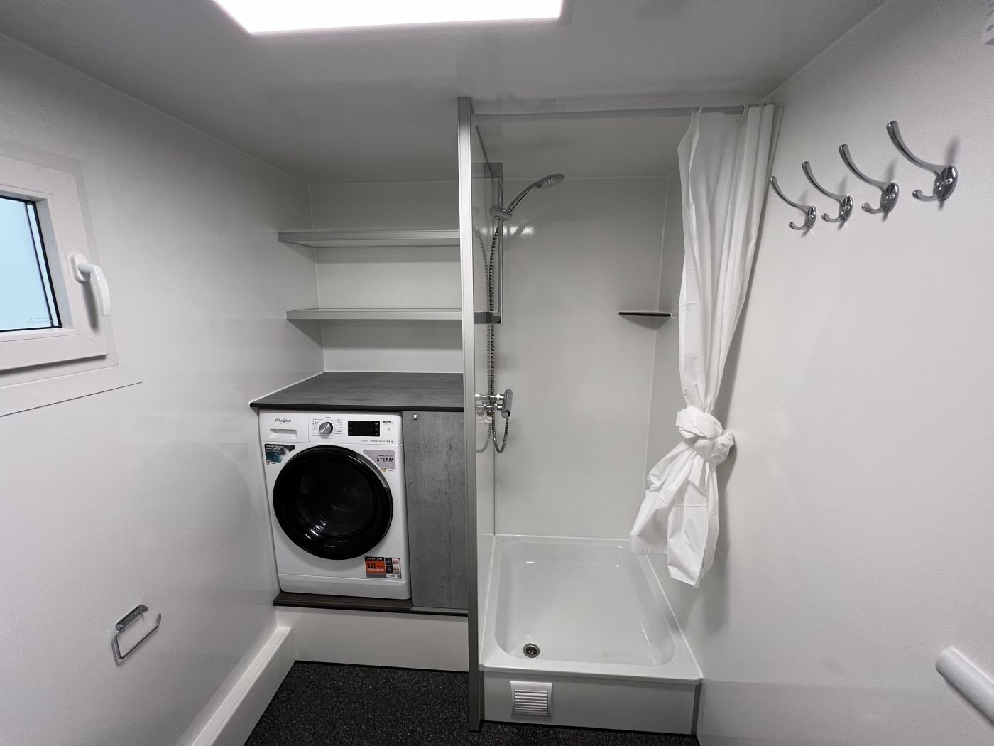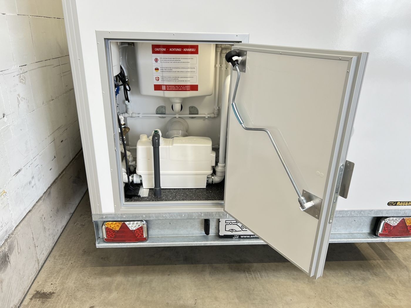 Vollwertiges mobiles Badezimmer – unser Badanhänger mit Toilette, Waschmaschine und Trockner (Waschtrockner)