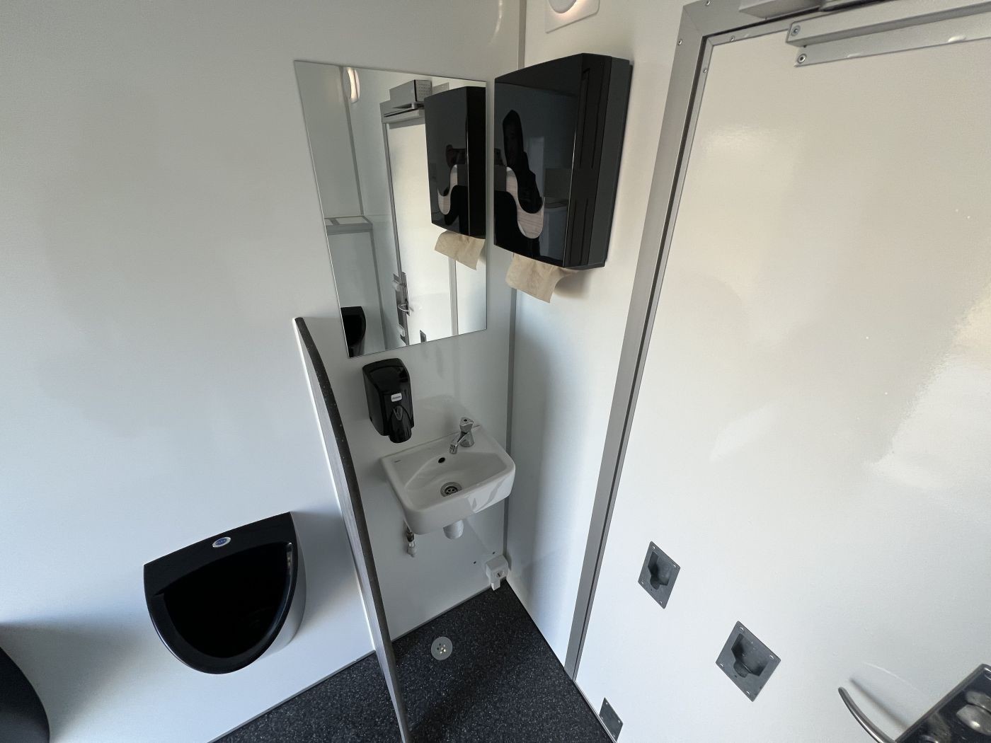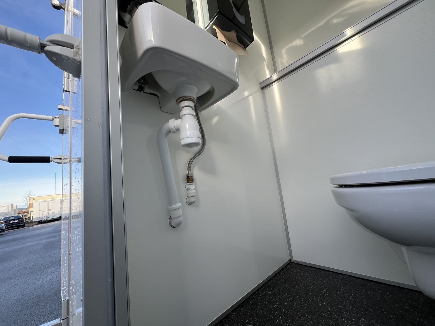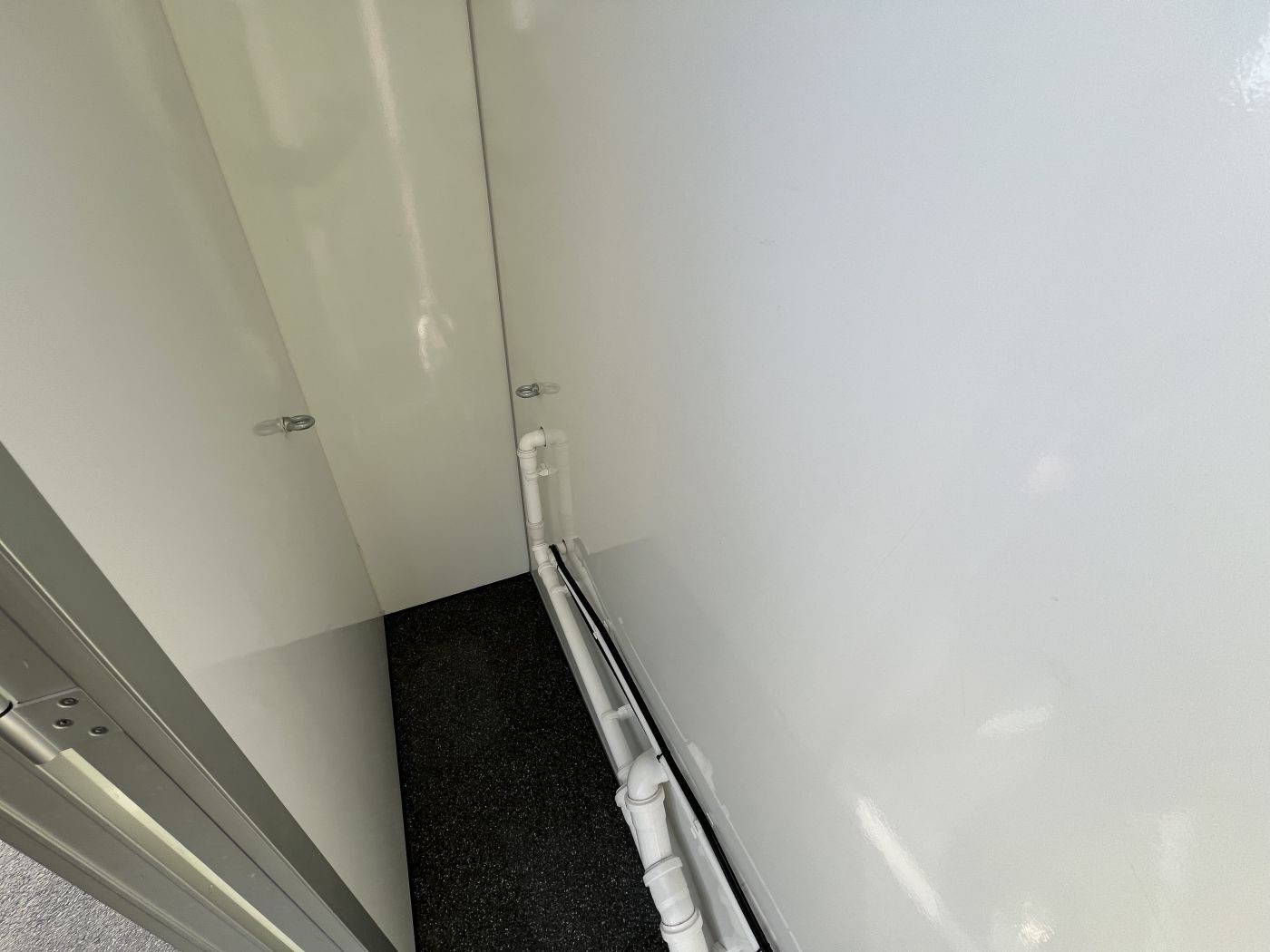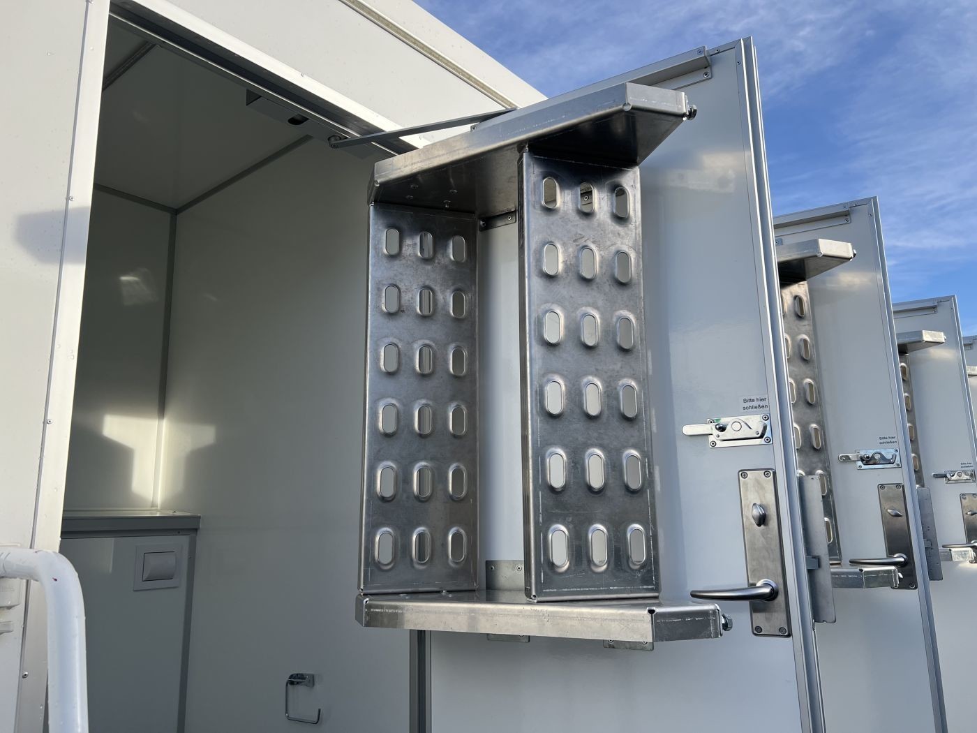 Einhängbare Stufen mit verstellbaren Stützfüßen vor den Eingangstüren zu den WC Kabinen und zum Urinal-Raum