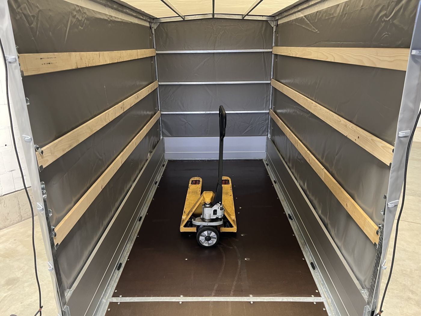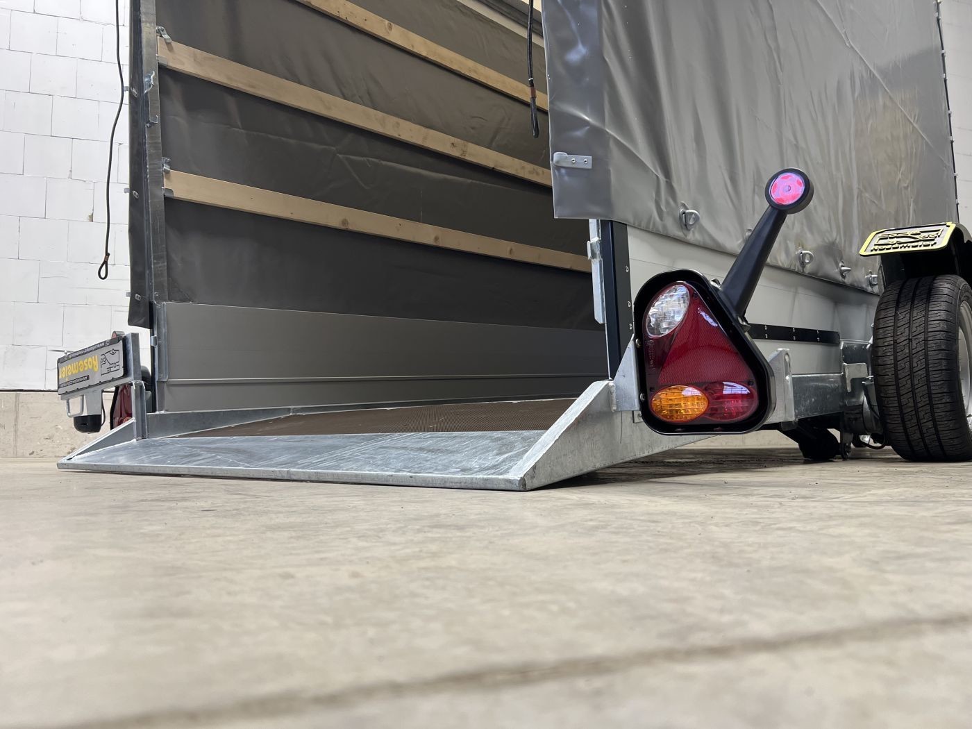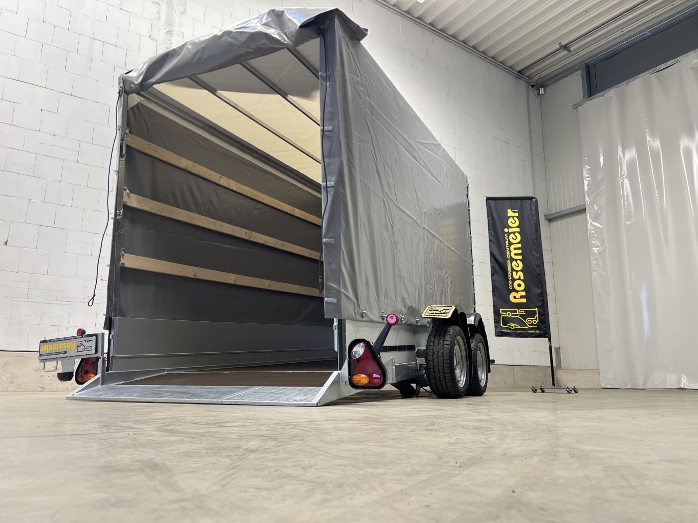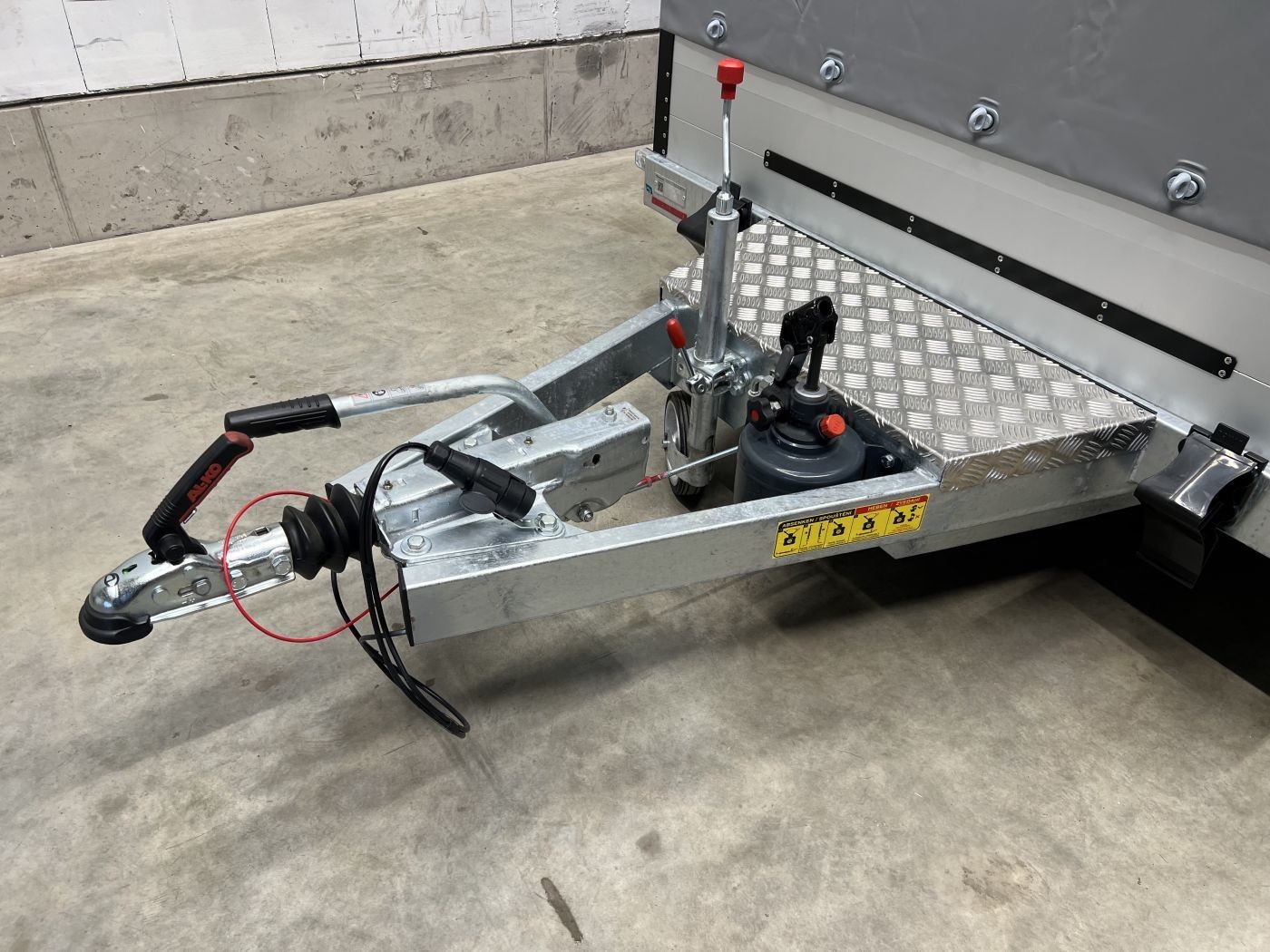 Absenkbarer Universaltransporter mit Plane ideal zum Transportieren von Scherenbühnen, Motorrädern und anderen Fahrzeugen.